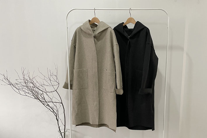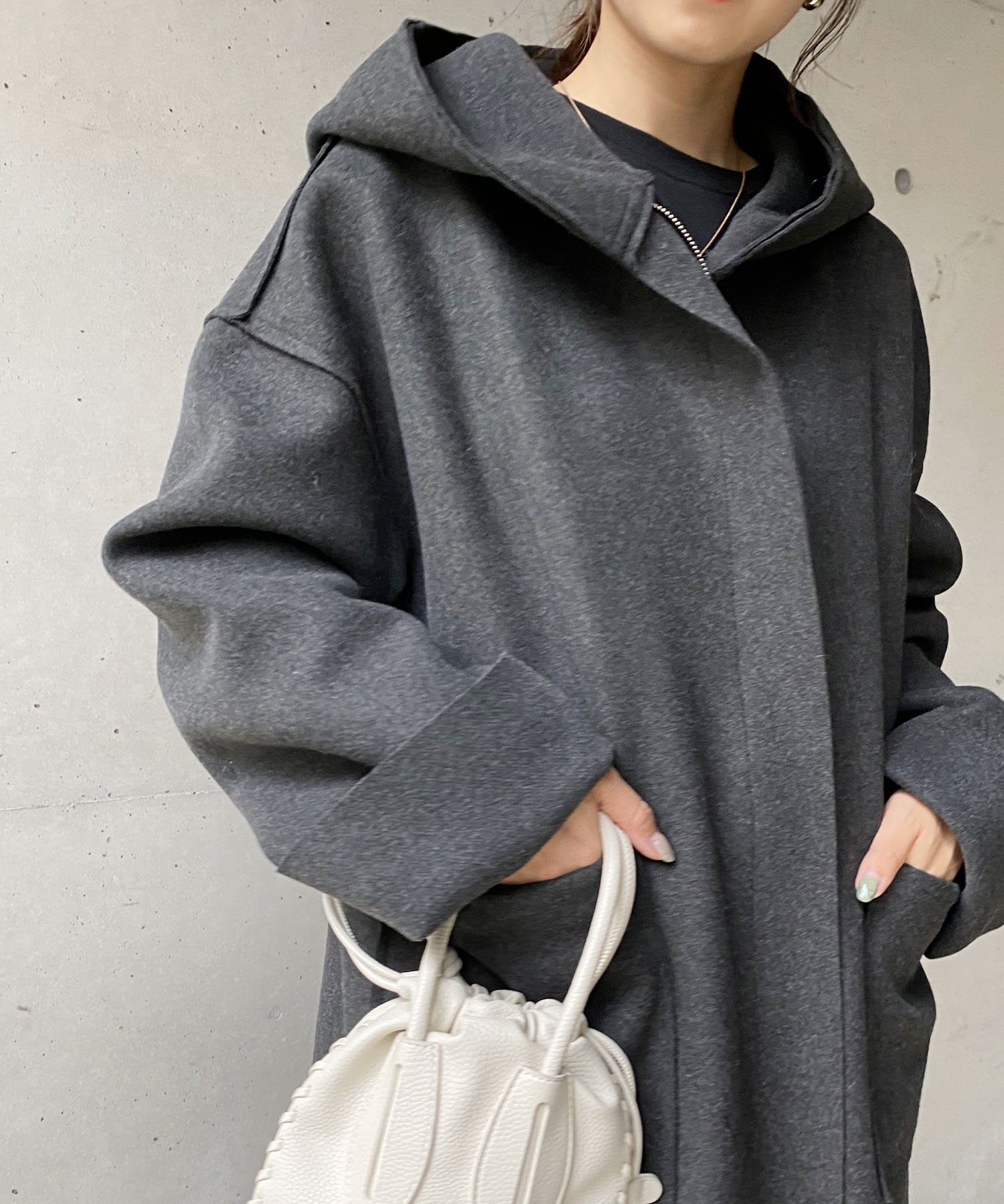 表面は圧縮ウール、裏面はボンディング素材のフード付きコート。