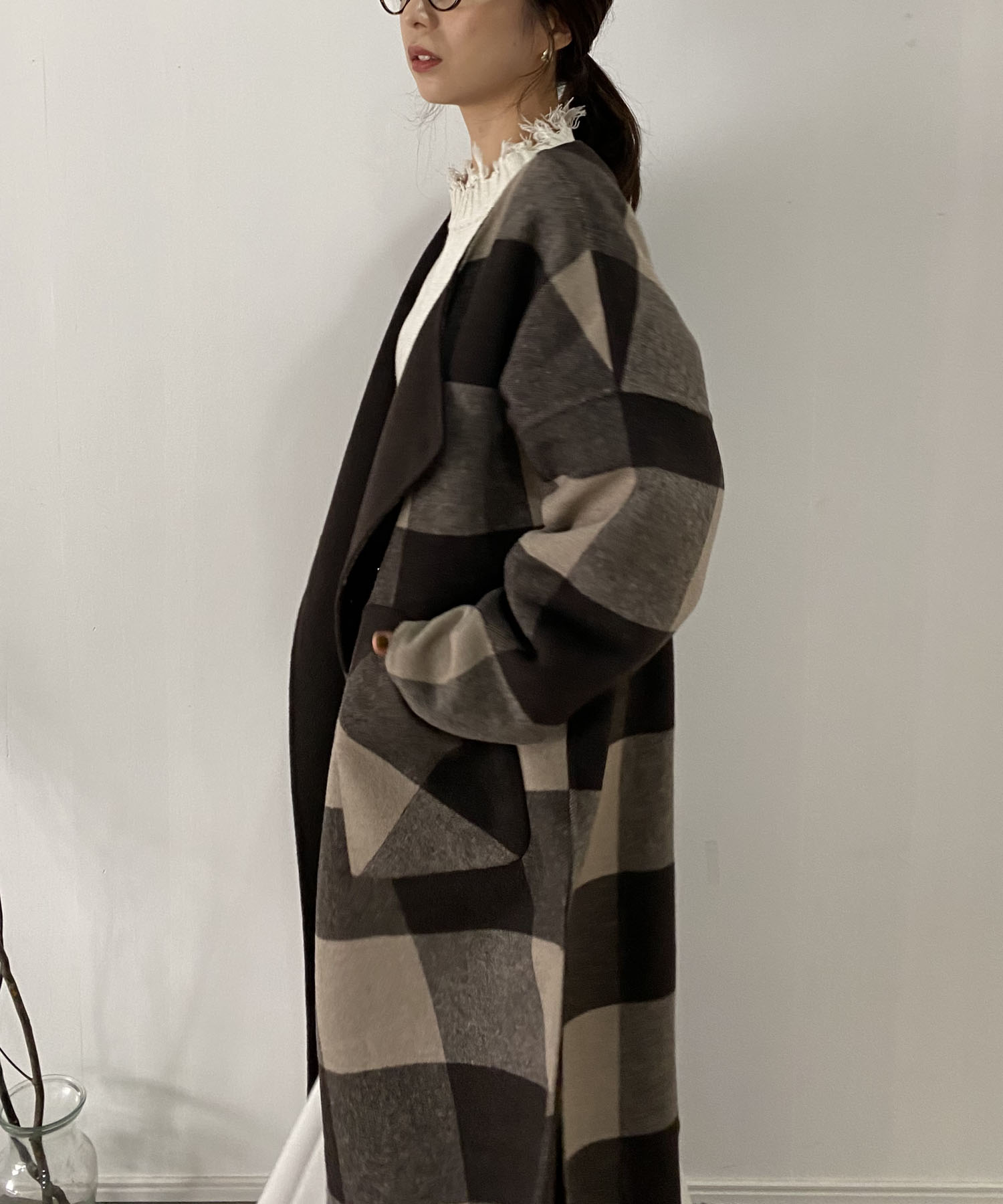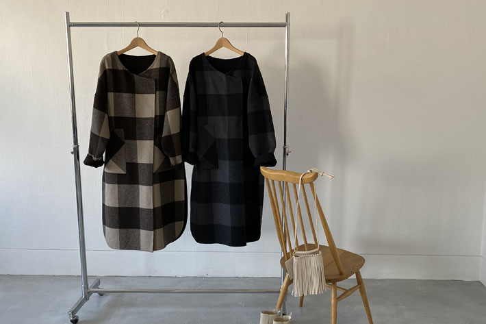 チェックと無地の2WAYで着られるノーカラーコート。