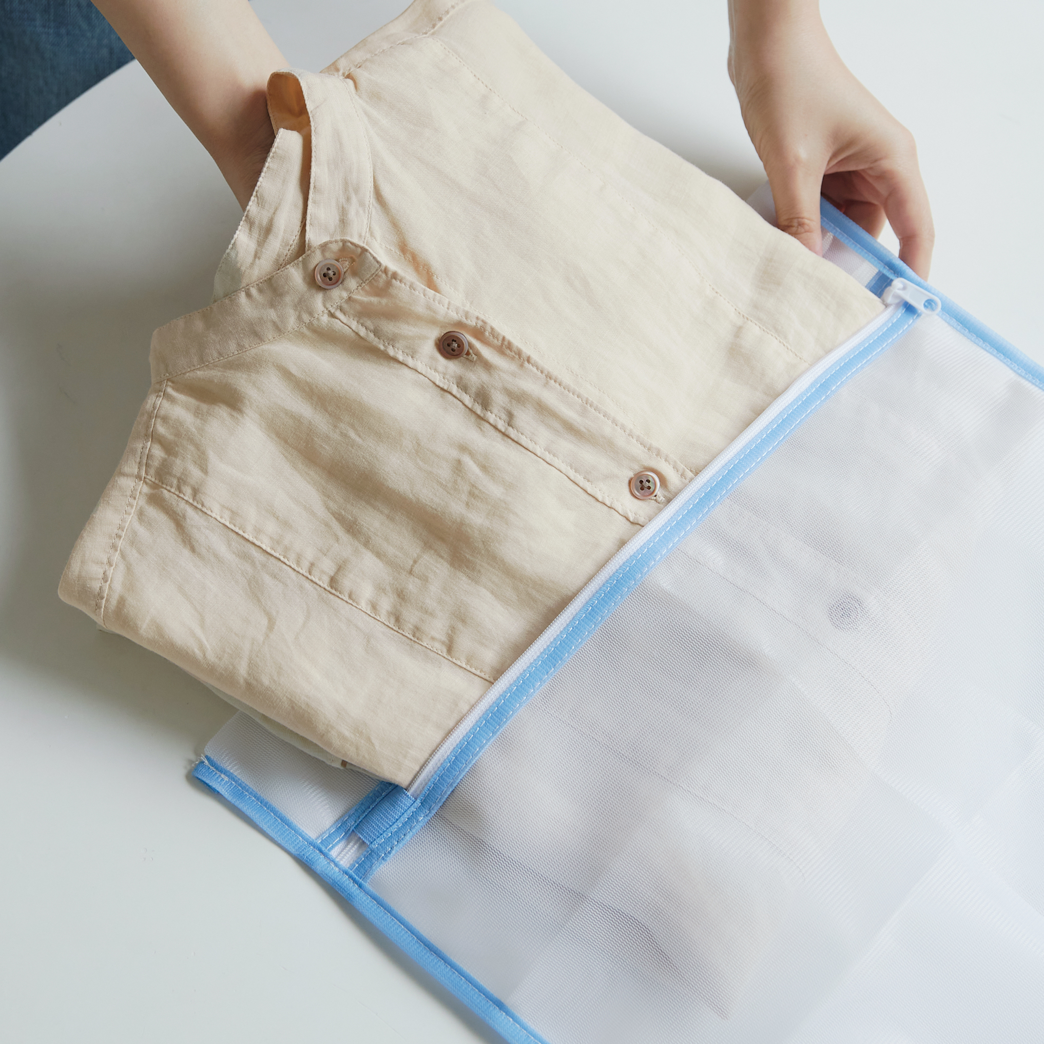 1摩擦に弱く、色移りや色落ちをしやすいため、洗濯機使用のときは必ずネットに入れましょう。ナチュラルなシワ感を好む場合は、畳まずクシャっとした状態での洗濯がおすすめです。