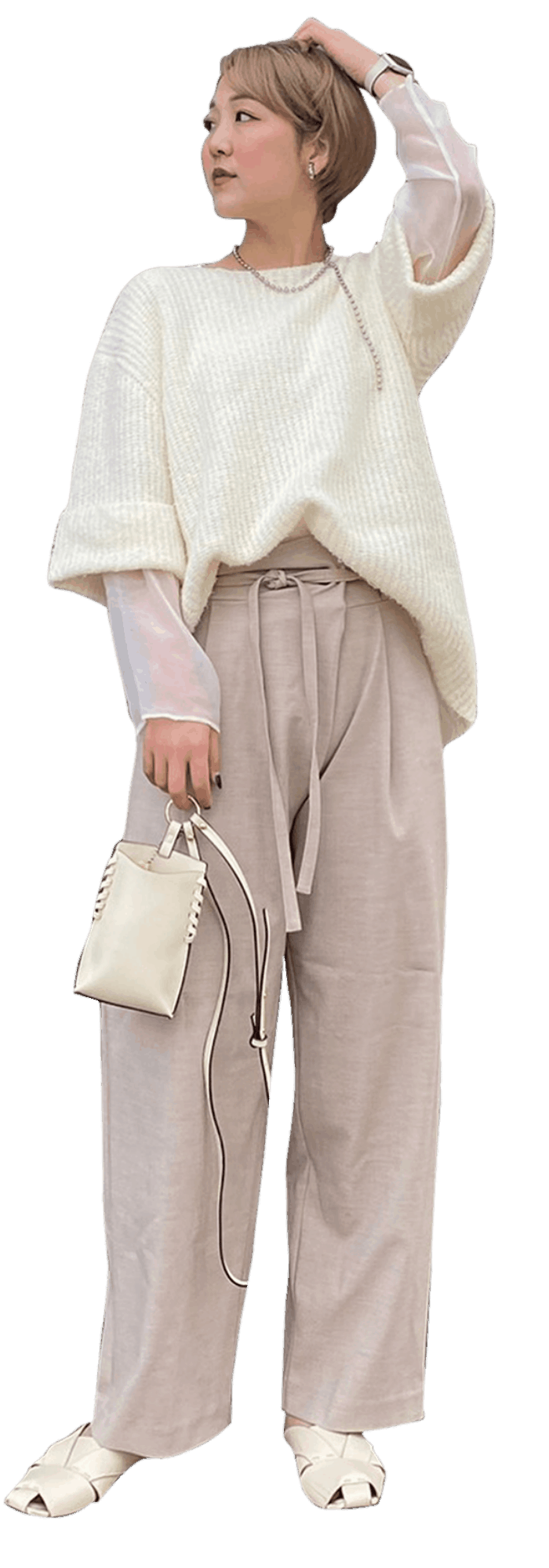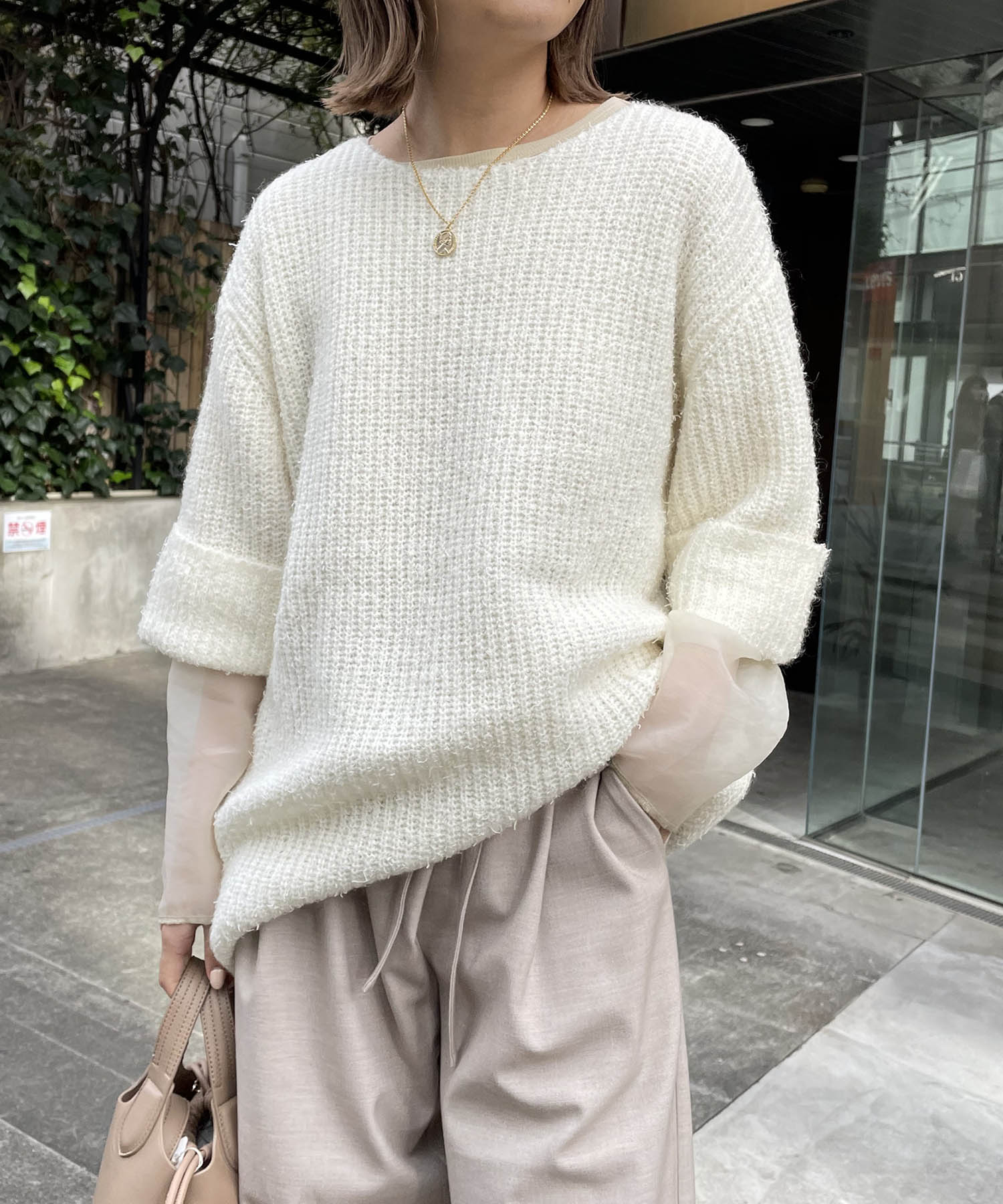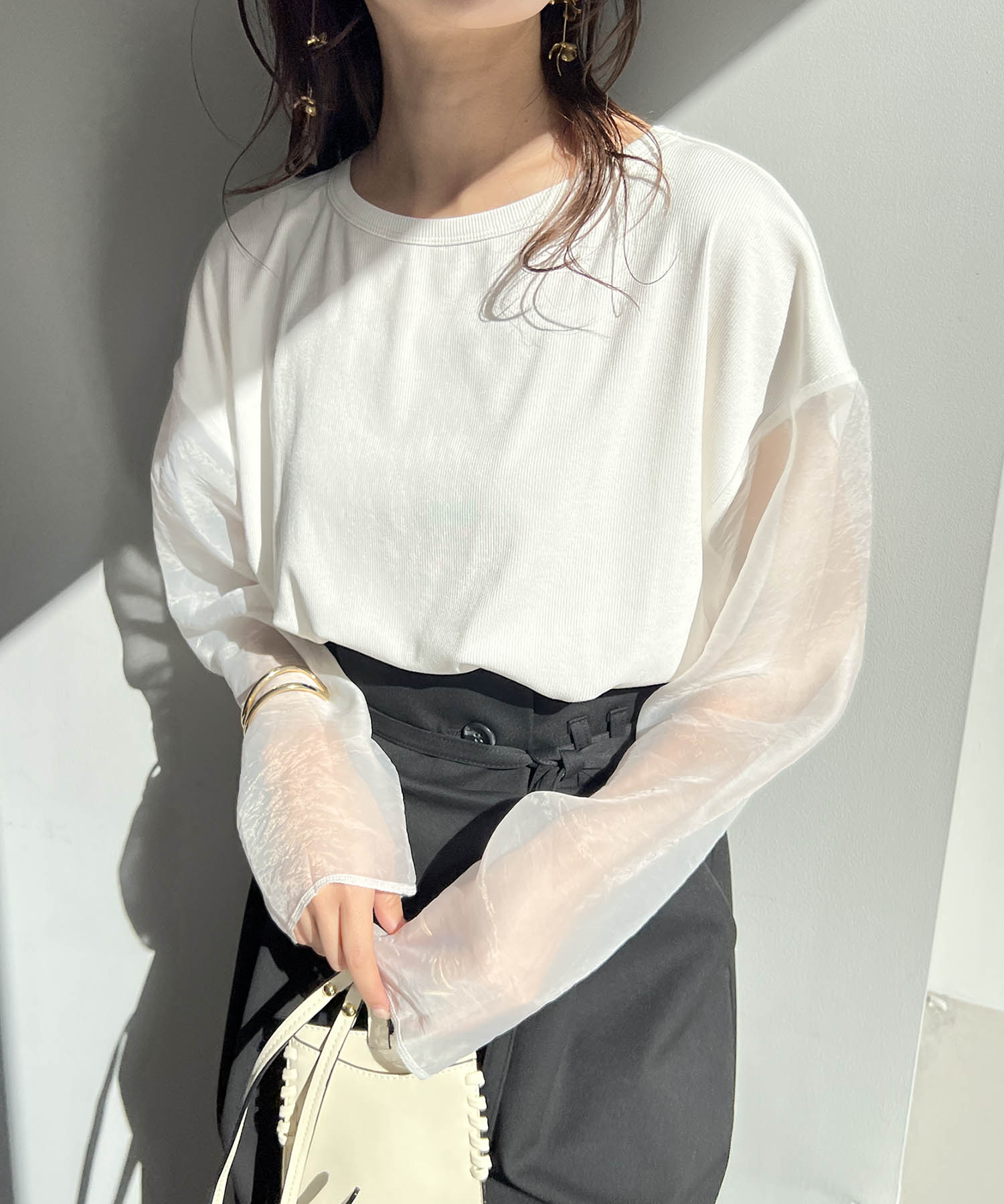 春に着たい、WHITEワントーンcode! ハーフスリーブニット×シアースリーブリブTのレイヤードはlemageオススメスタイリングです◎ シアースリーブリブTはインナーとしても、メインにも活躍してくれるのでこの春マストです!