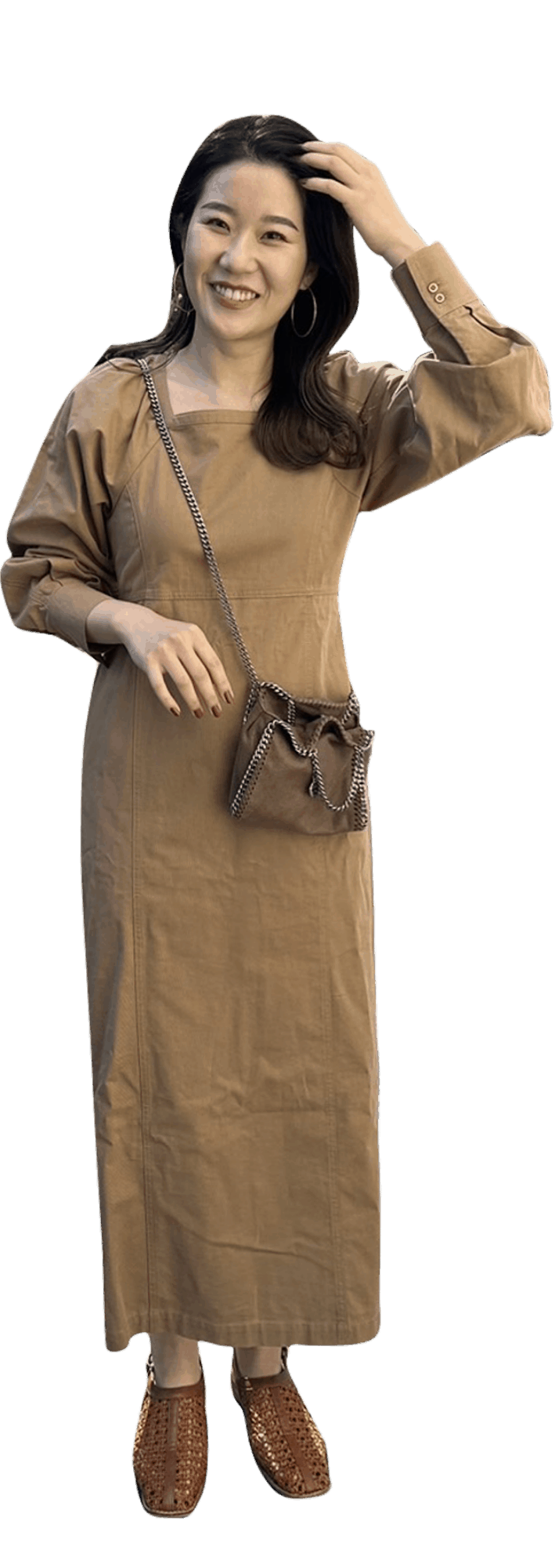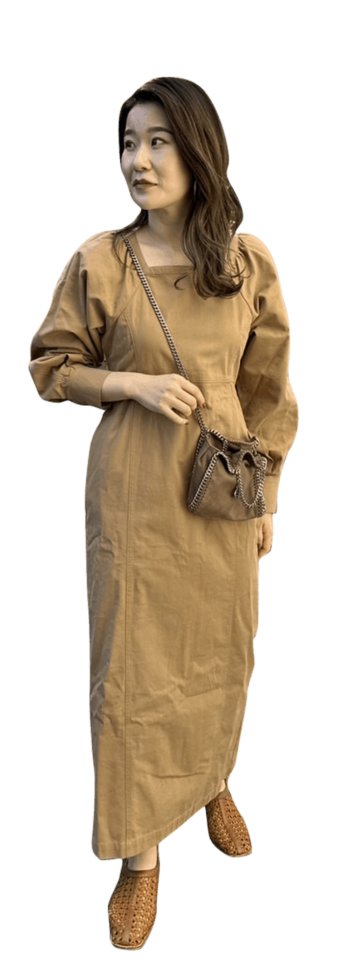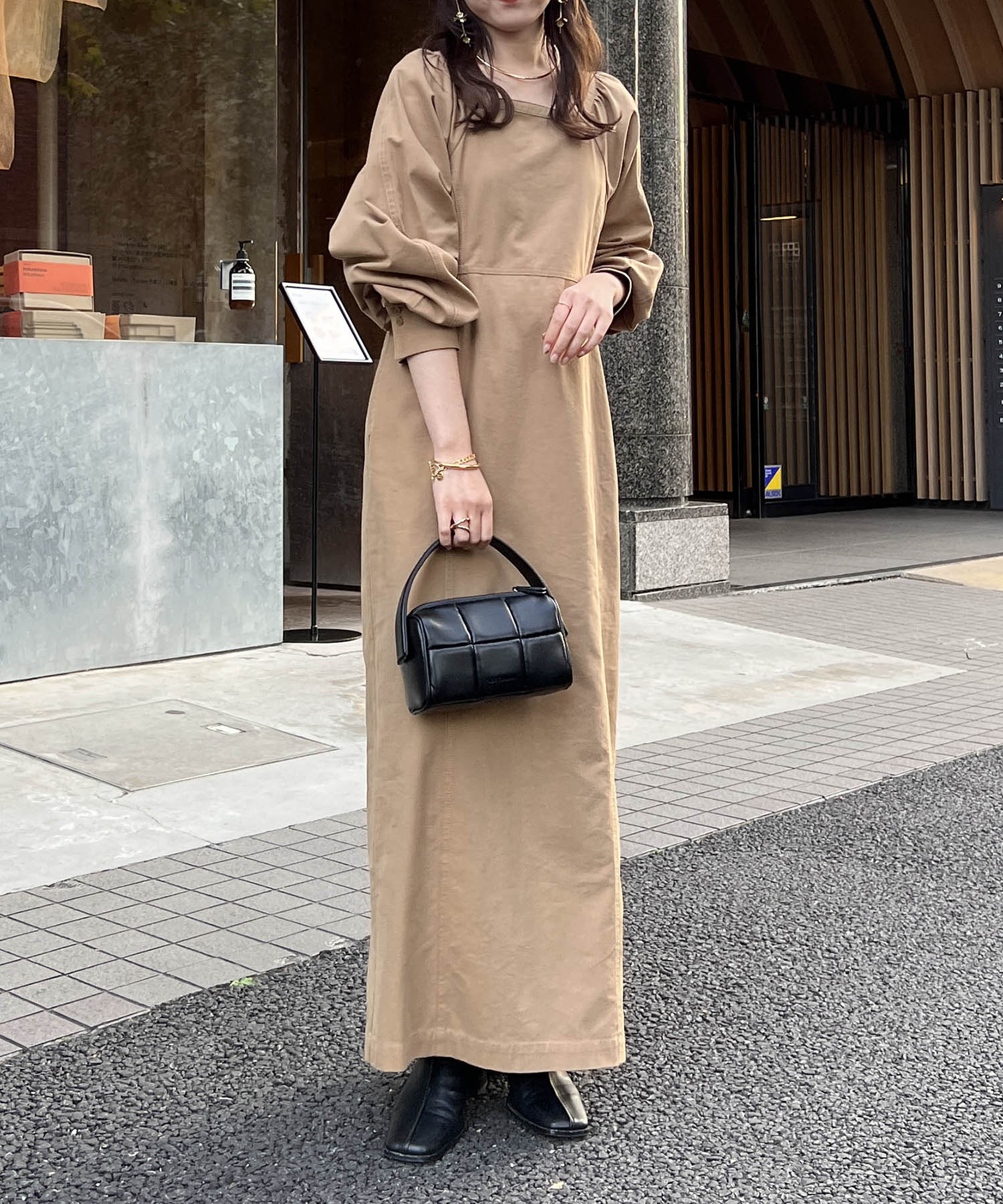 春らしいブラウンベージュのワントーンコーデ。 スクエアネックなので、デコルテがすっきり見えて、女性らしいシルエットのワンピースです。 お買い物や、ちょっとした女子会にも着用できる万能な一着です。