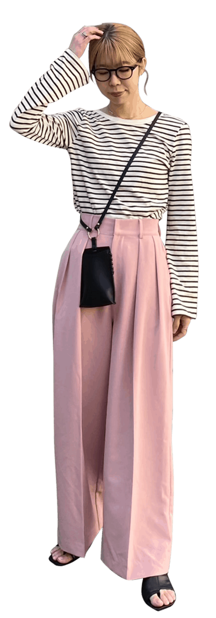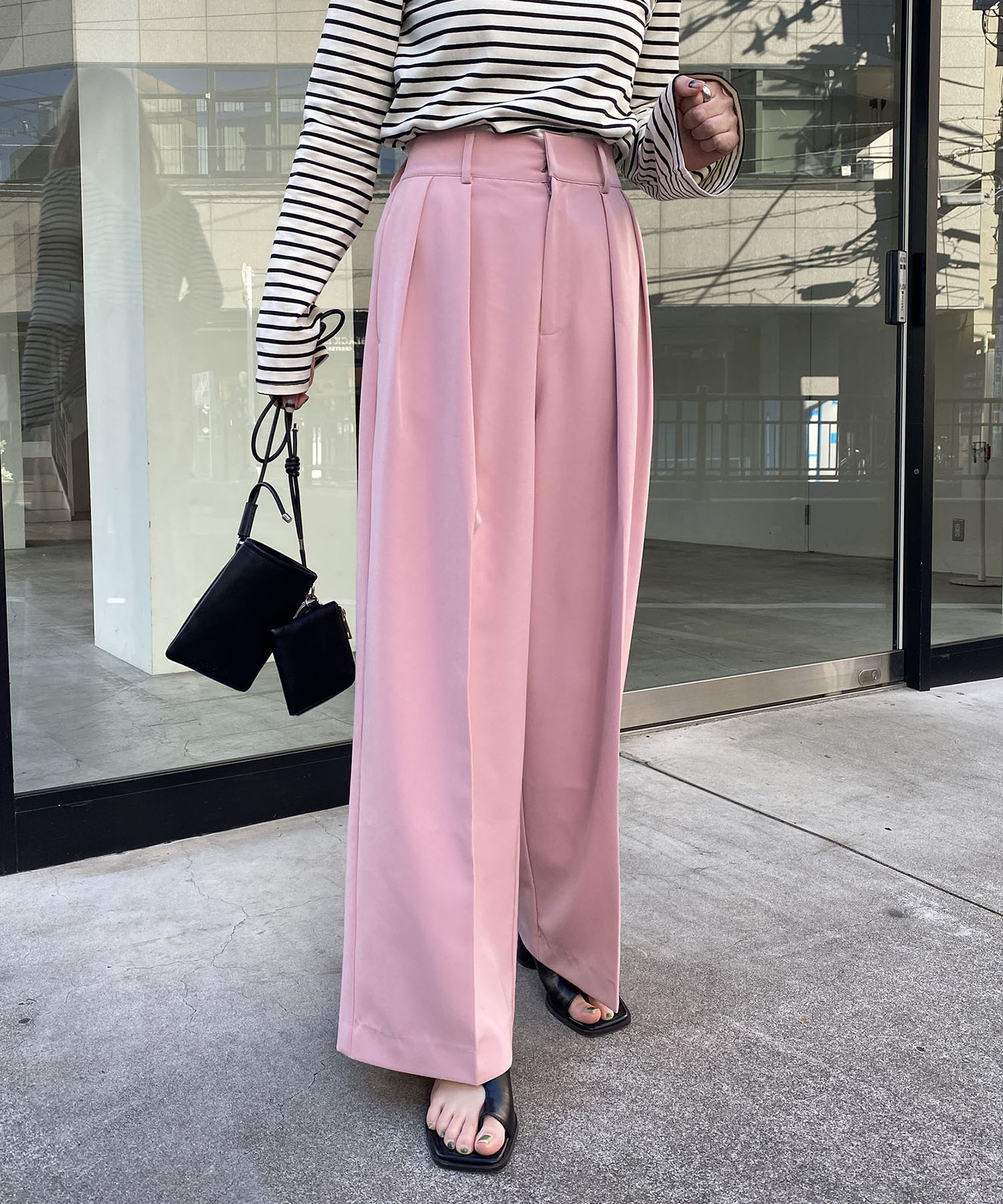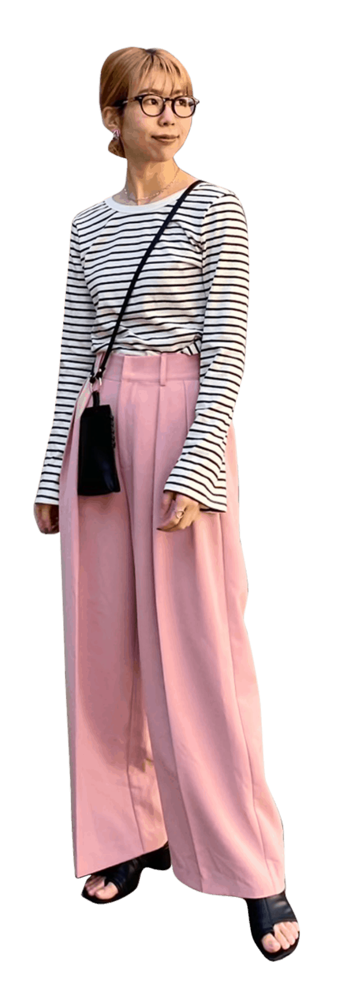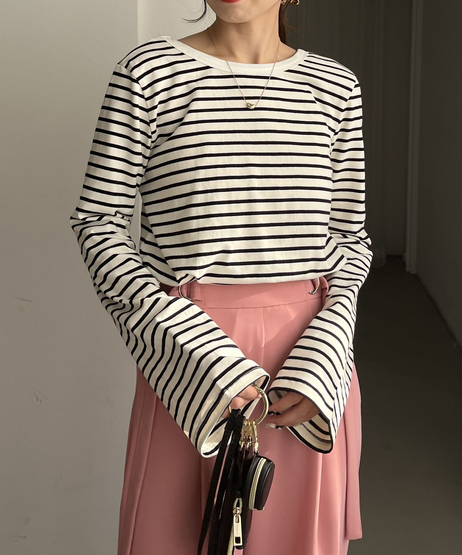 春になると着たくなるボーダー柄はフレアスリーブが新鮮! ボトムはピンクの美脚効果抜群のカラーパンツを合わせて春らしさを意識しました。