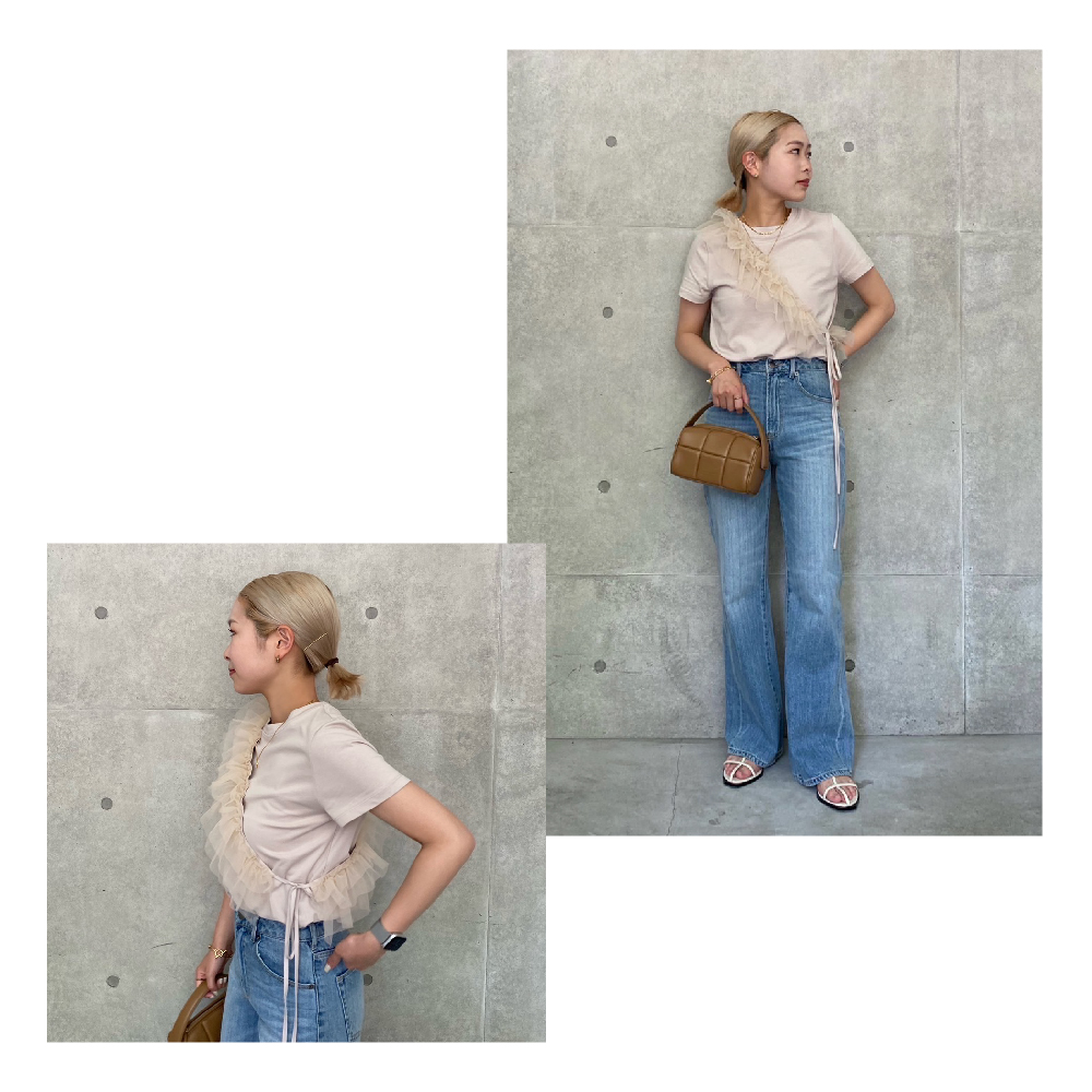 フレンチスリーブのTシャツと足元のサンダルで抜け感を