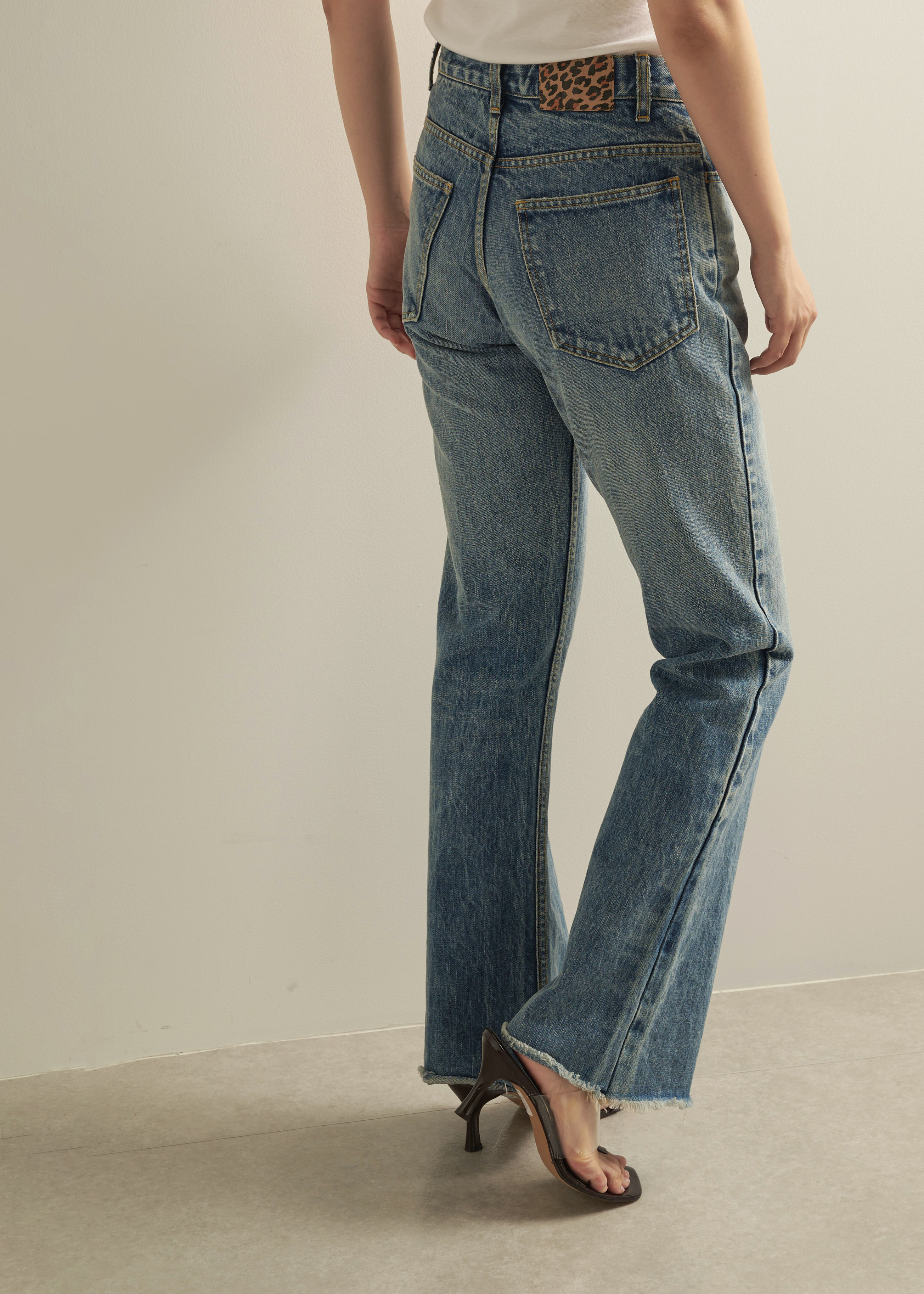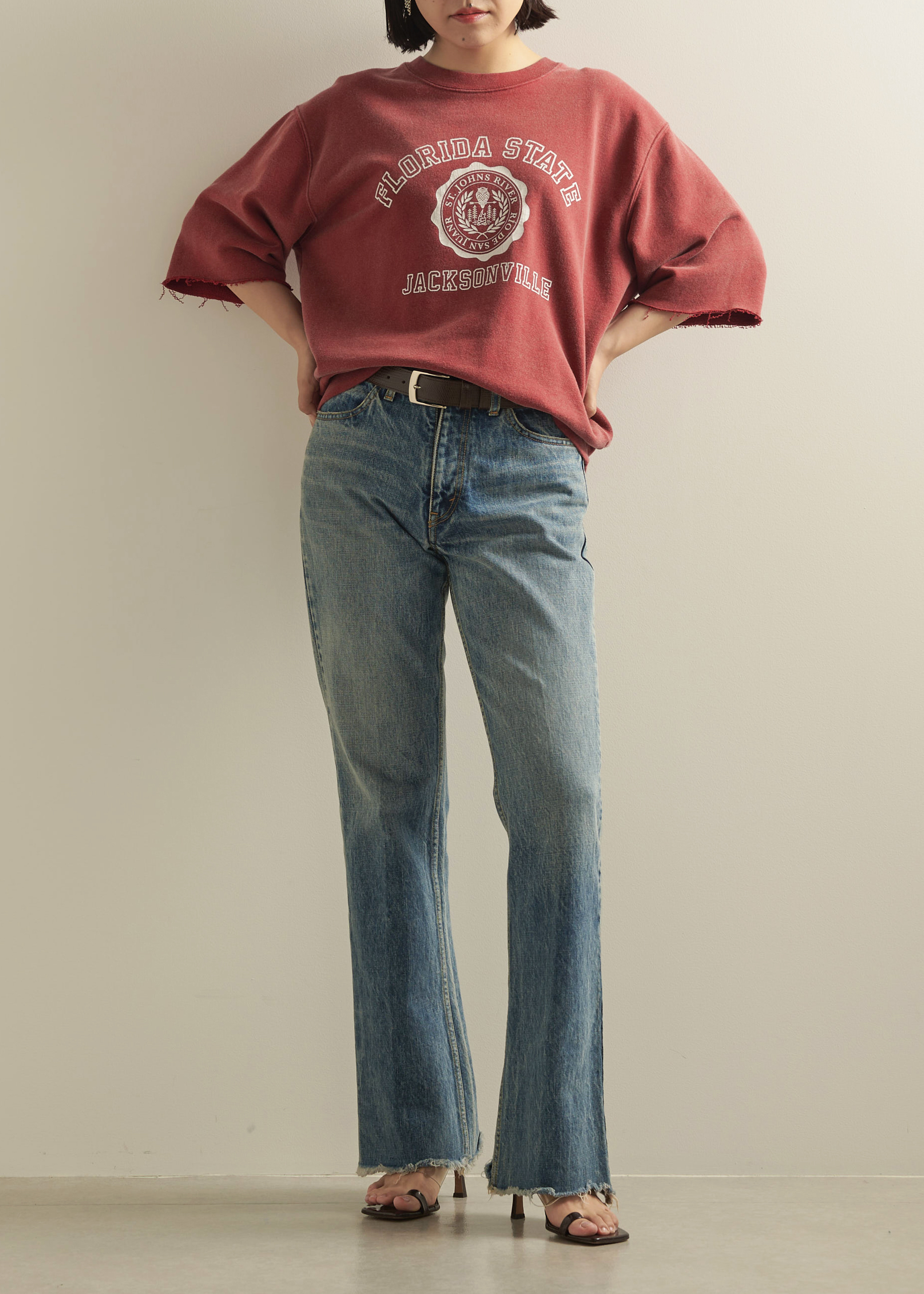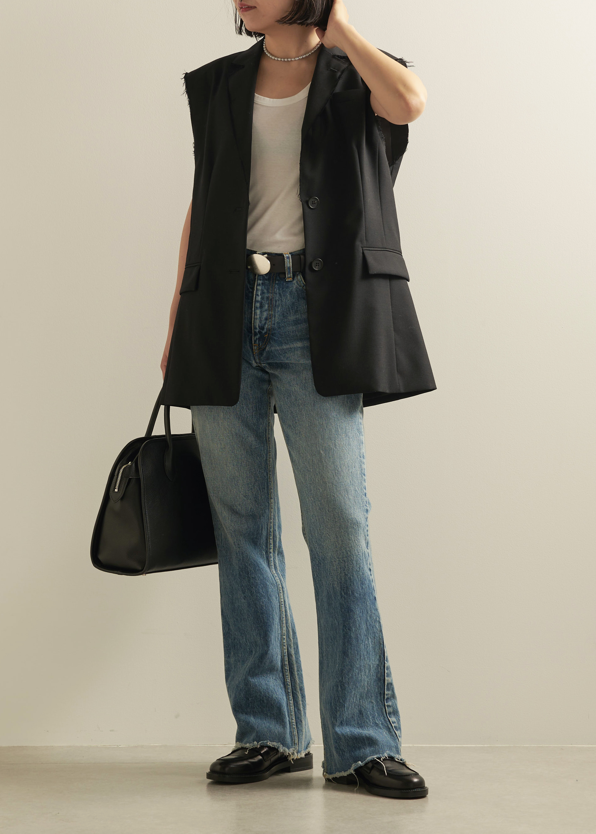 美脚デニムといえば「センタープレスセミフレアデニム」がおすすめです!腰周りのスッキリさはもちろんのこと、ひざ下から緩やかに広がるフレアシルエットが脚を細く長く見せてくれます。穿き込んでもシルエットが変わりすぎないのもポイントです。