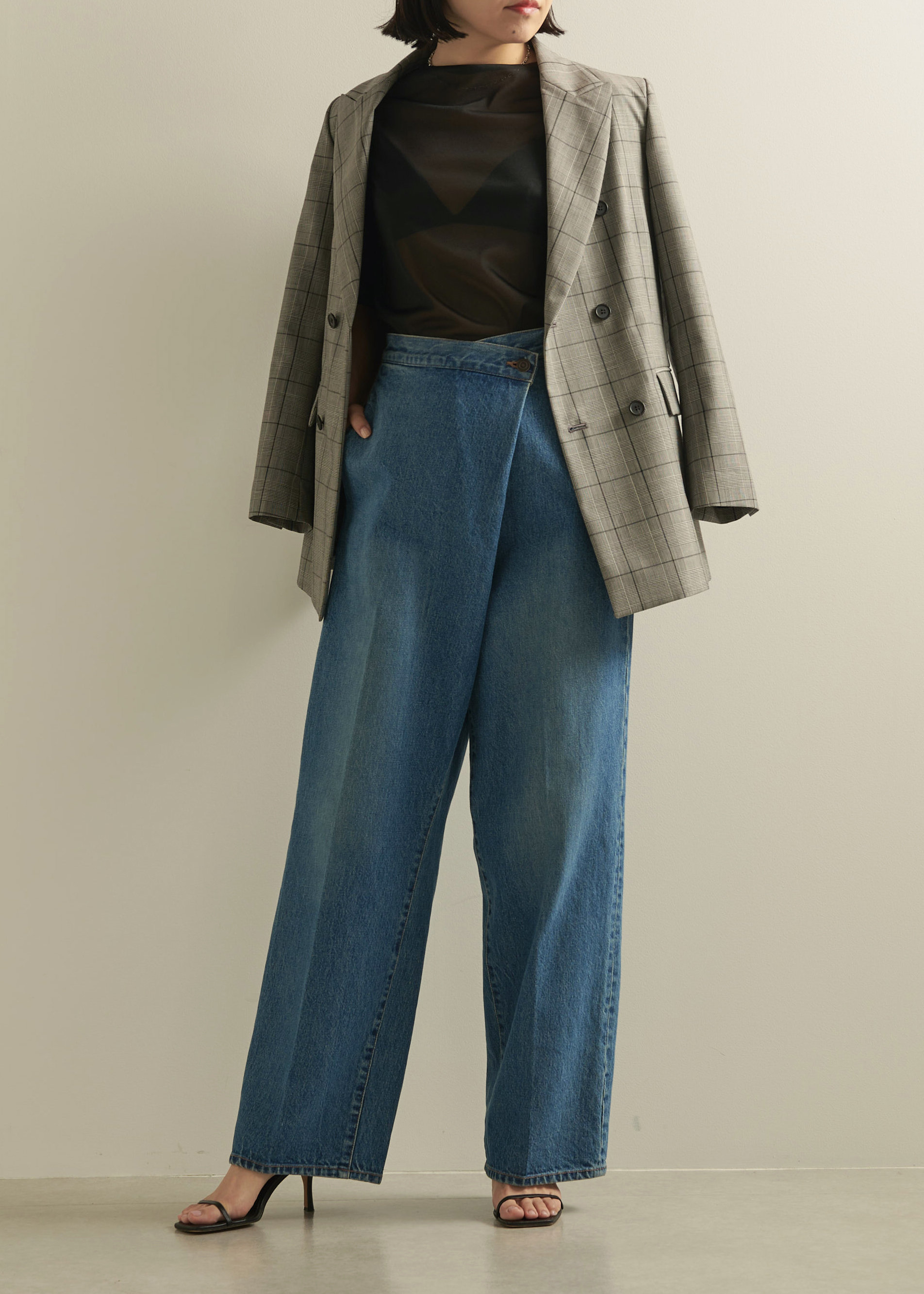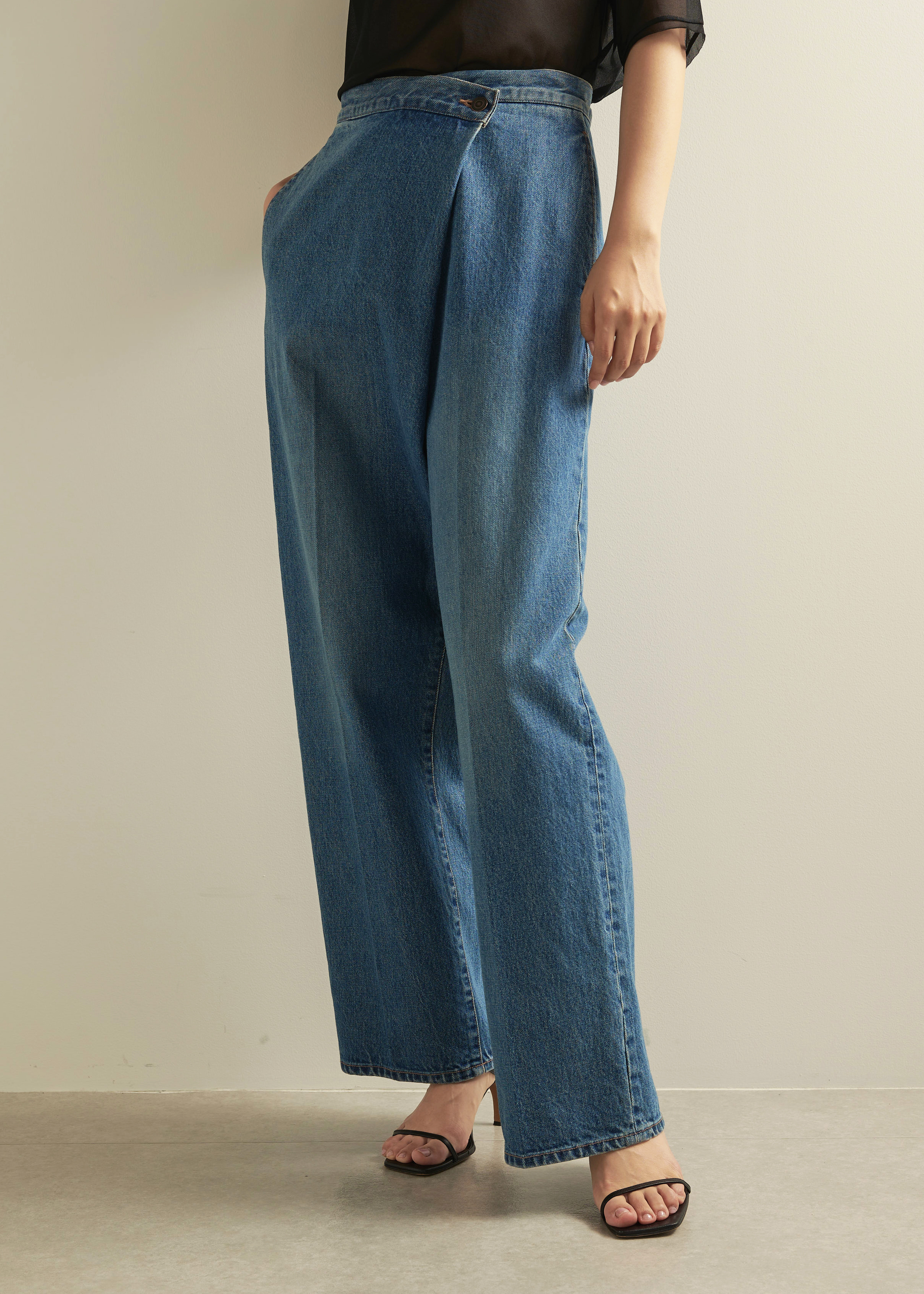 新作の「タックデニムパンツ」は、ウエストがラップデザインになっていて、お腹からヒップにかけての目立たせたくない部分を綺麗にカバーしてくれます!見た目よりも柔らかいので動きやすく穿き心地も◎