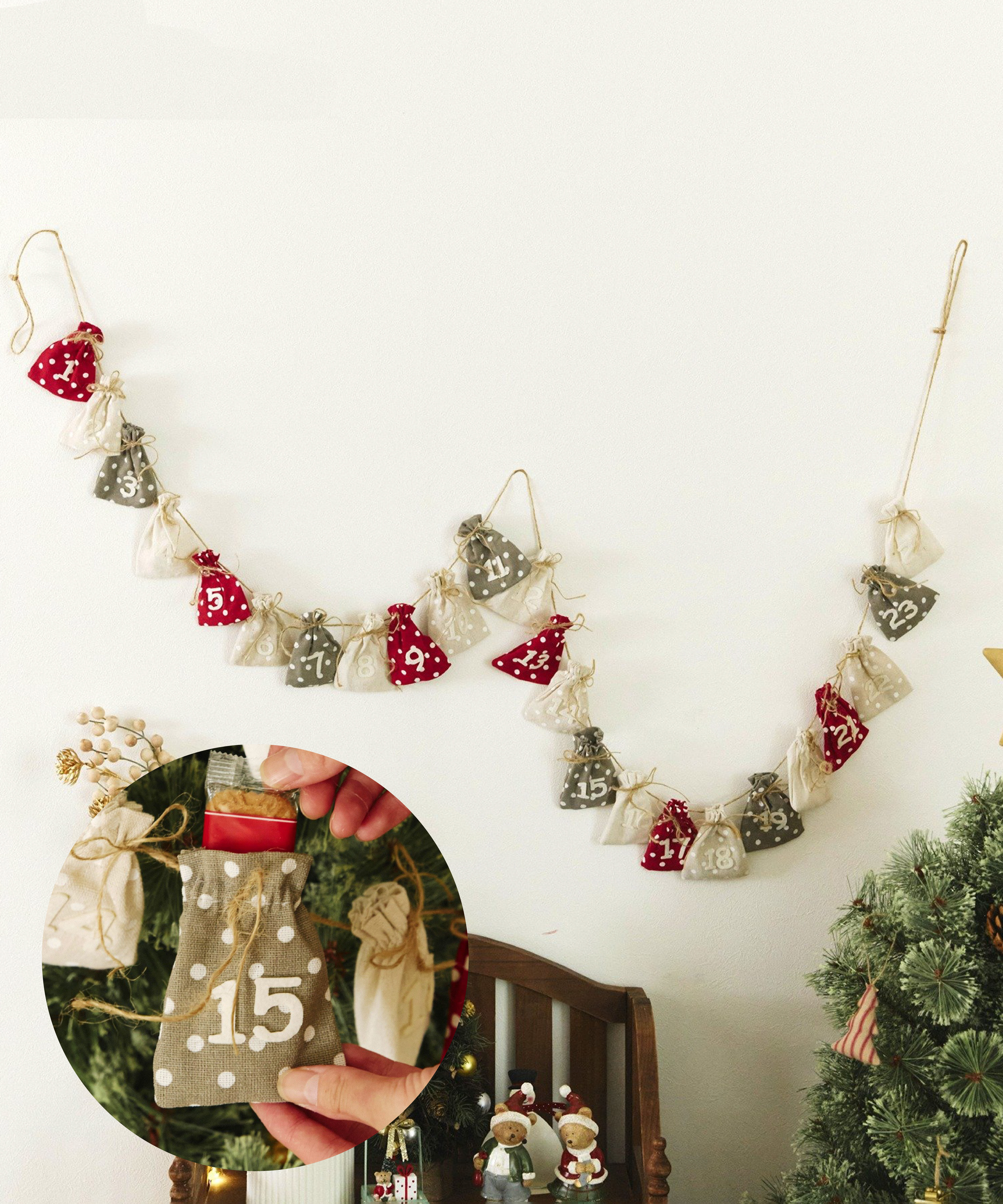 巾着にお菓子や小物を入れて、クリスマスまでの
