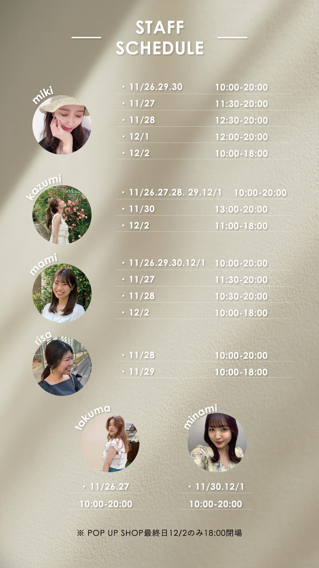 ※スタッフmiki、kazumiに関しまして接客予約枠の時間帯がございます。