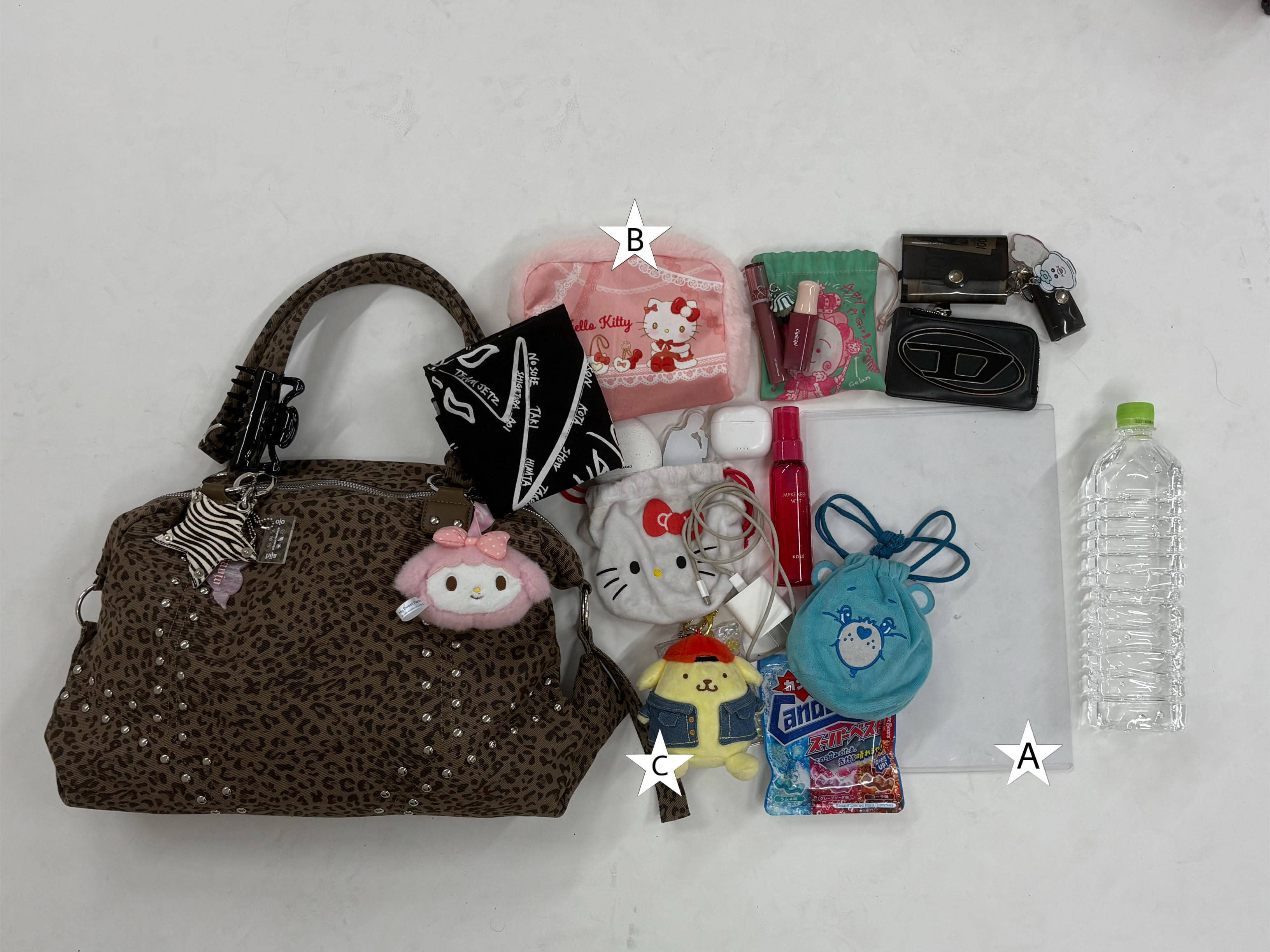 B ・・・ バッグに大きめのマスコット付けたりとか、ここで個性出してます★ミニアドマイザーにはSHIROの香水を入れて持ち歩いています!
