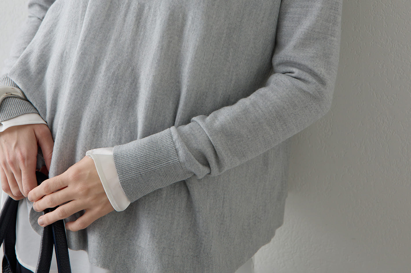 滑らかな素材で落ち感が美しい、天竺組織のウール100%で薄手ながらもしっかり暖かさを感じるニット。手洗い可能でホームケアしやすいのも魅力。