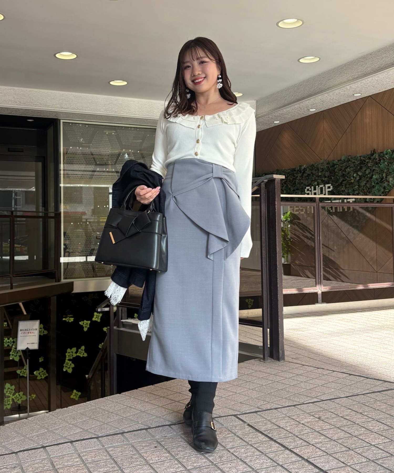 腰の張り、ヒップの立体感が気になる私でもスッキリ見えて、お気に入りのスカートです♪ 無地だけどコーデにフェミニンさをさりげなく出してくれるフロントのリボンもお気に入りポイント♡ トップスのカラー次第でフェミニンにも上品にも振れるグレーを選びました!