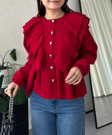 ハートボタンフリルペプラムショートカーディガン