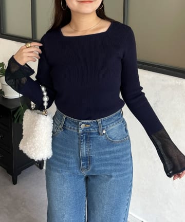 袖シアースクエアネックリブニット