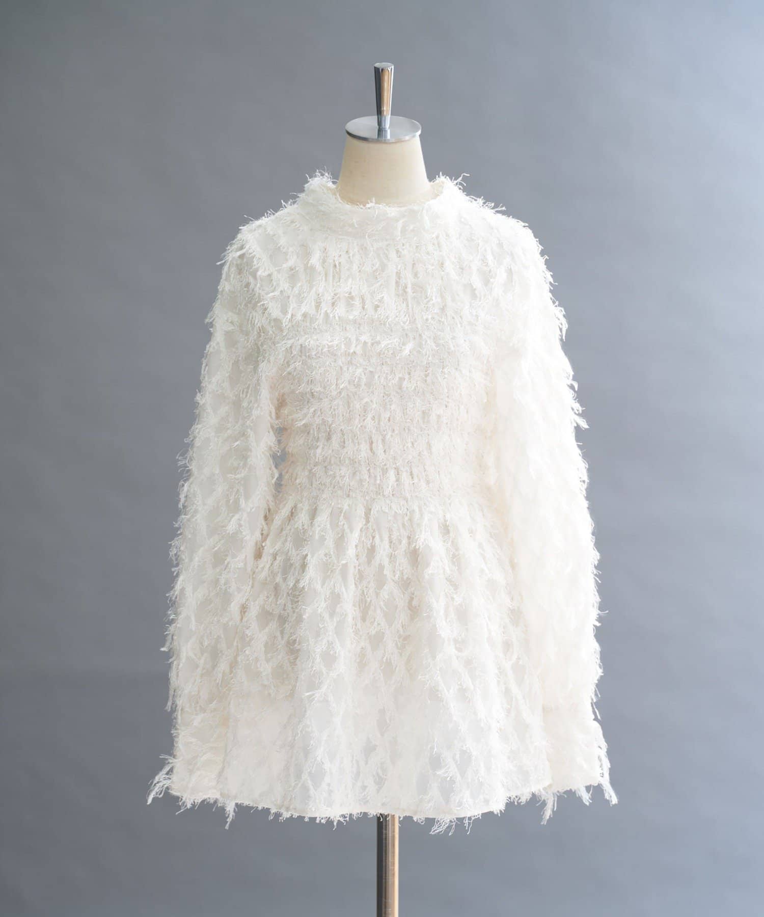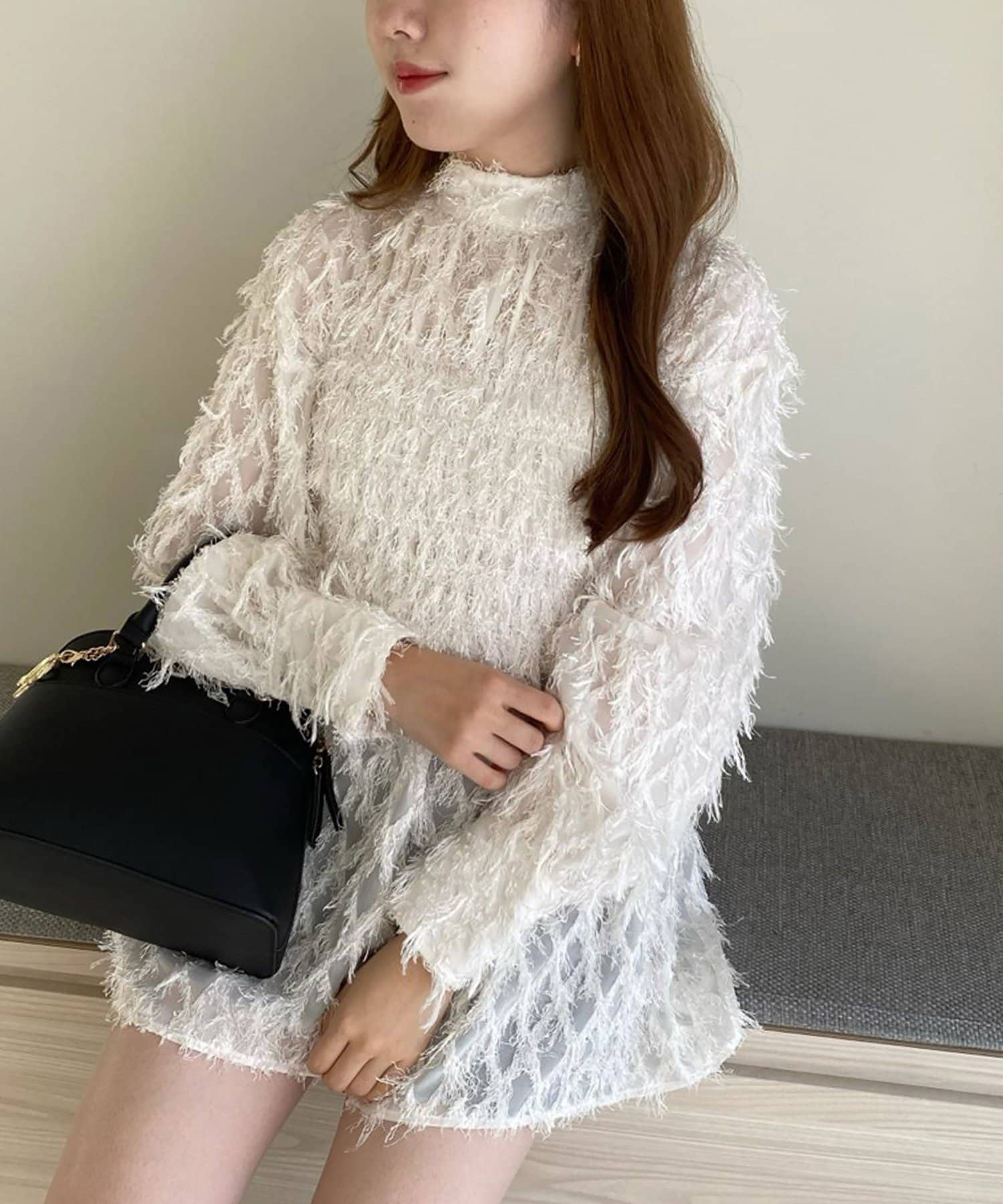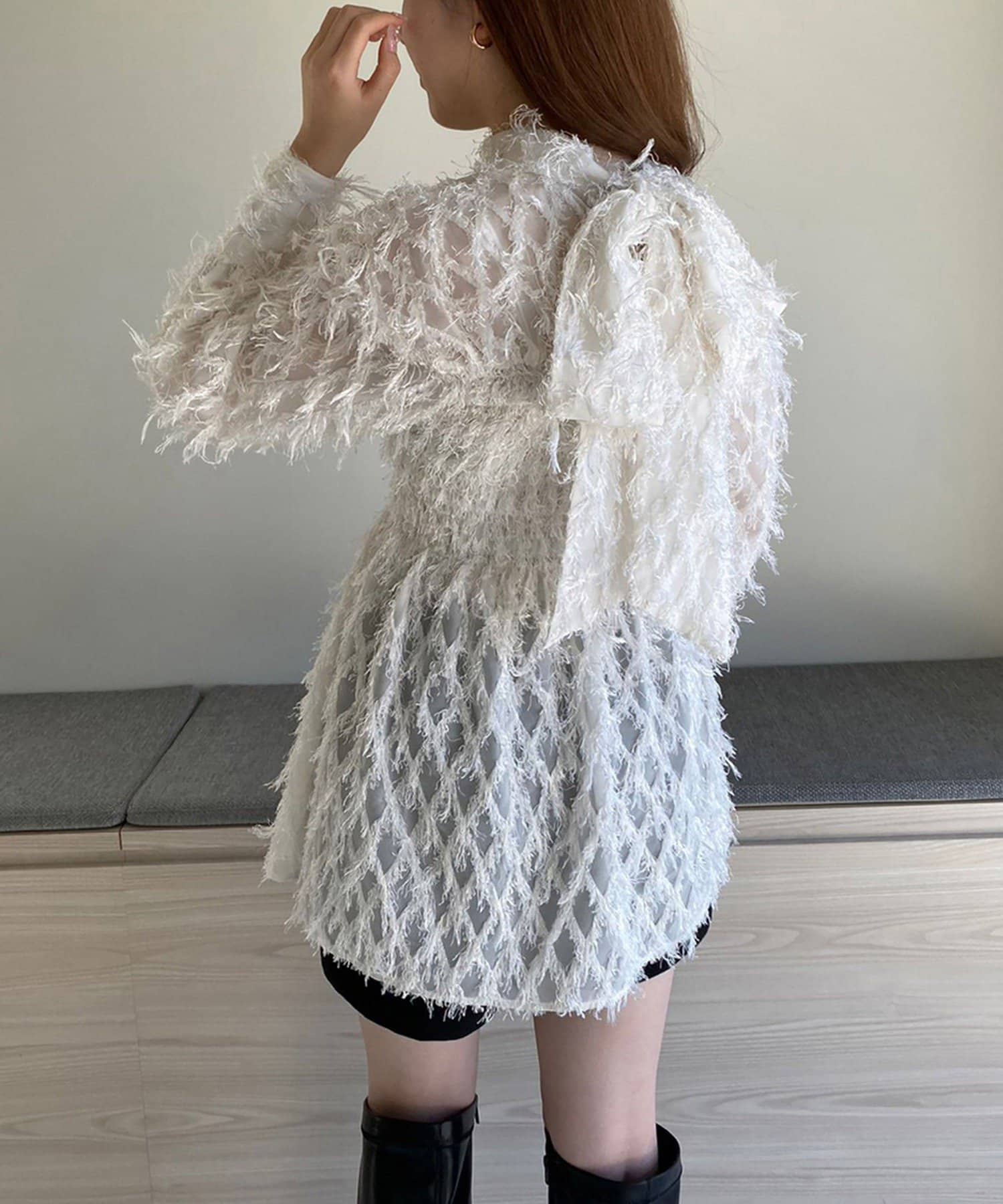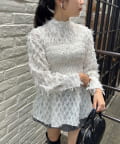 胸元にはシャーリングをあしらい、スッキリ見せた着こなしに。