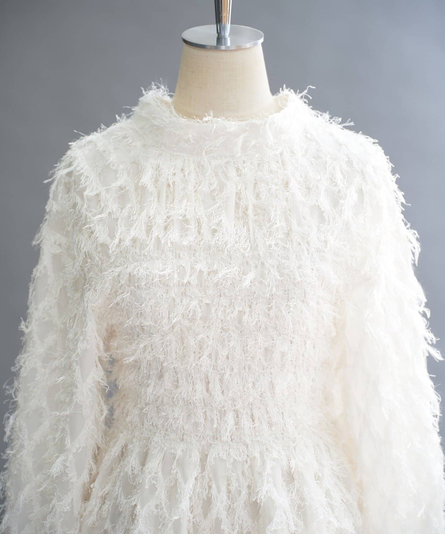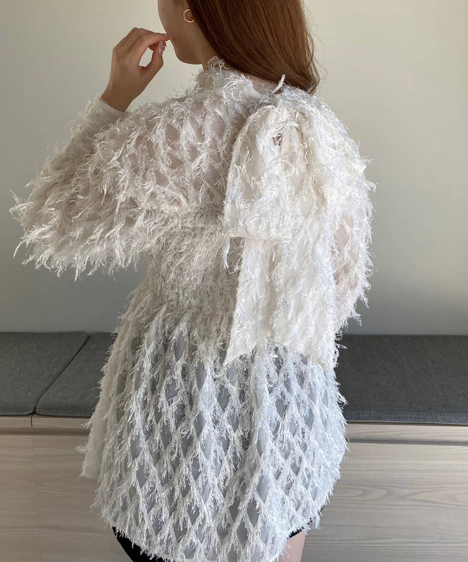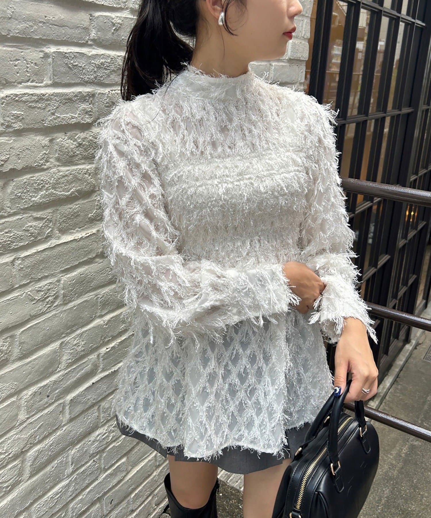 胸元にはシャーリングをあしらい、スッキリ見せた着こなしに。