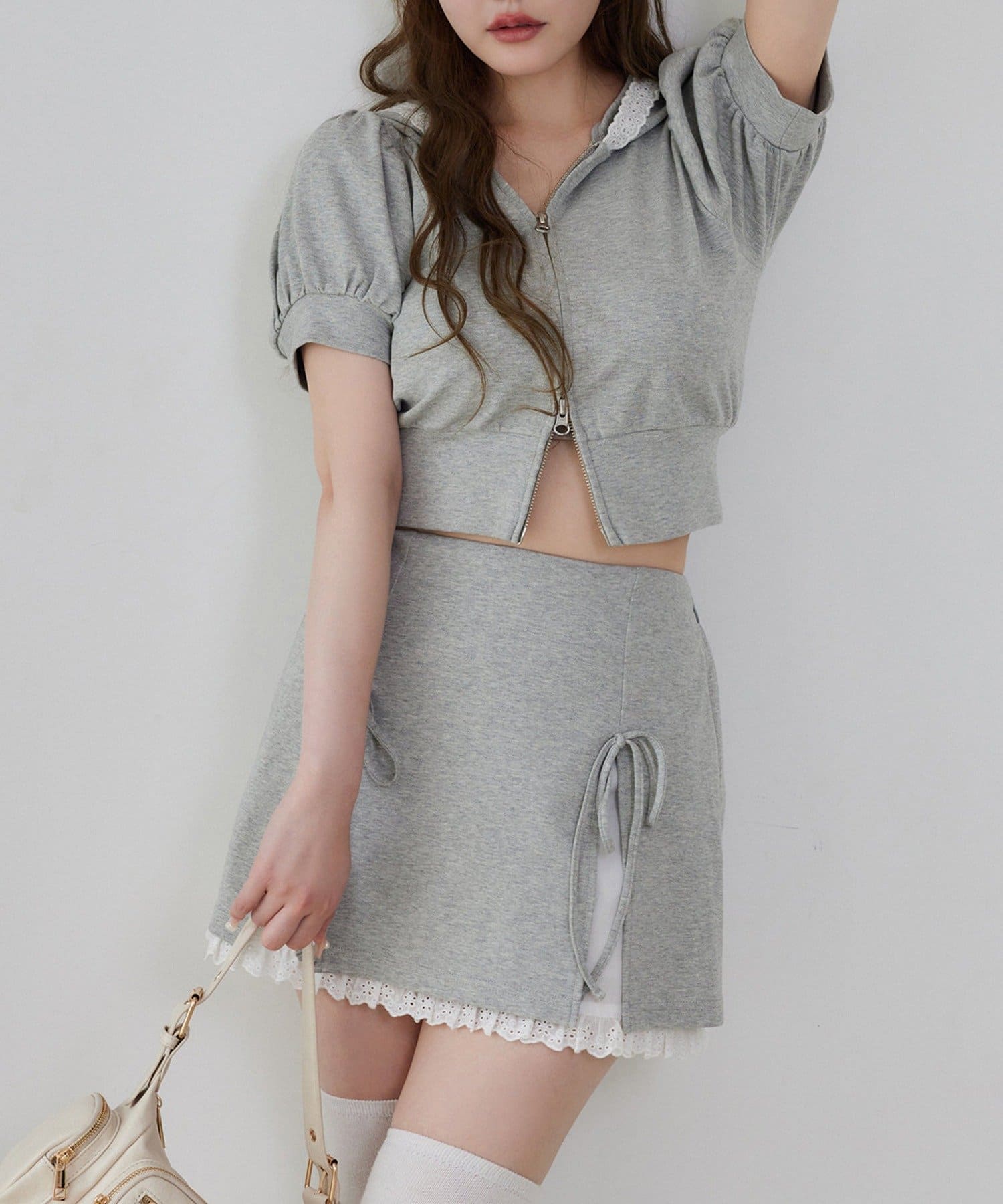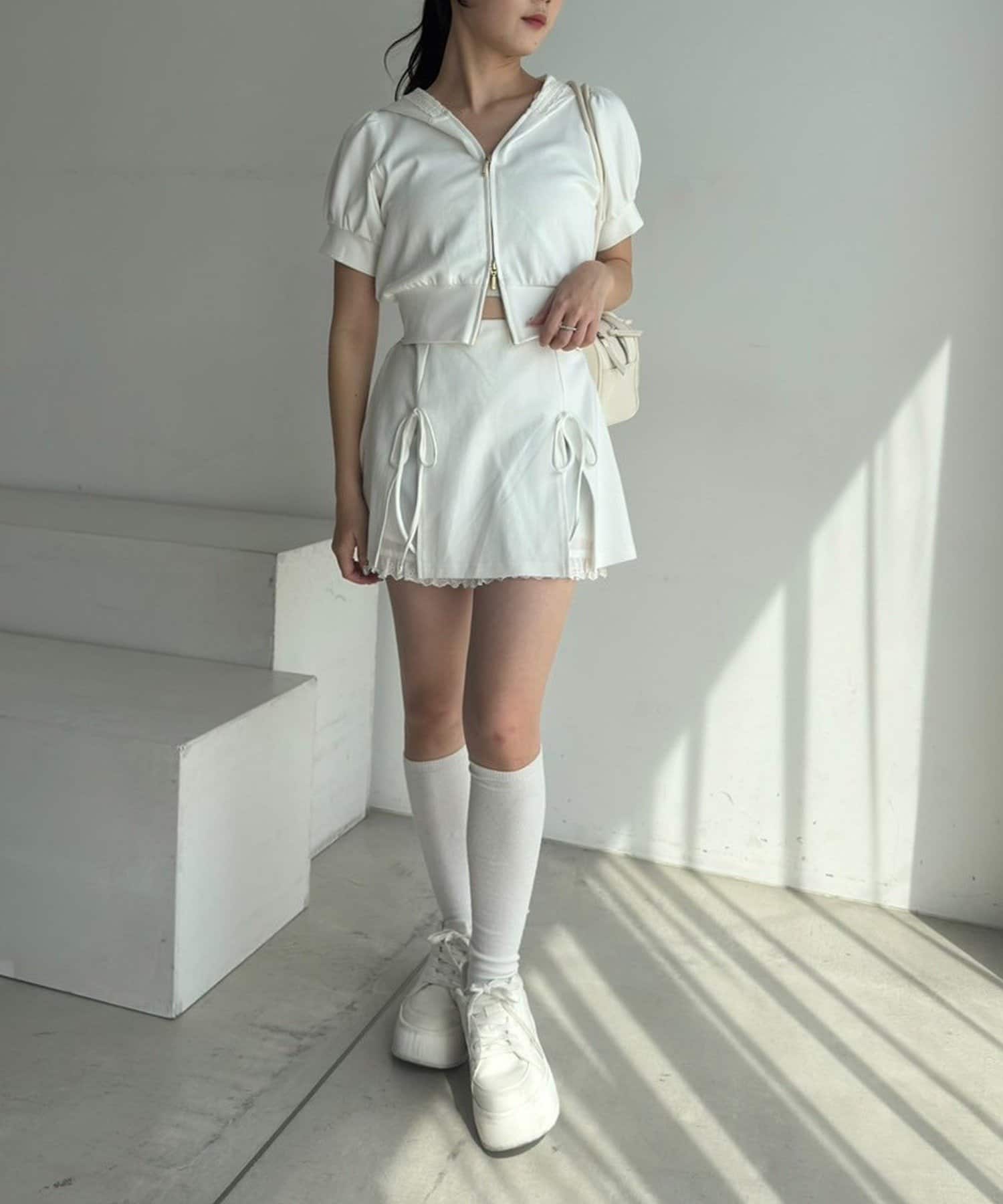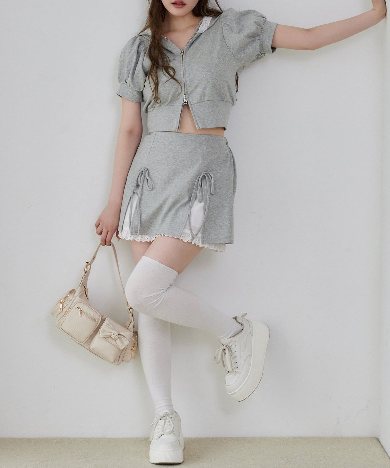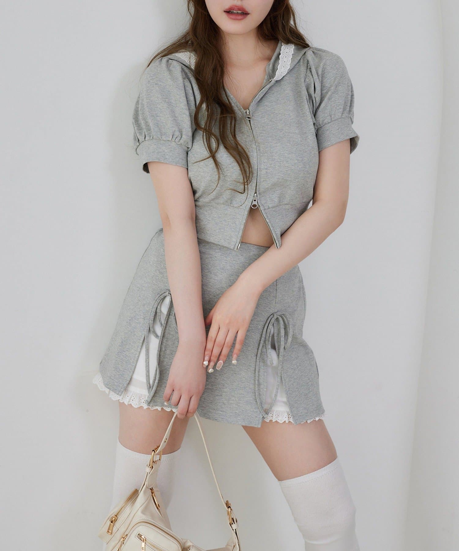 程よくフィットするシルエットに、裾のレースデザインとリボンがフェミニンなアクセントをプラス。