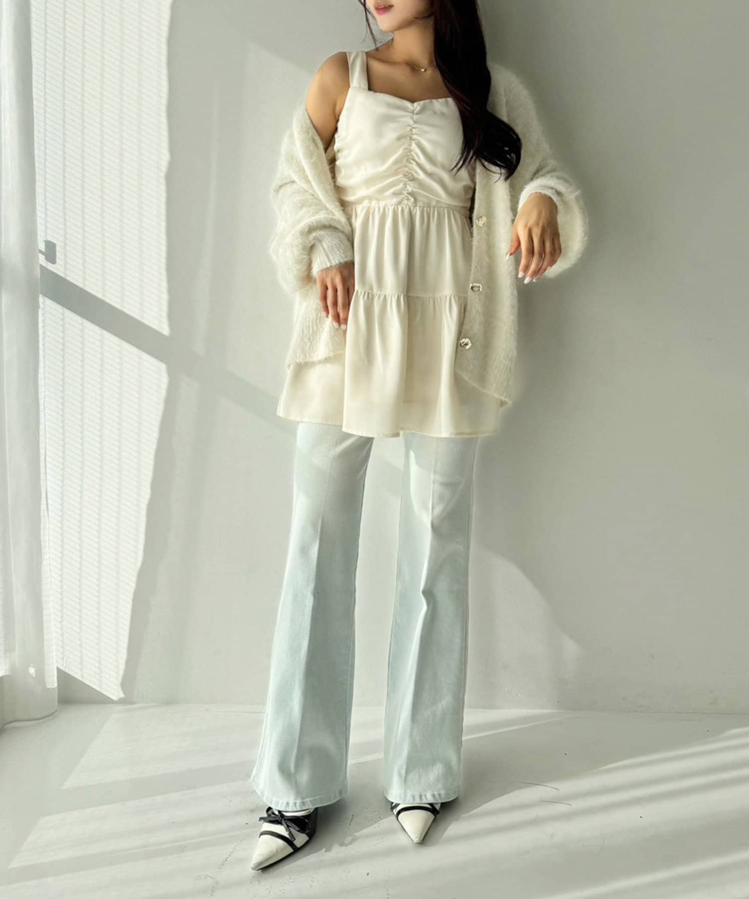 カジュアルになりやすいデニムは少し甘めなトップスとの合わせが今年らしい着こなしでおすすめ。