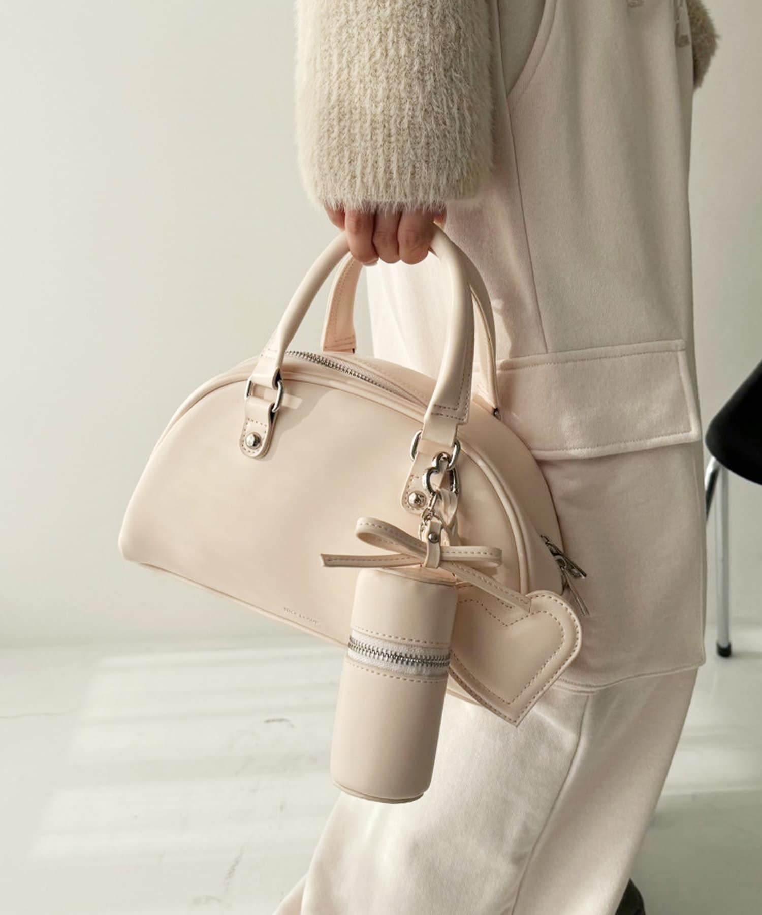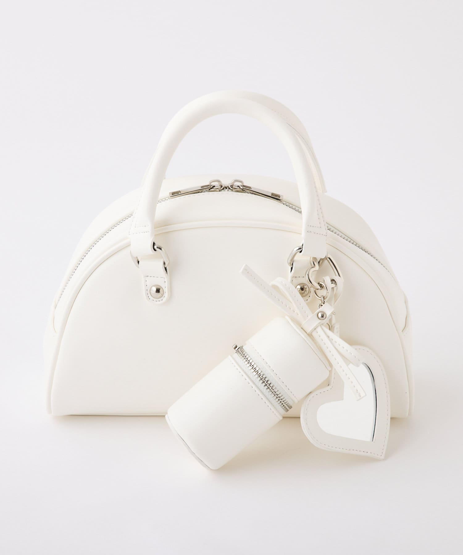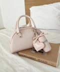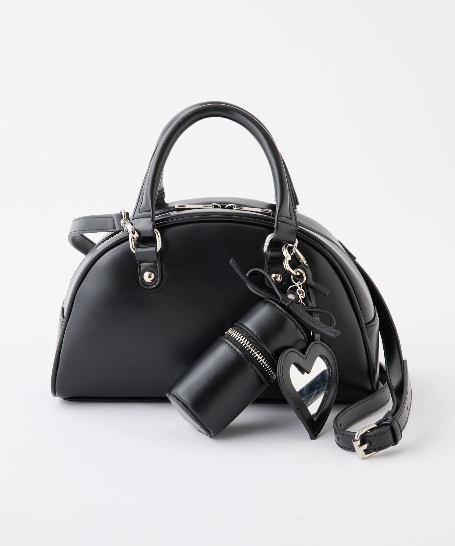 リボンのチャームとハートのミラーとリップケースが付いたボストンバッグ