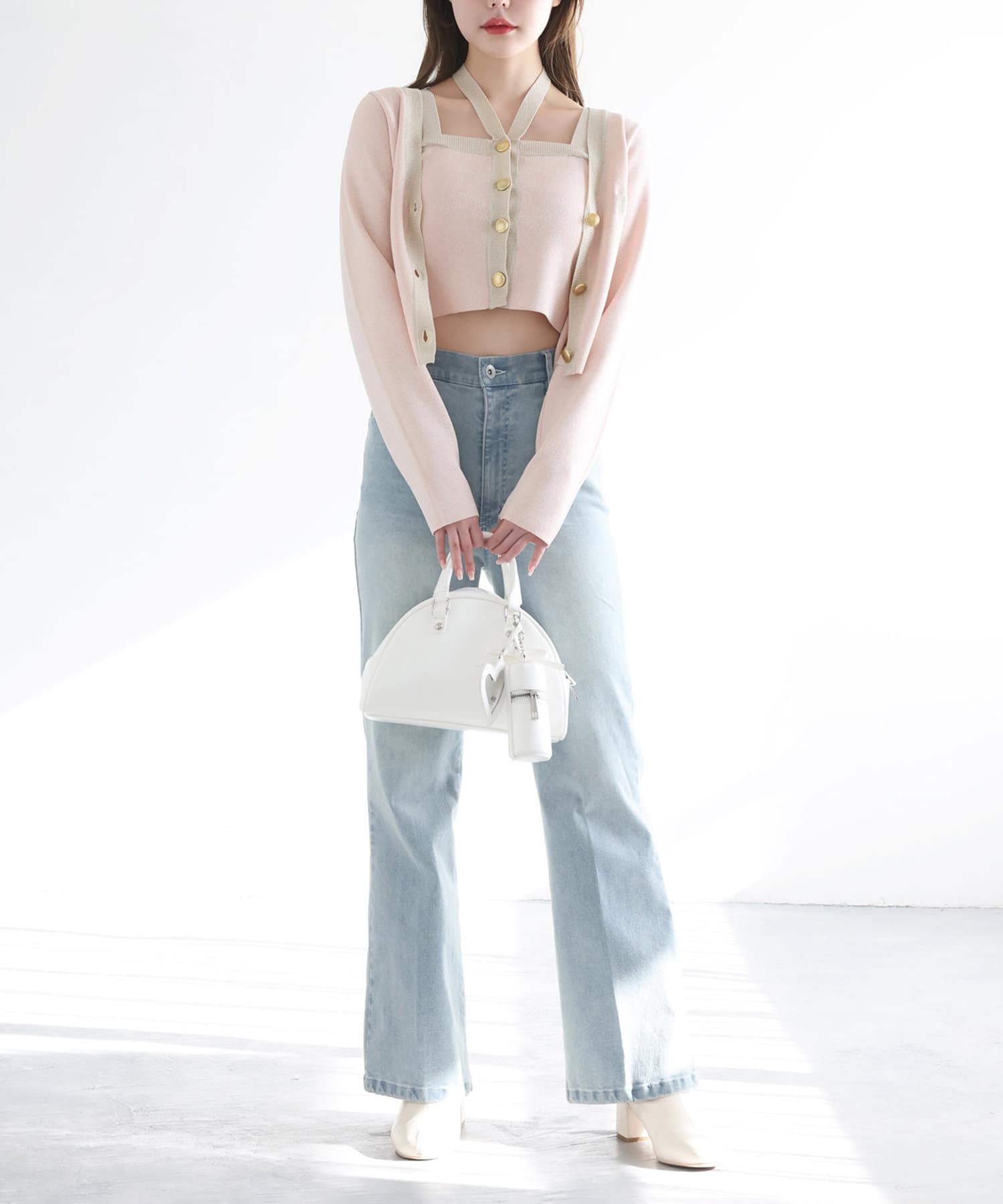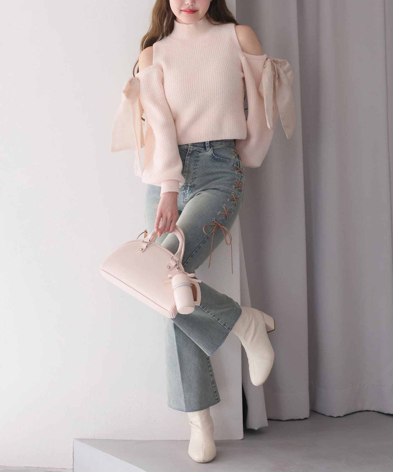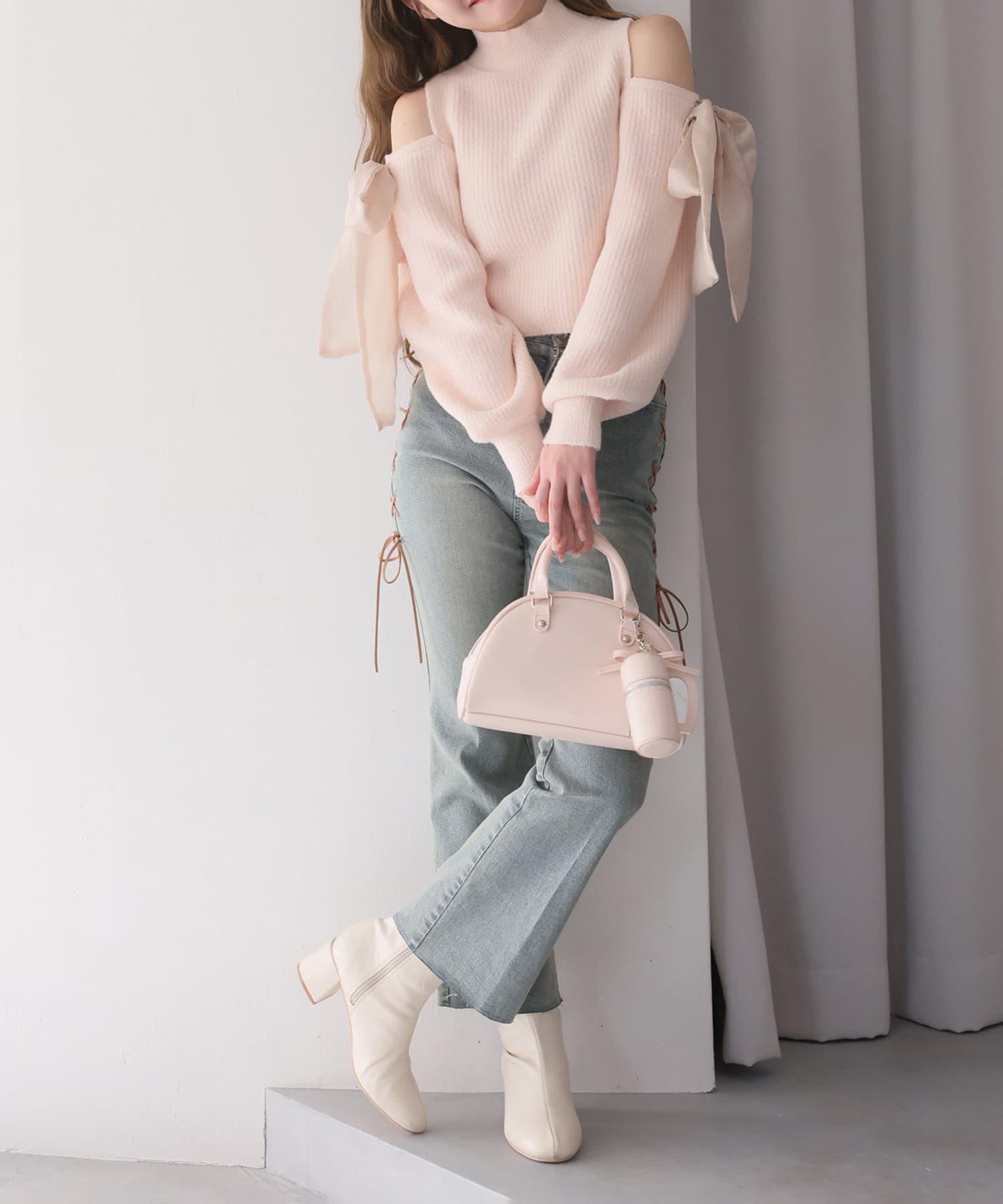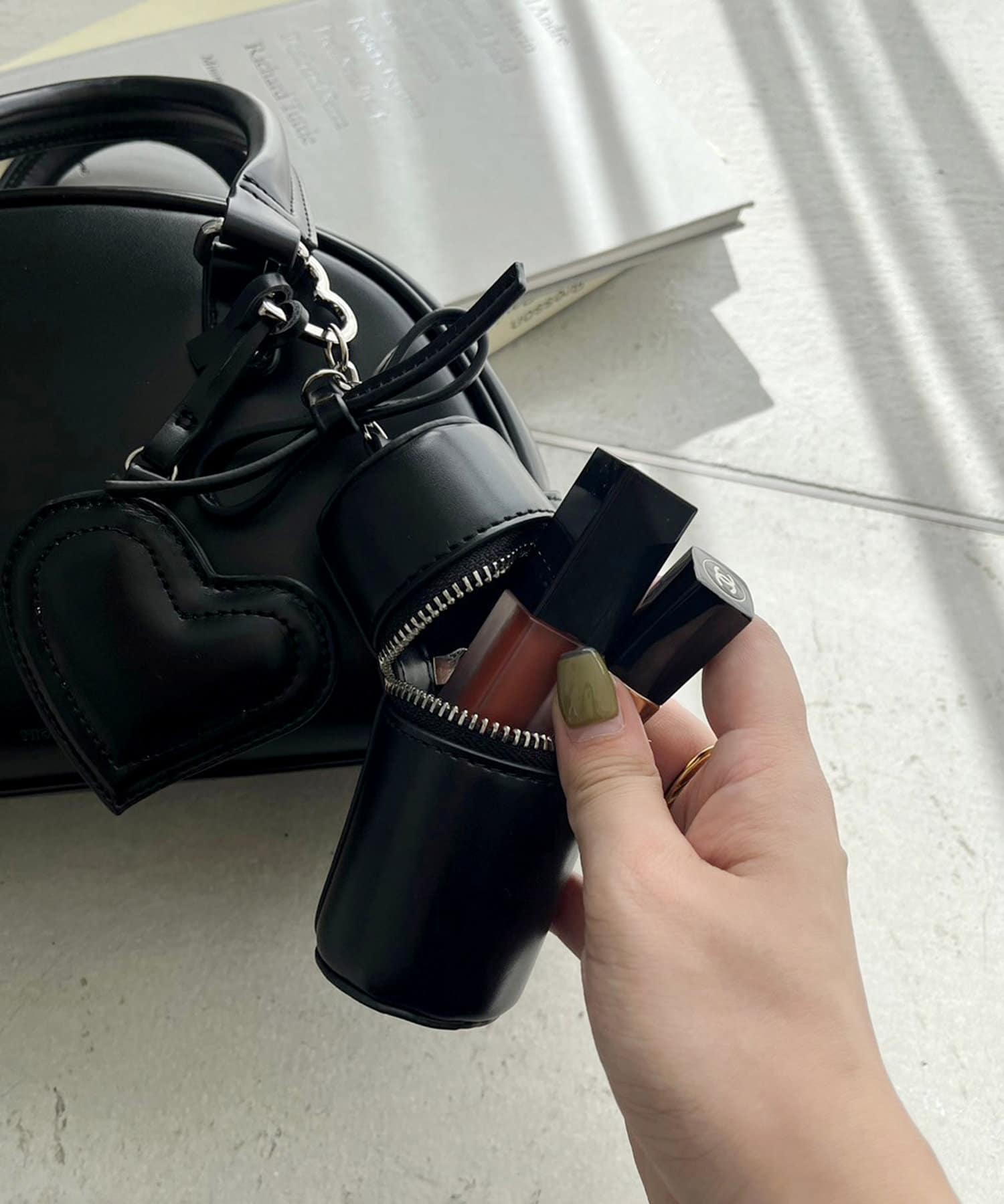 リボンのチャームとハートのミラーとリップケースが付いたボストンバッグ