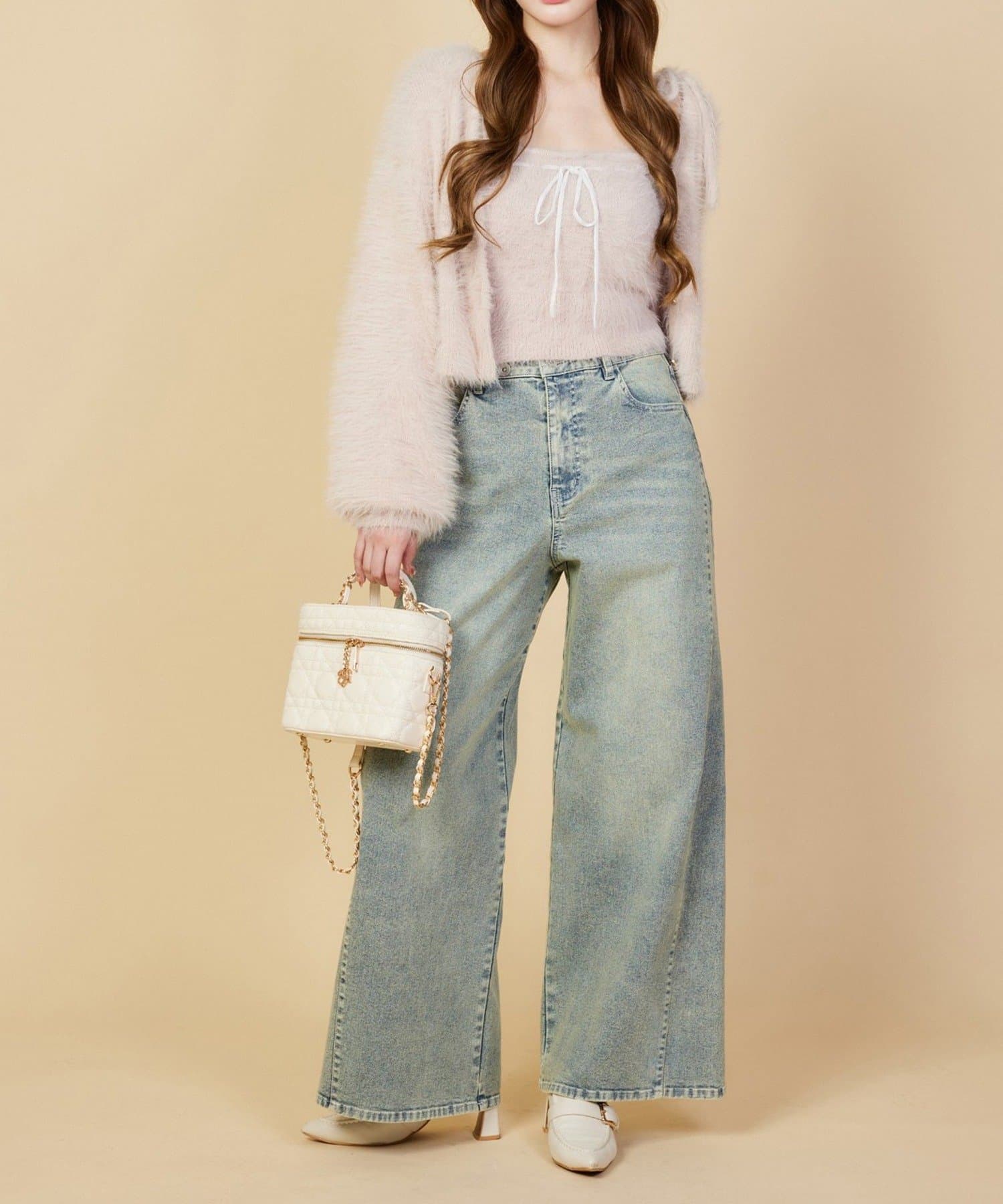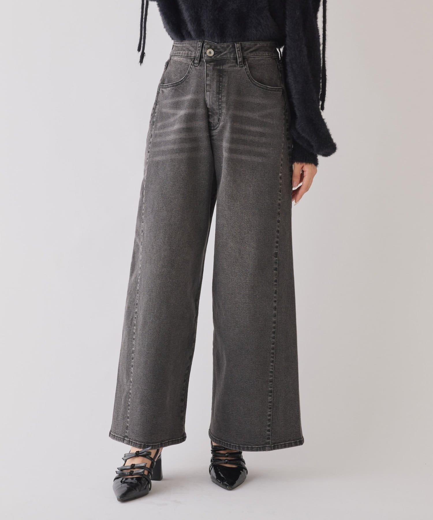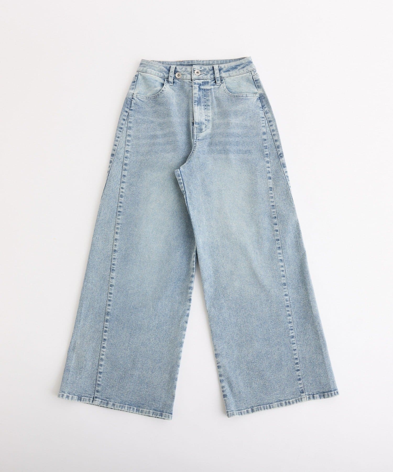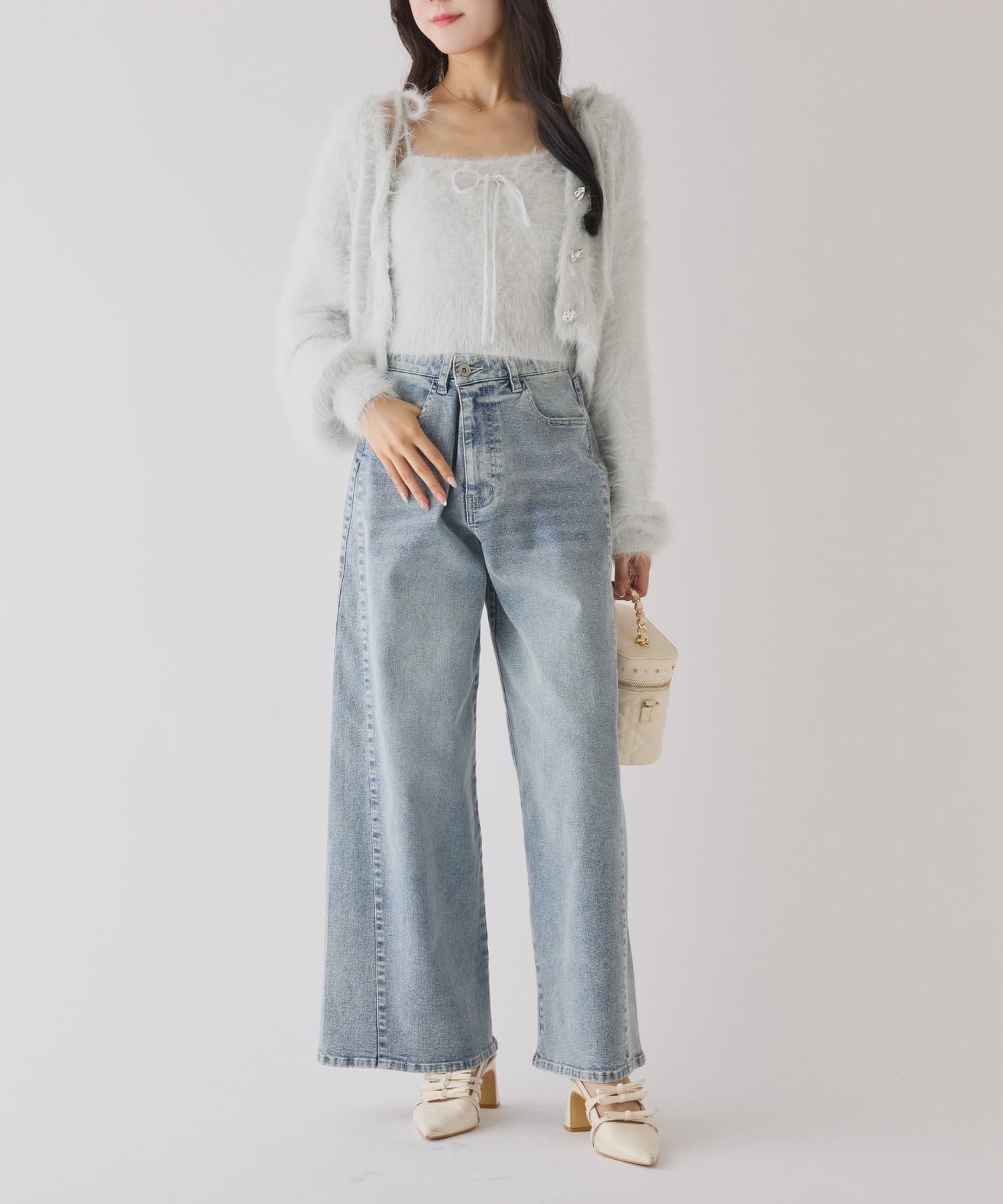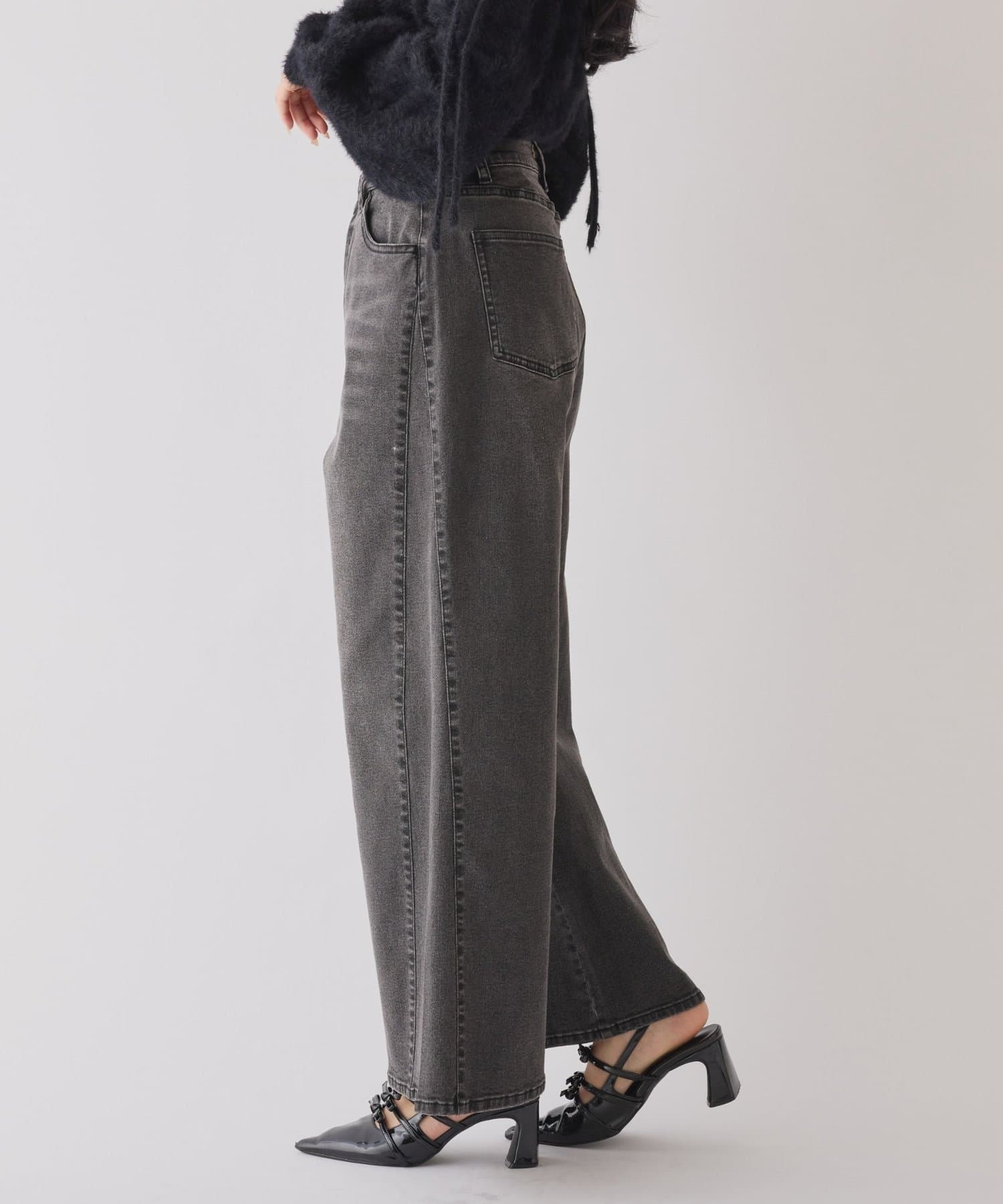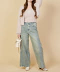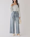 全体的にゆったりとしたシルエットのワイドデニムは、華奢見せ効果も。