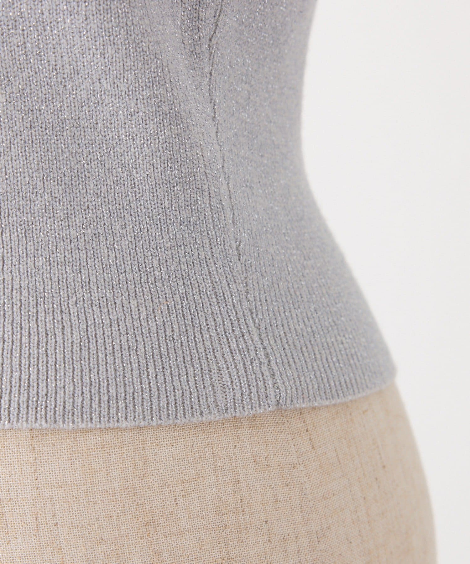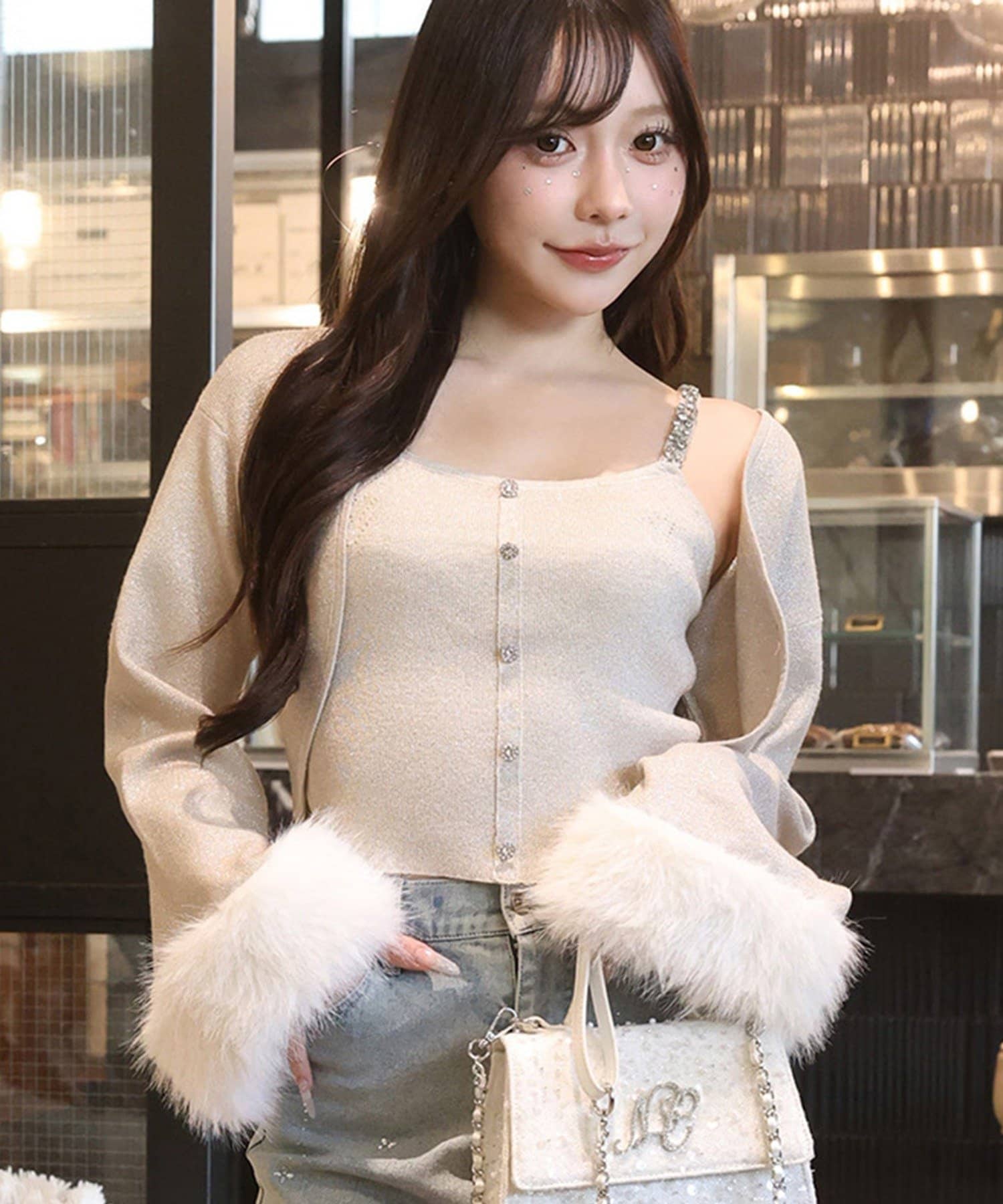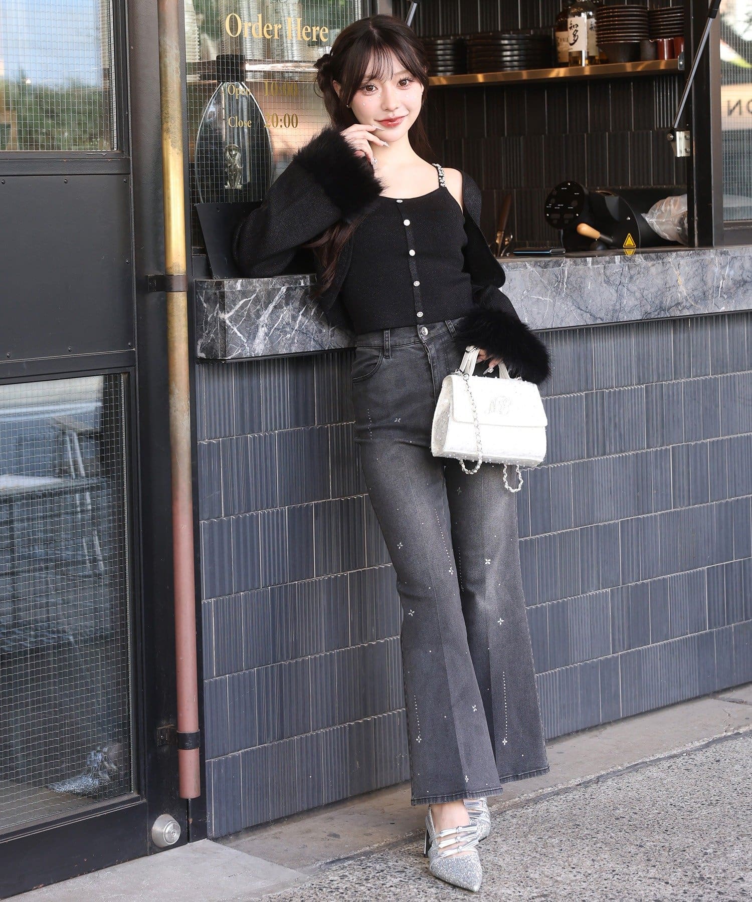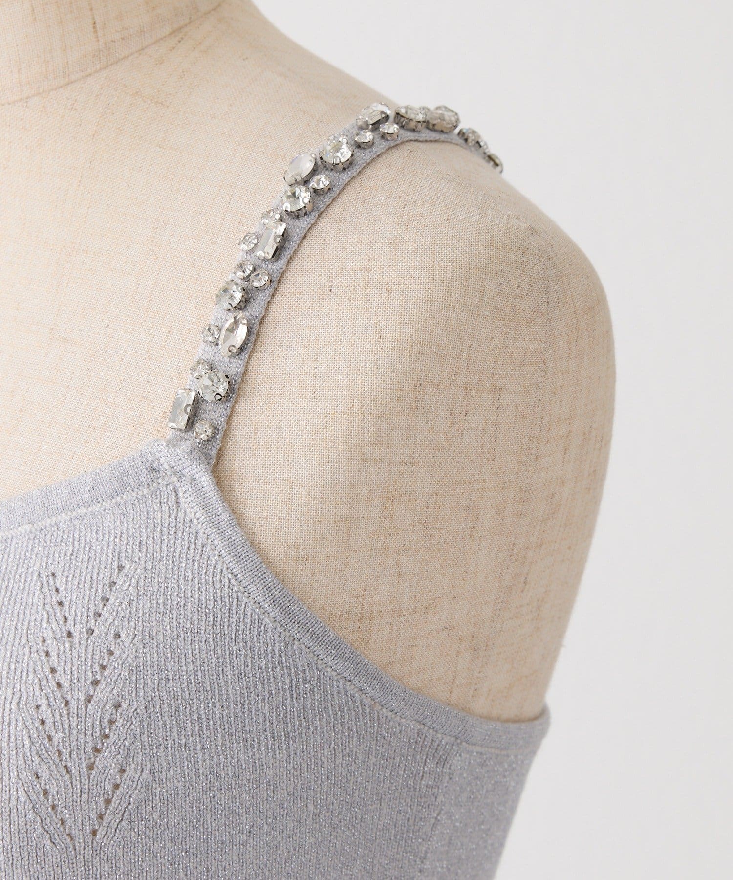 キラキラのビジューをあしらった肩デザインがポイントのニットキャミと、