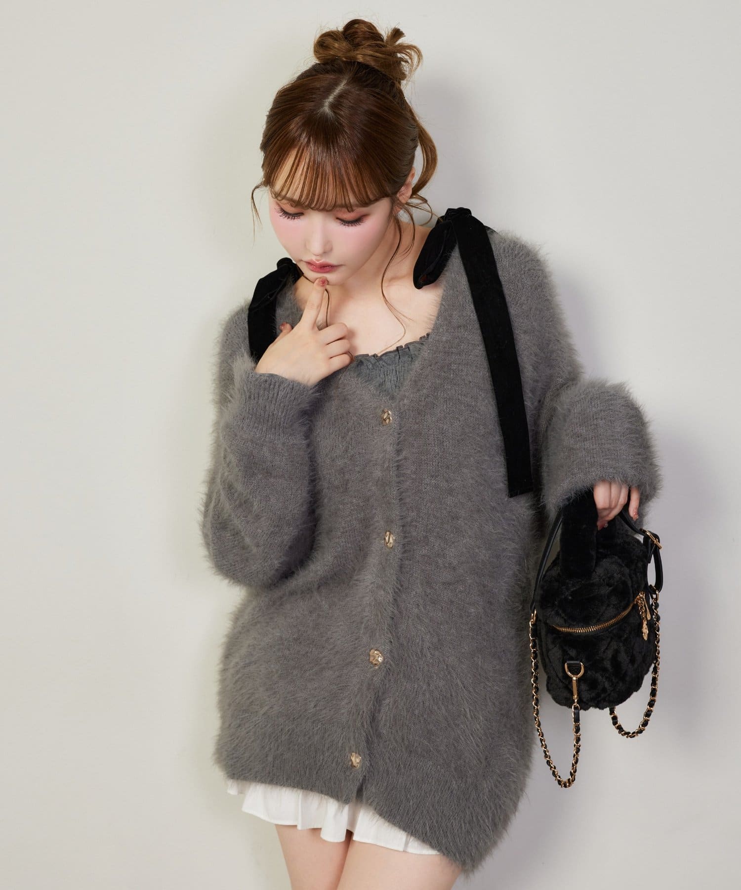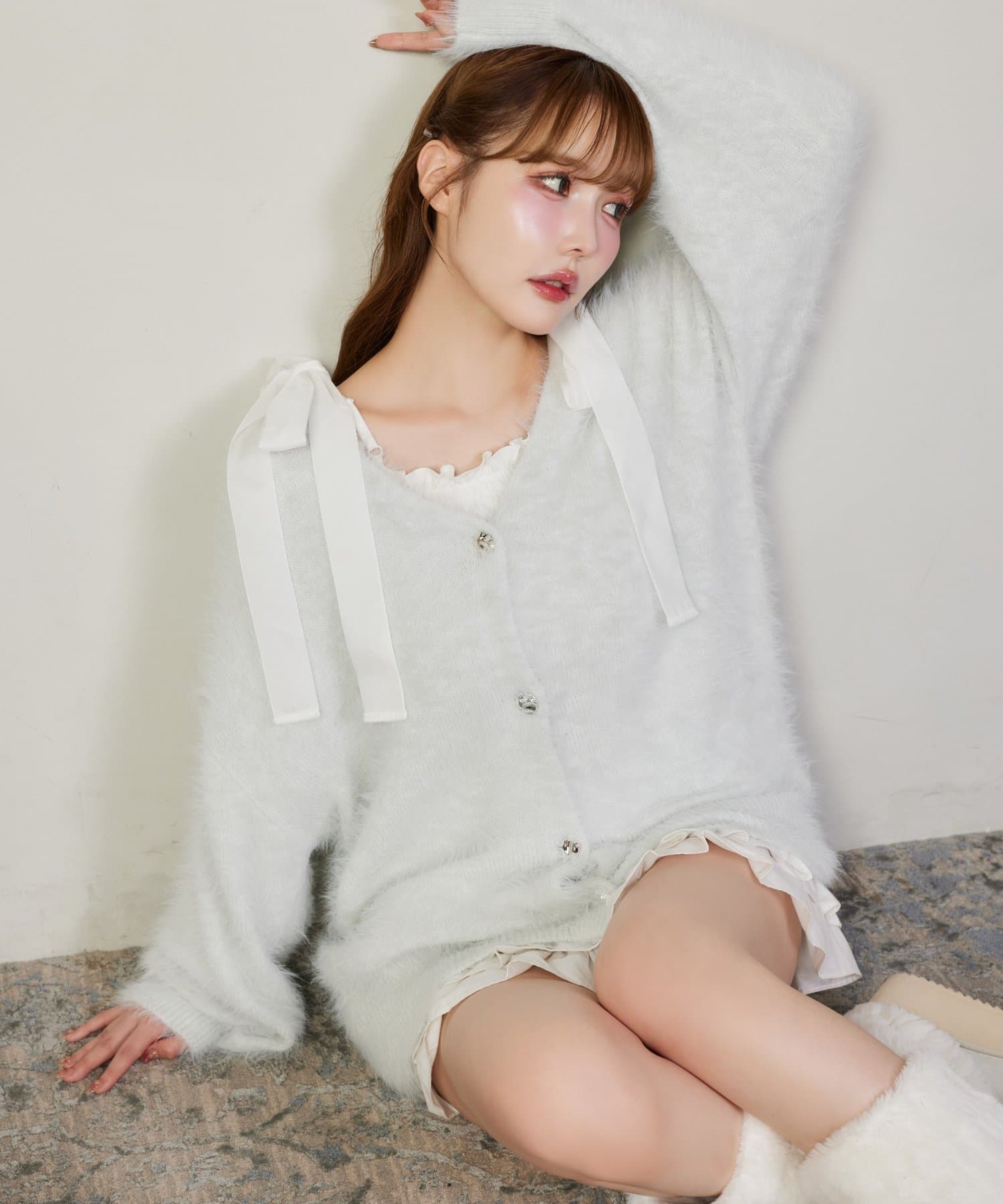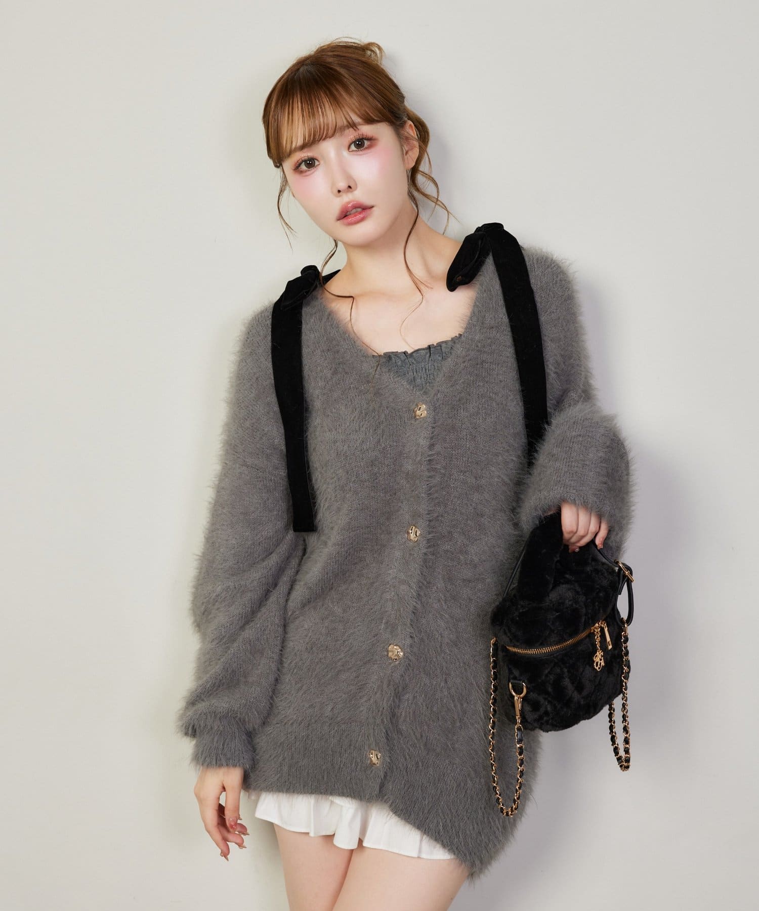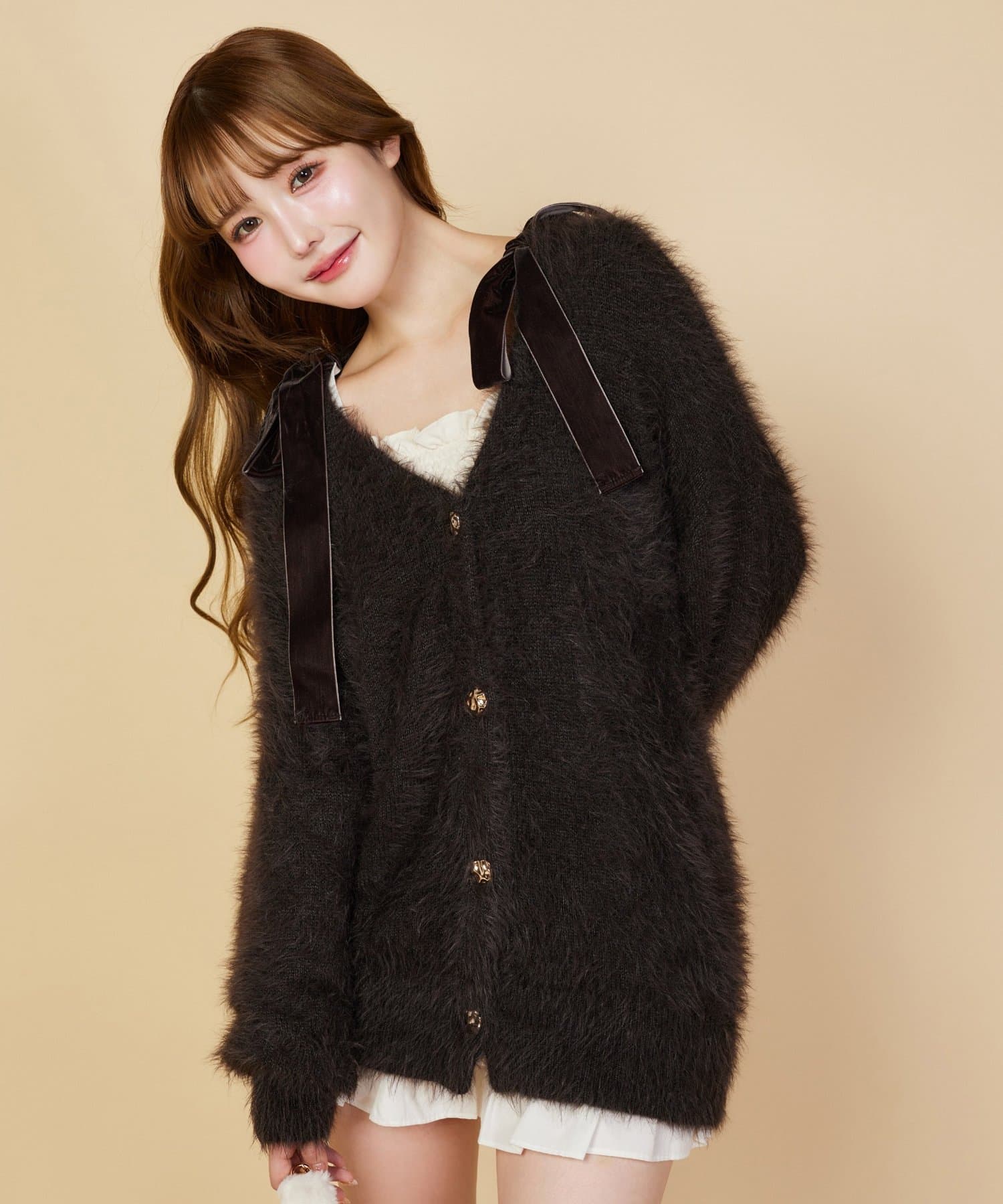 カーディガンの中からリボンをちら見せしても可愛く決まります。