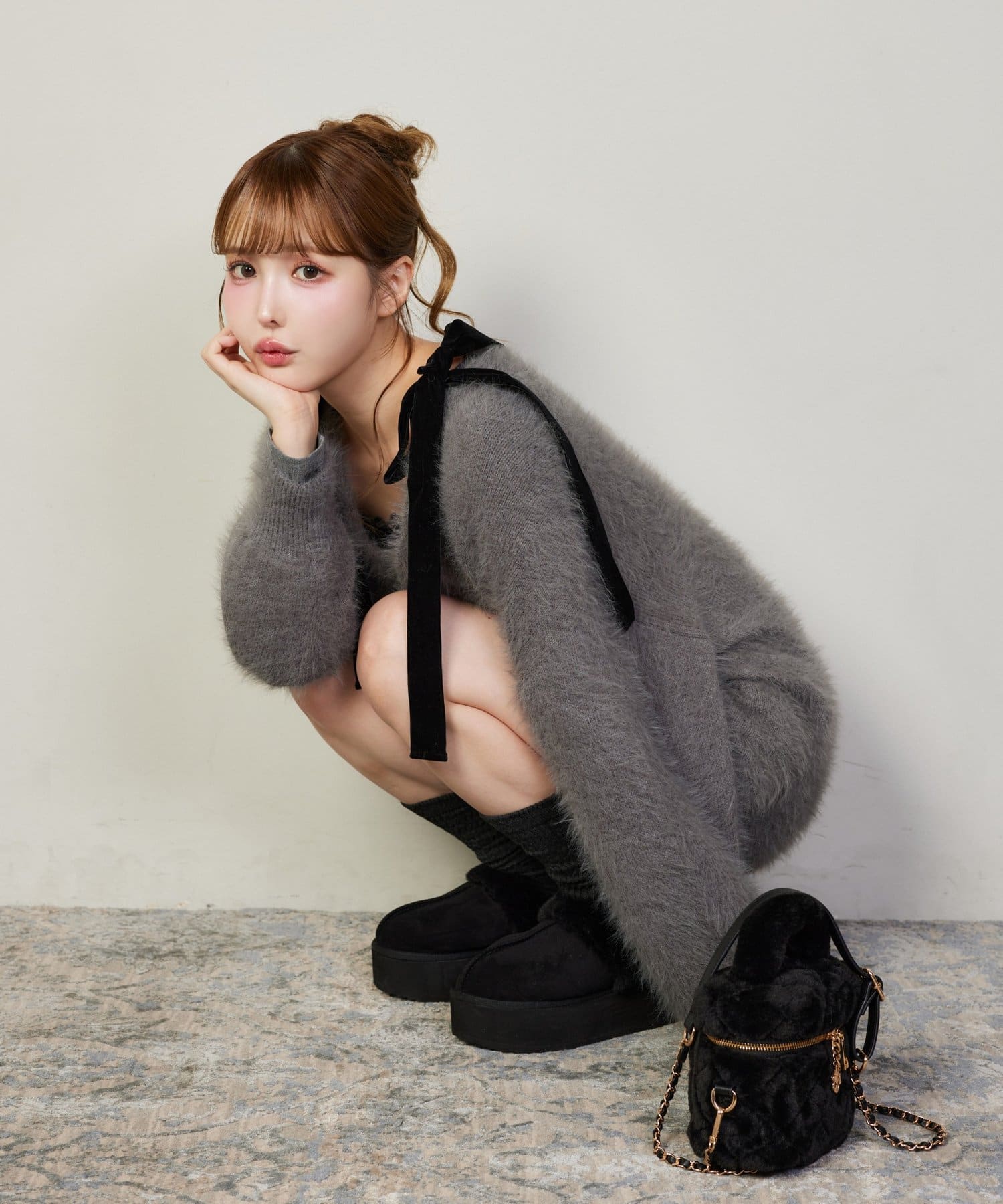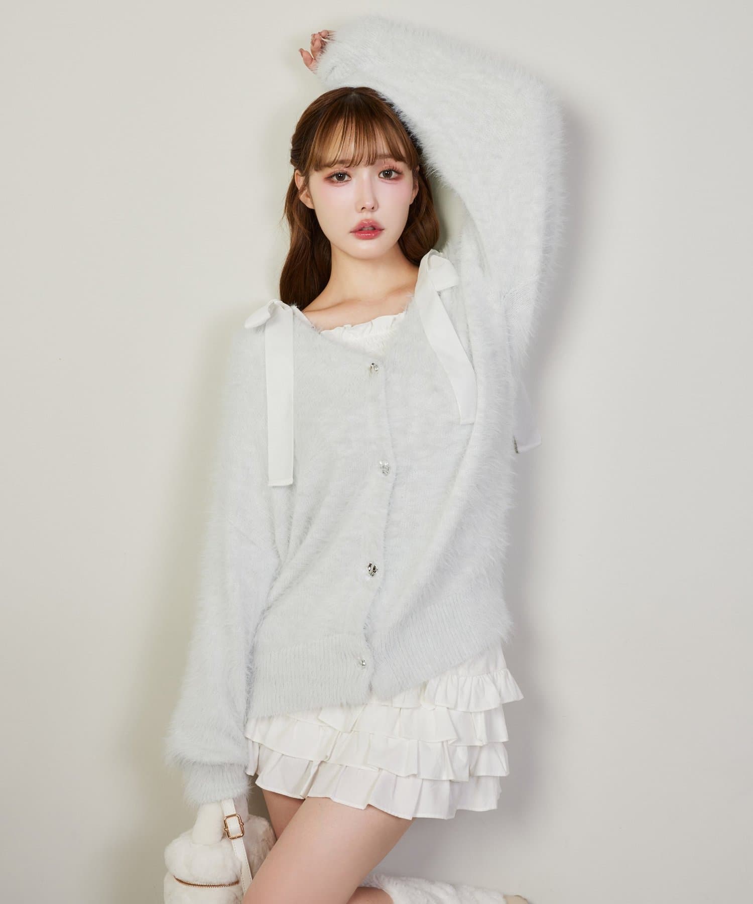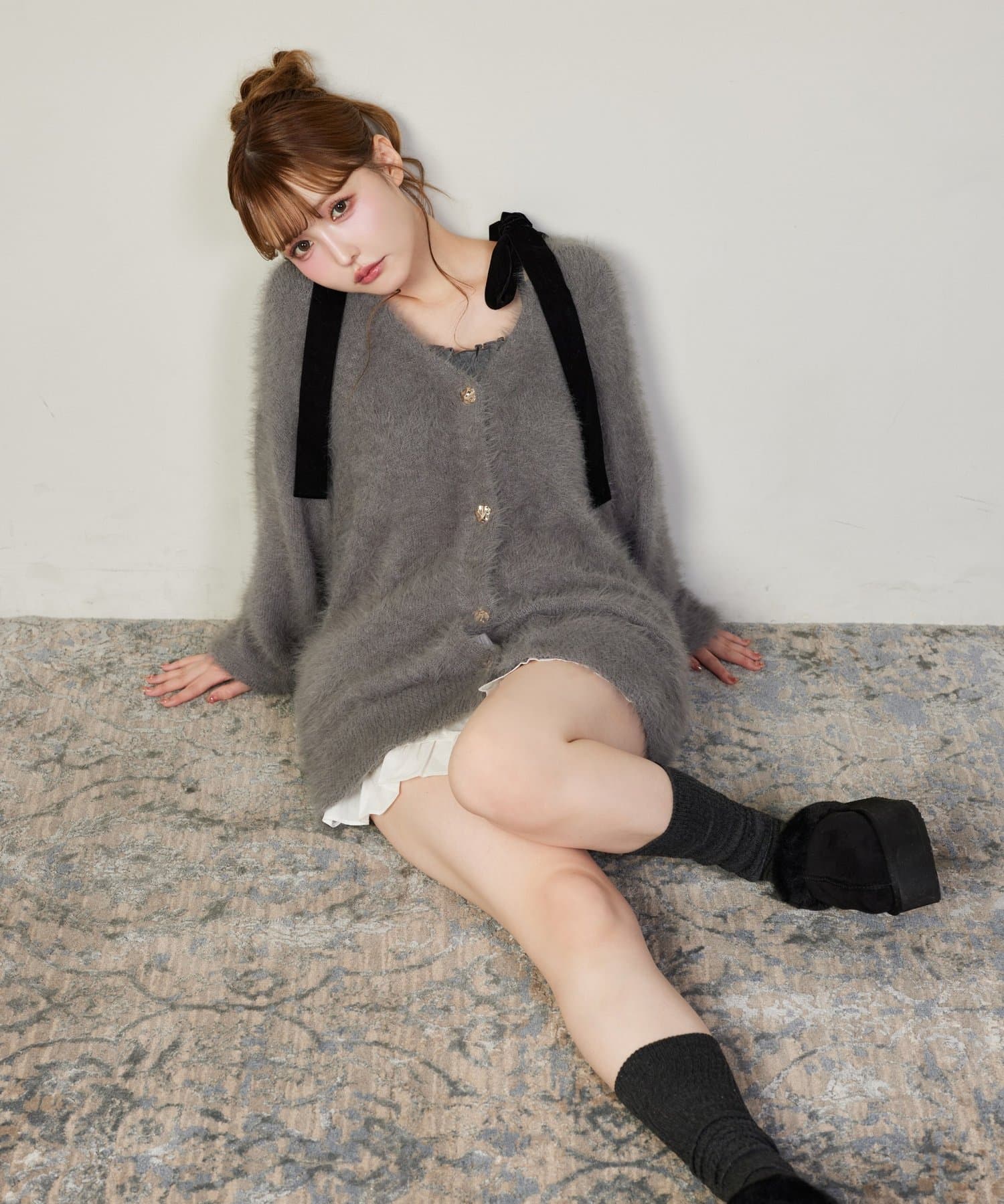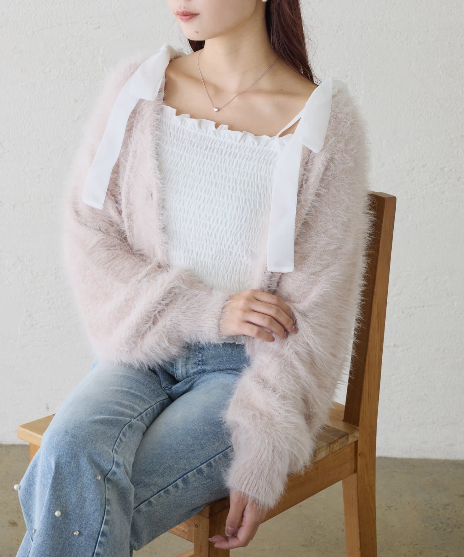 カーディガンの中からリボンをちら見せしても可愛く決まります。