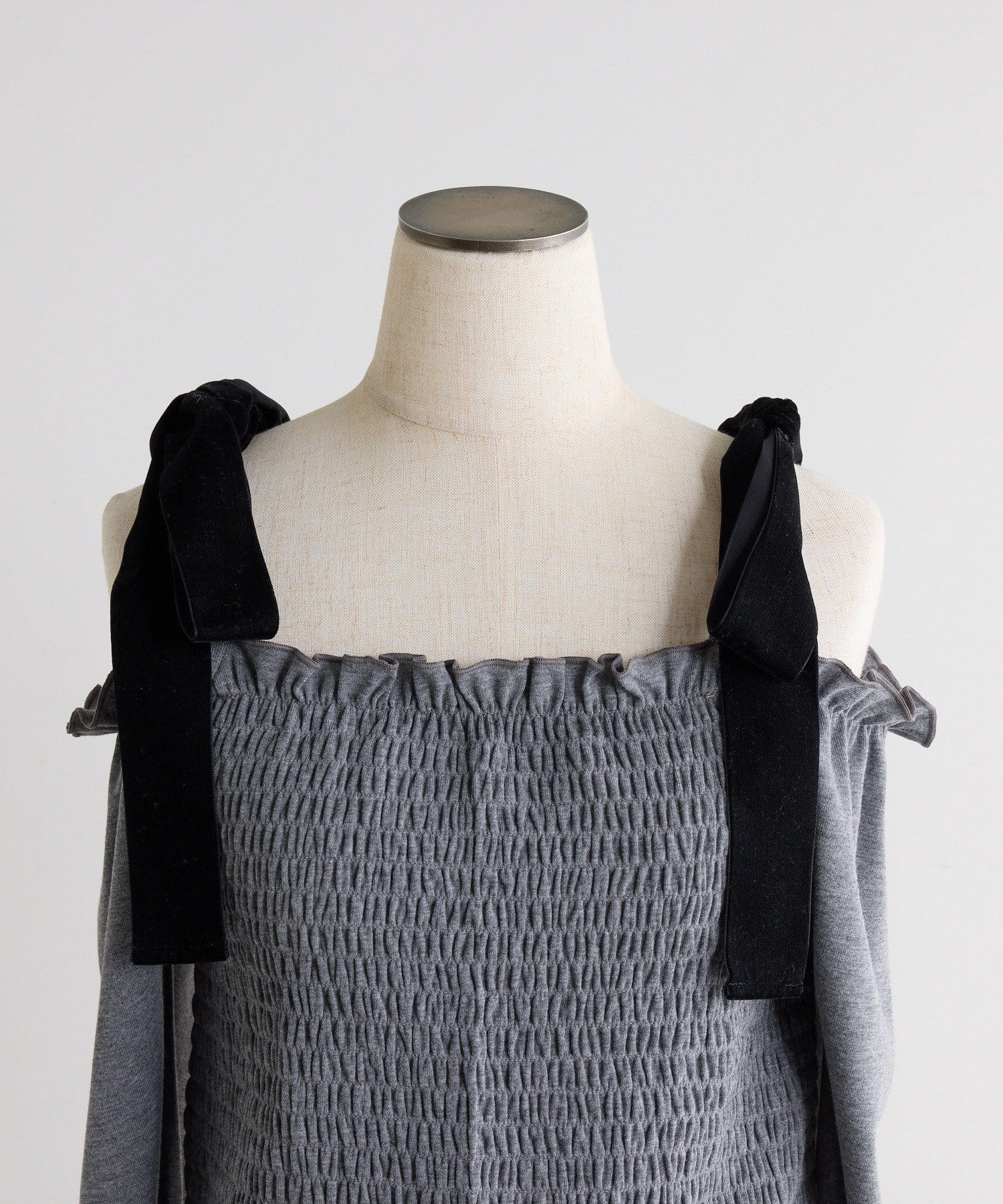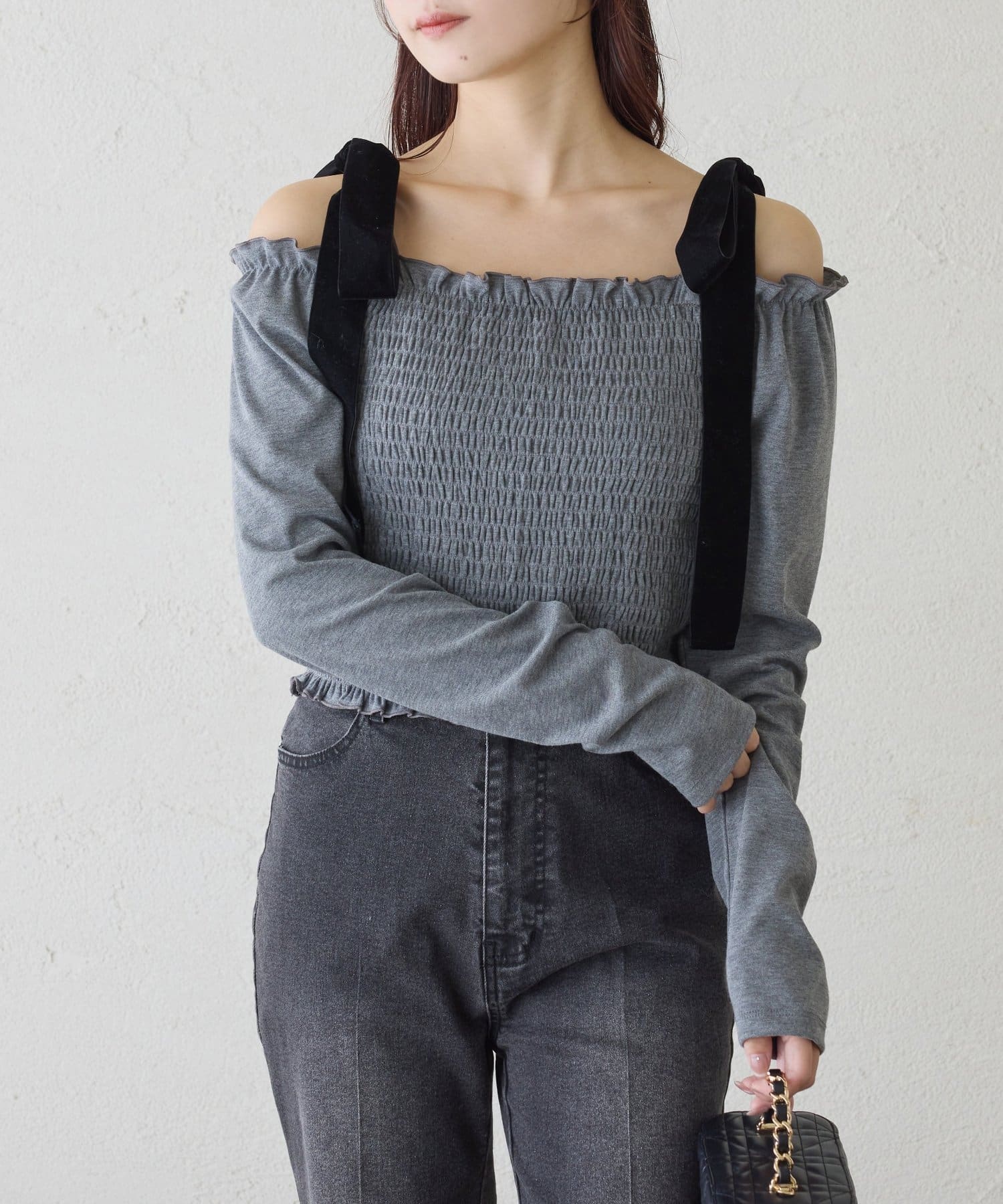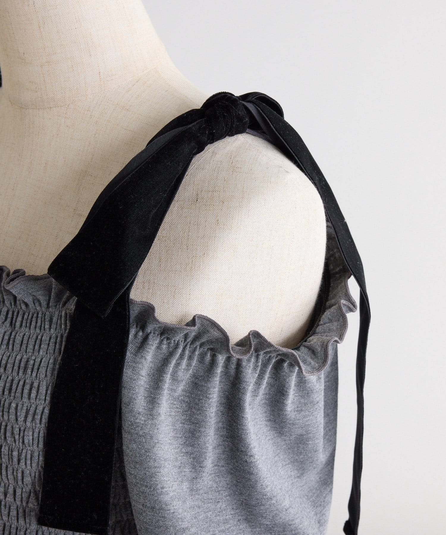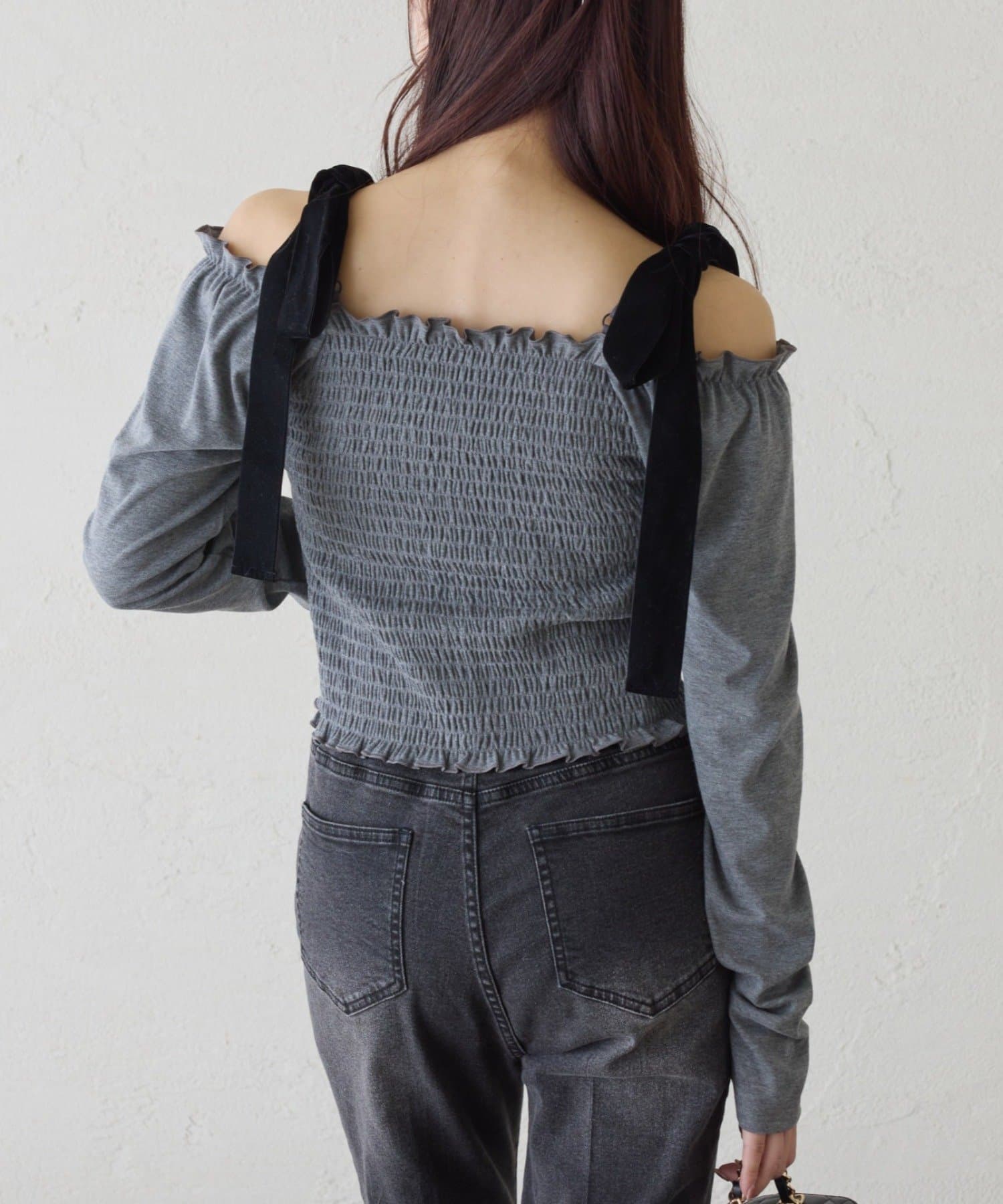 肩にはリボンがあしらわれていて、シンプルながらもガーリーなアクセントをプラスしてくれます。