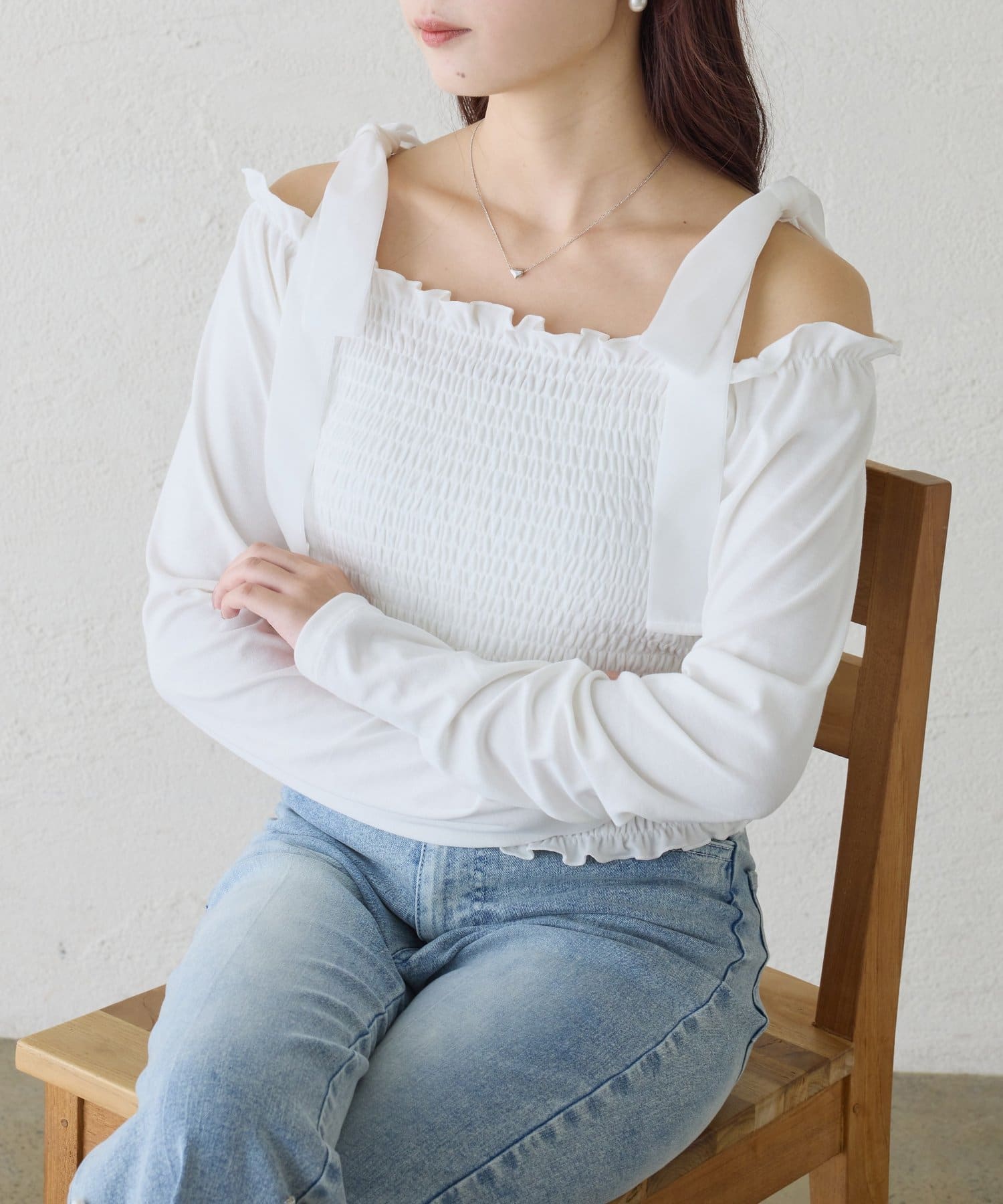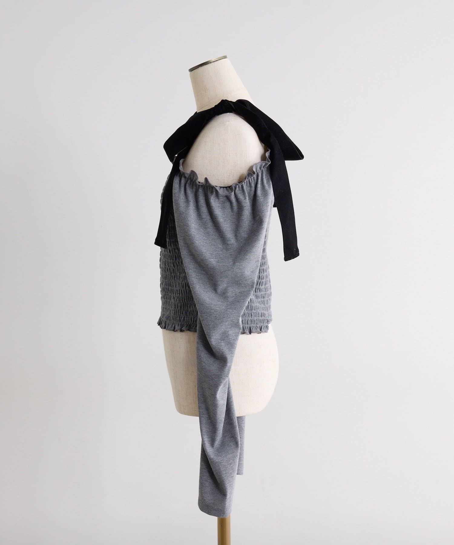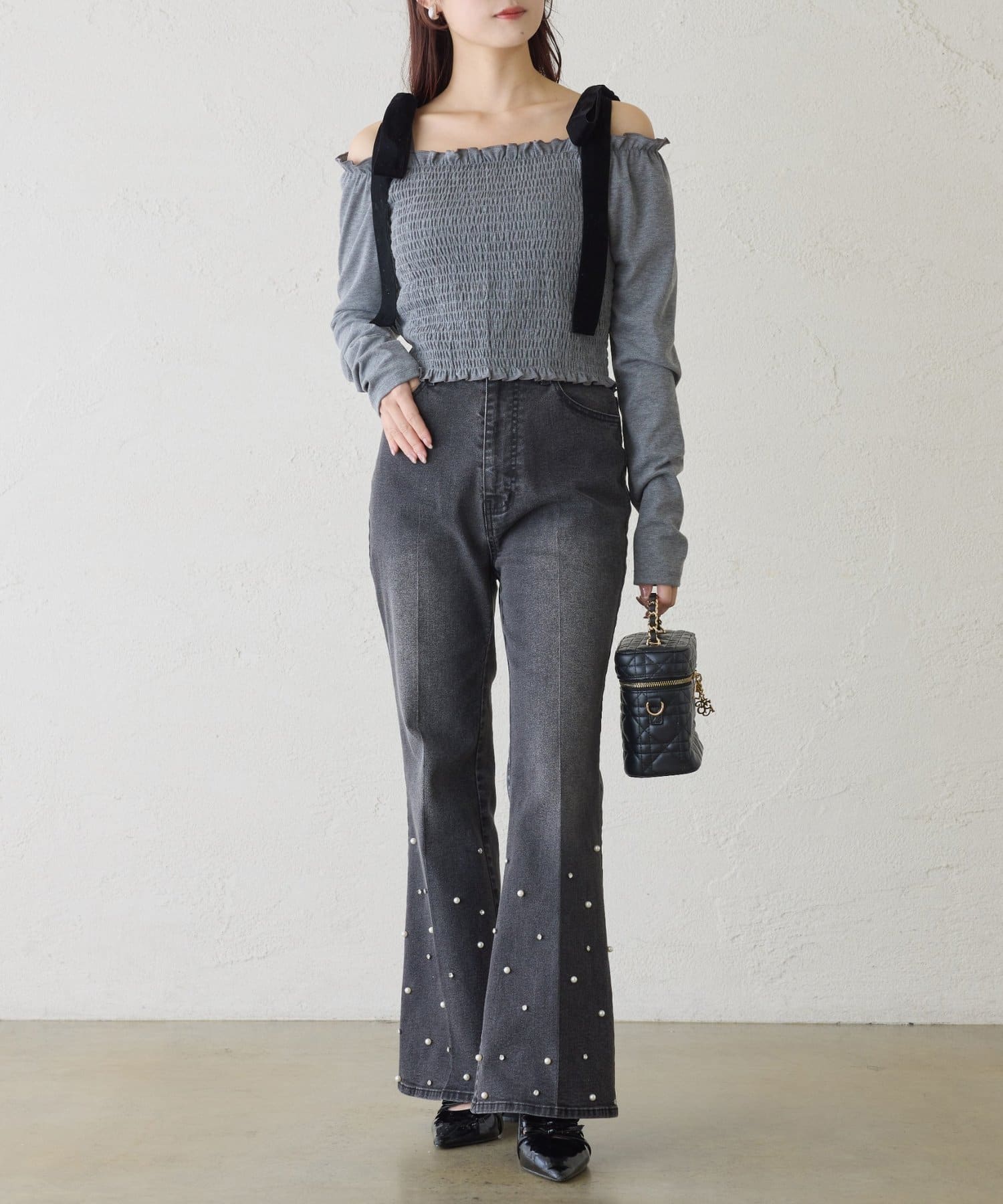 肩にはリボンがあしらわれていて、シンプルながらもガーリーなアクセントをプラスしてくれます。