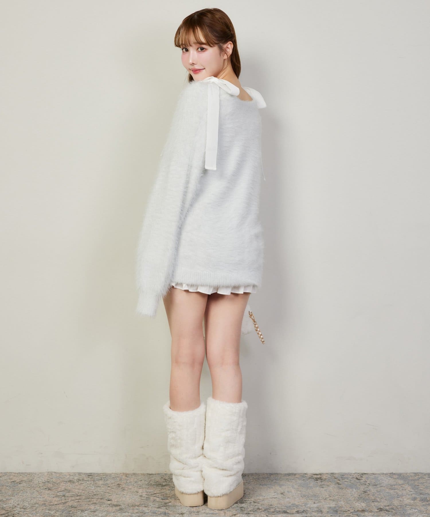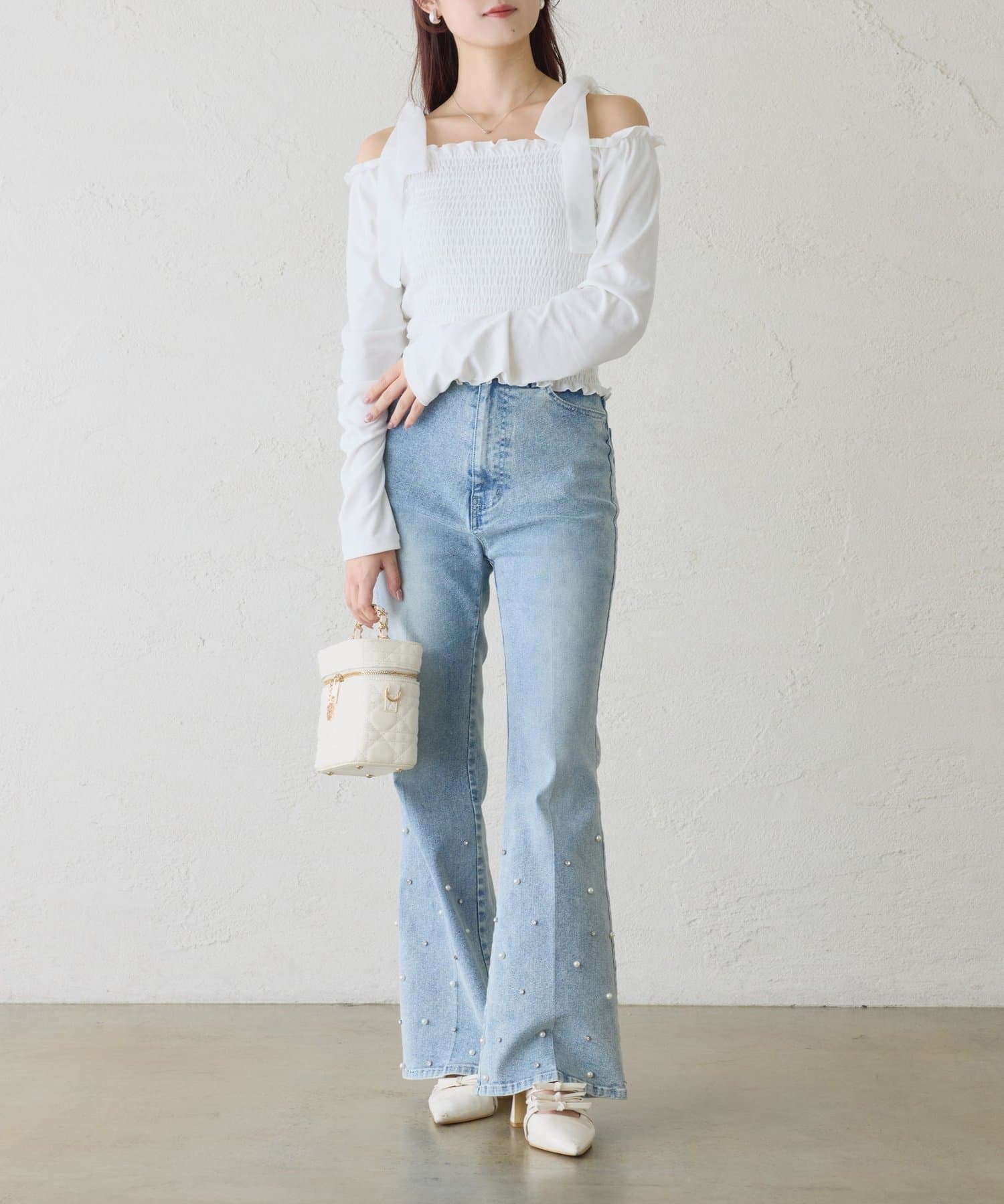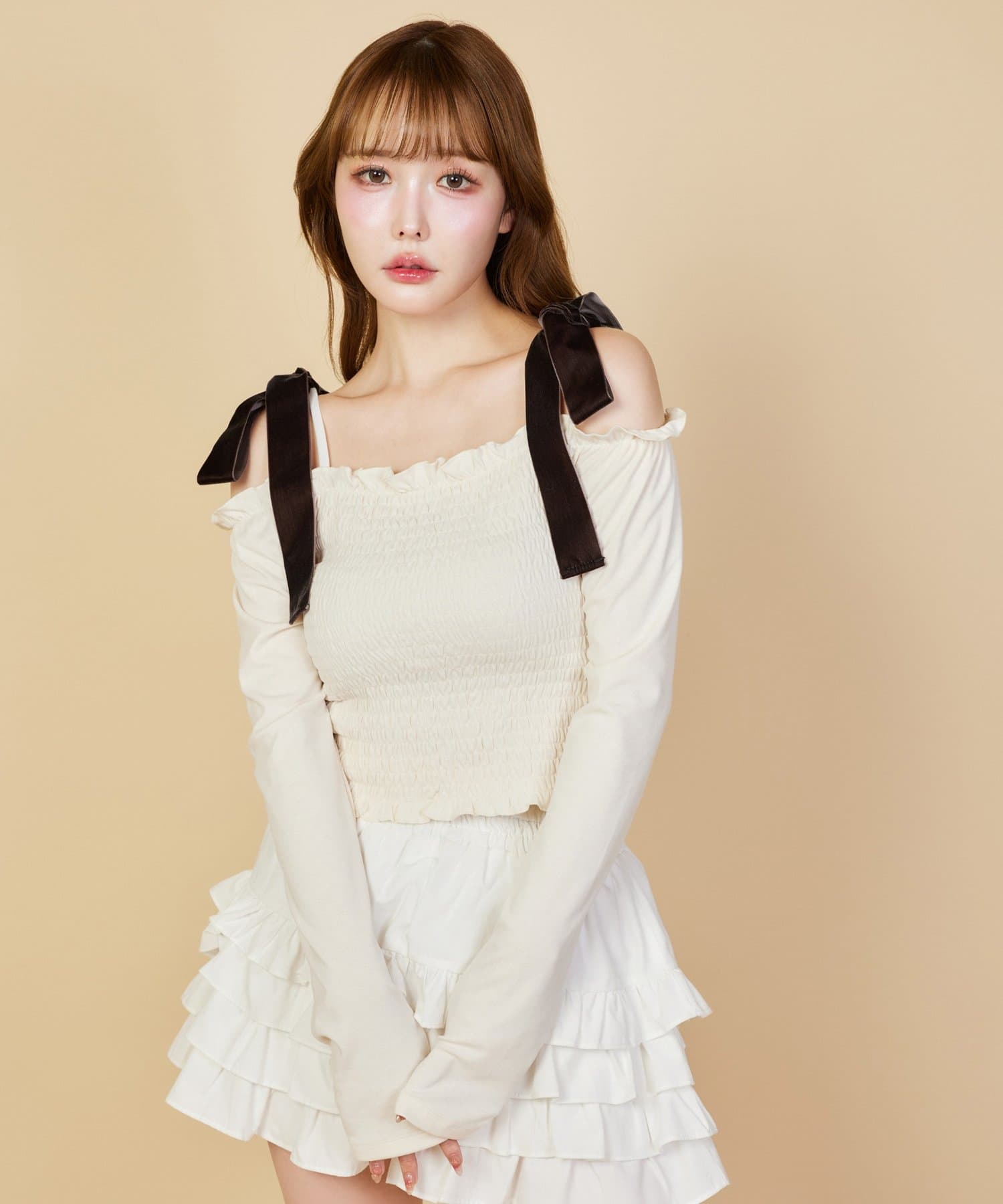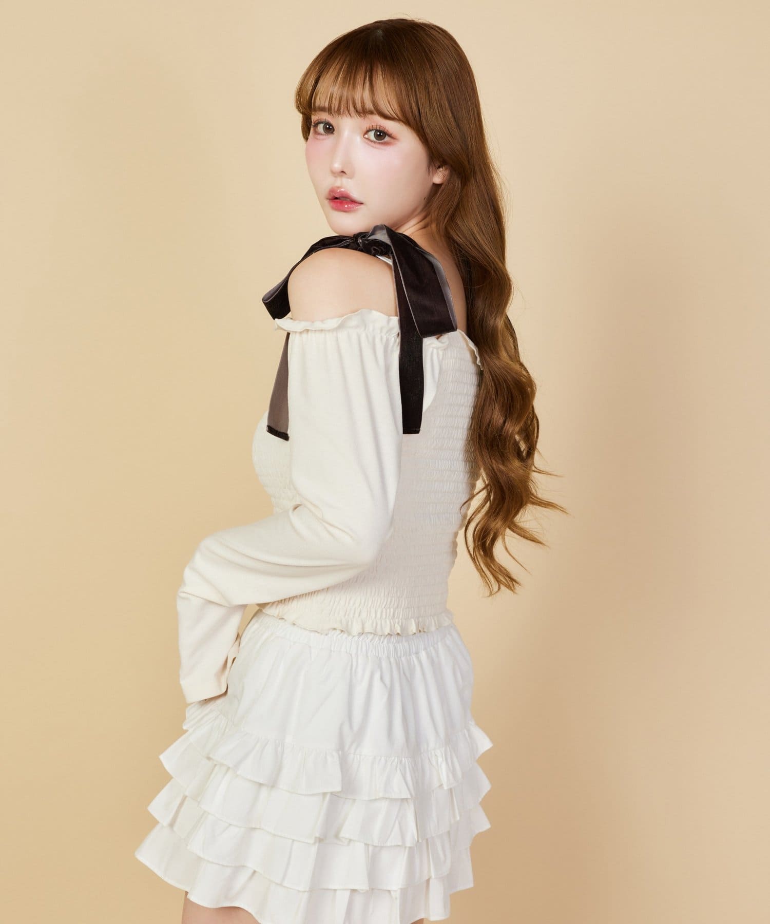 肩にはリボンがあしらわれていて、シンプルながらもガーリーなアクセントをプラスしてくれます。