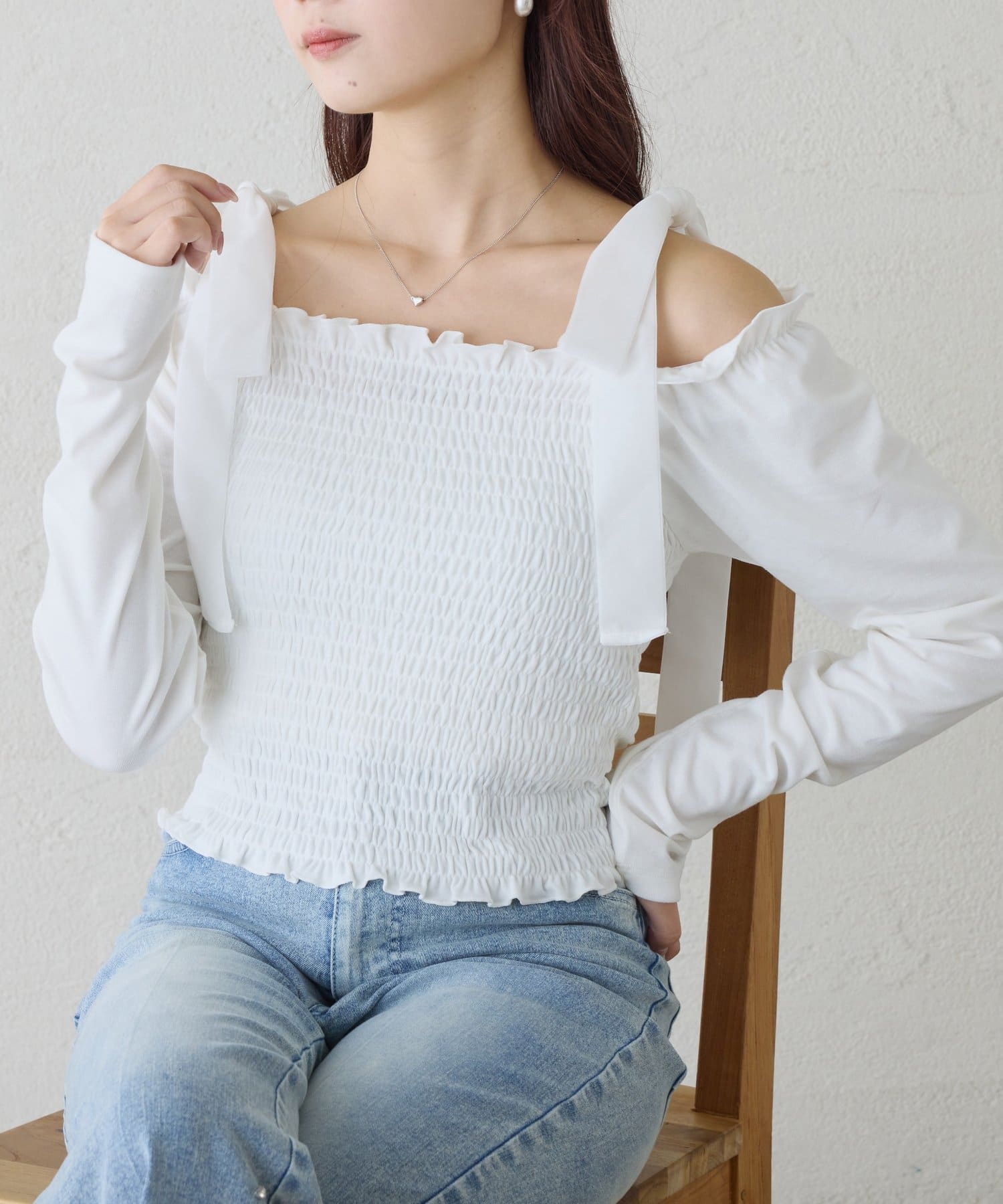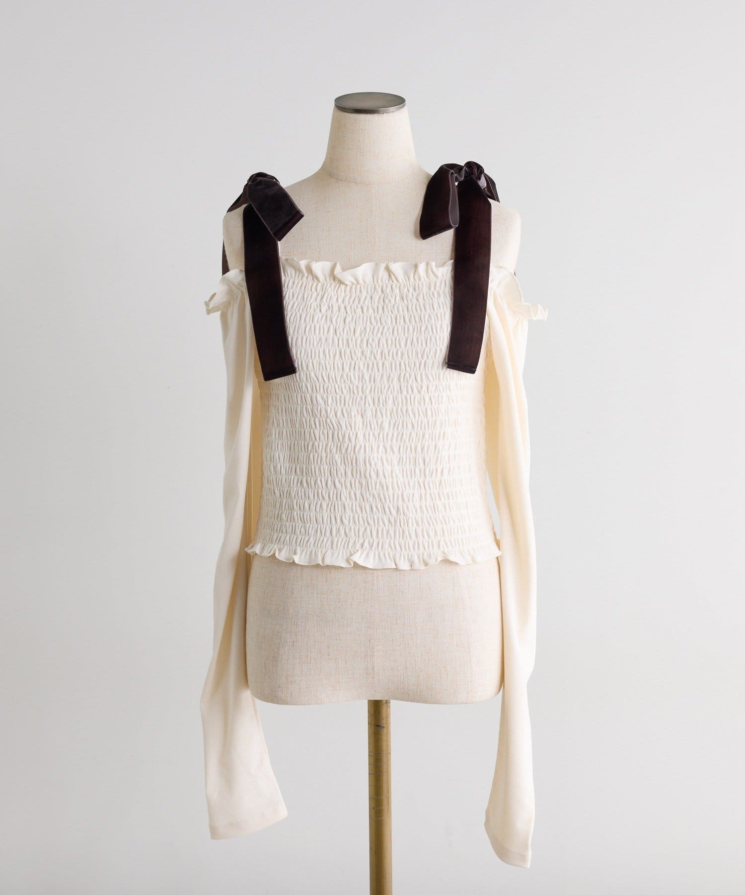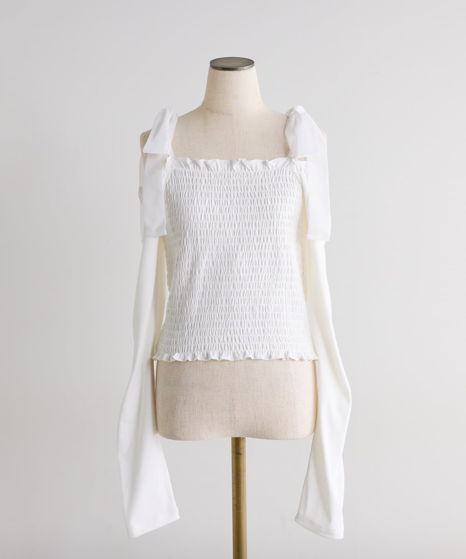 長袖シャーリング肩リボントップス