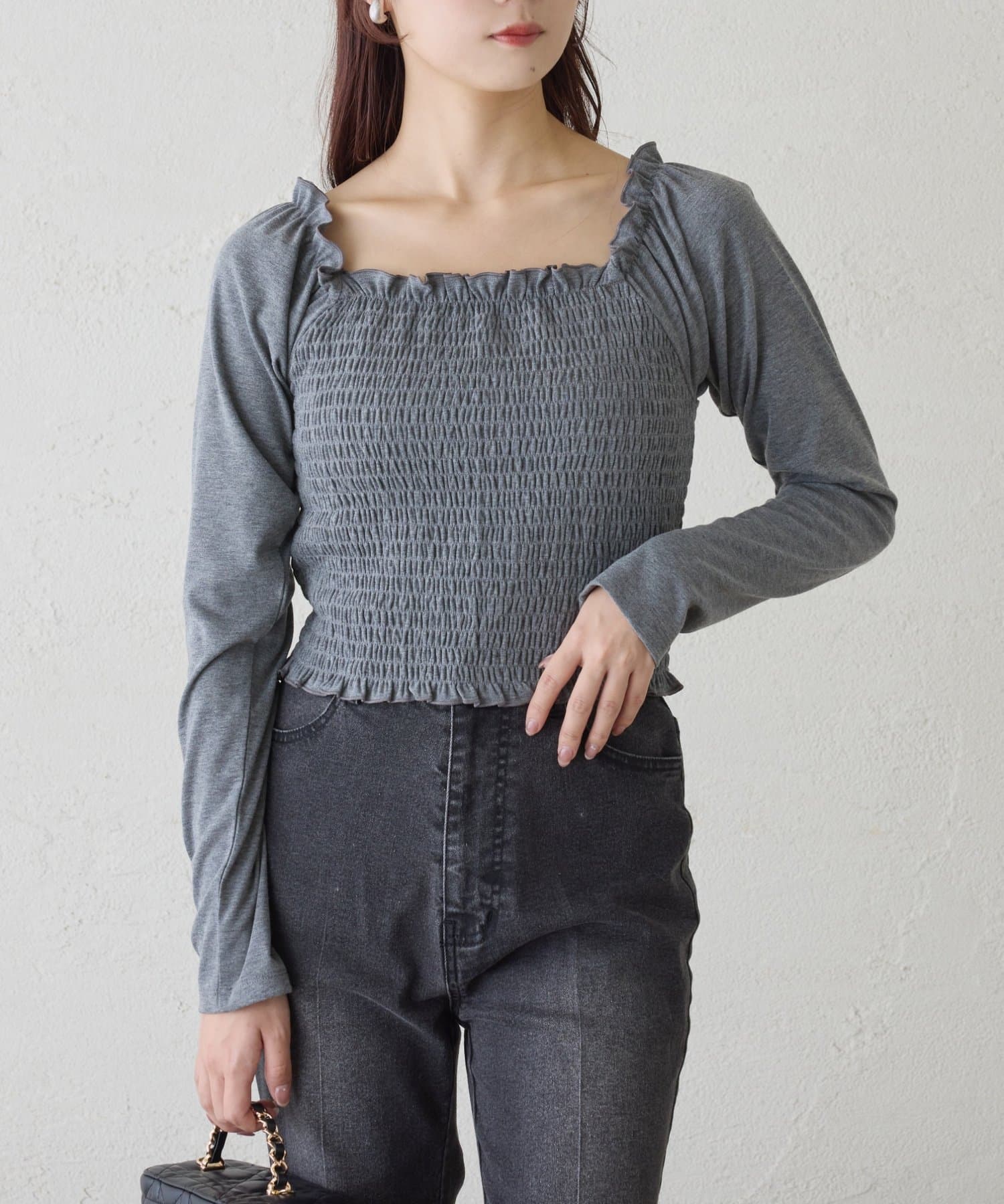 全体にシャーリングを効かせた、フィット感のあるトップス。