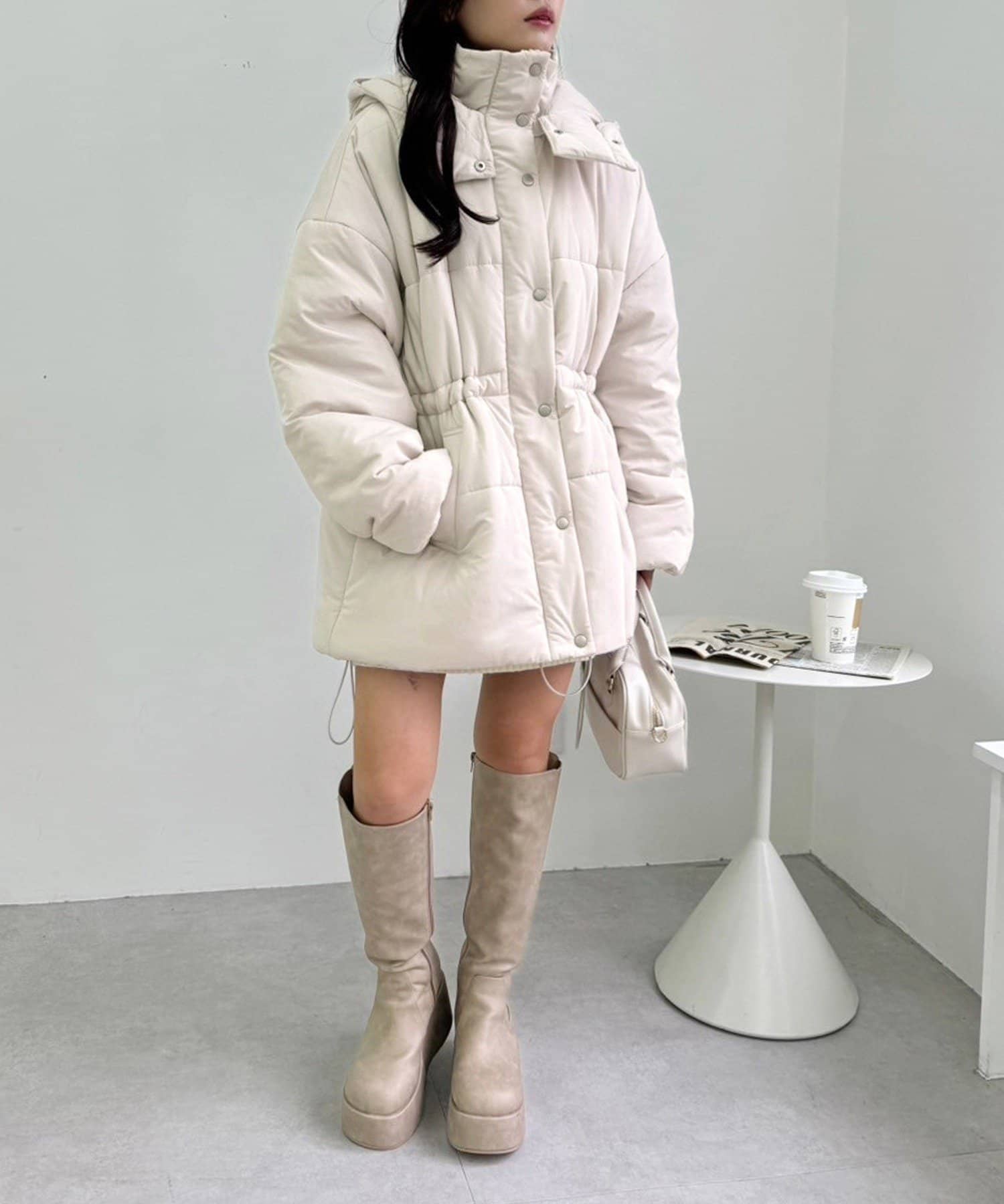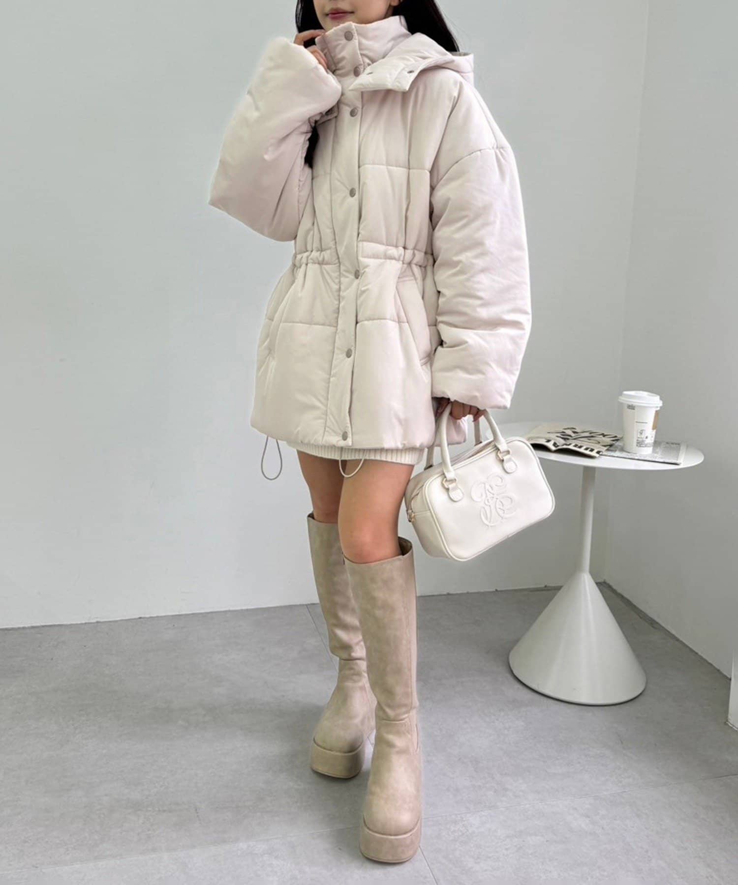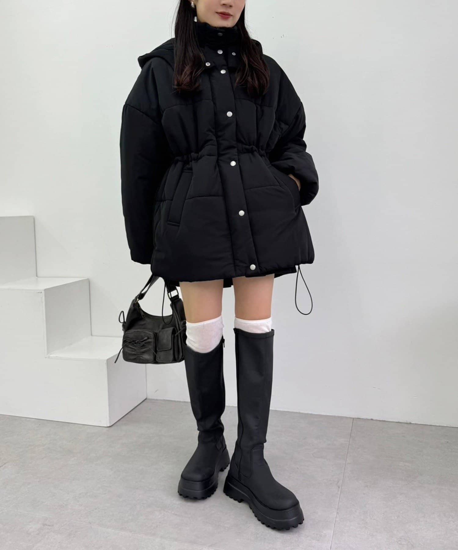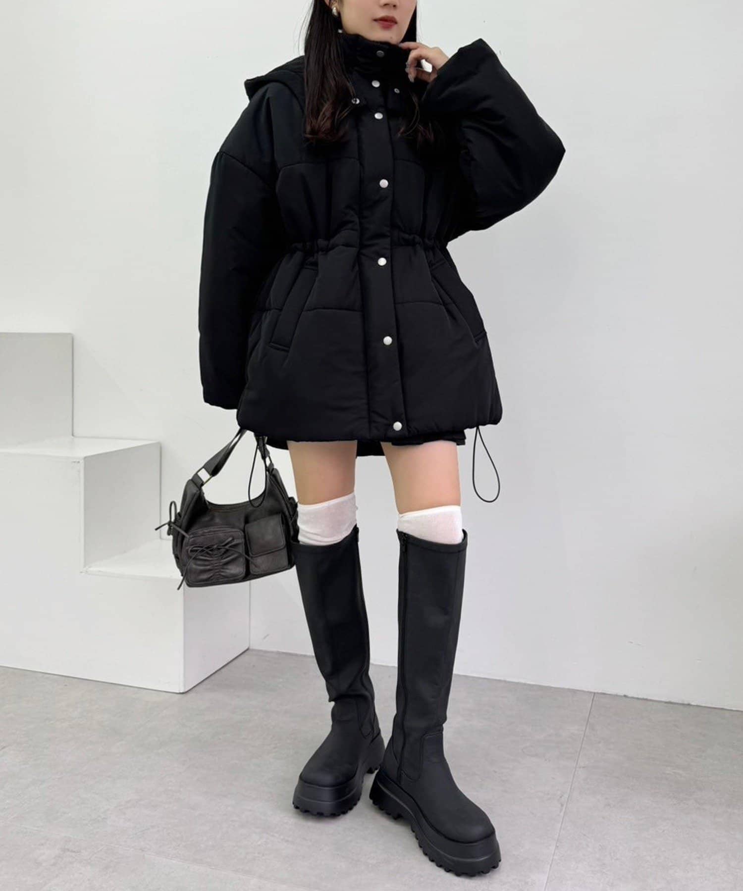 ミニボトムならコートのウエストを絞ってロングブーツと合わせるのがオススメです。