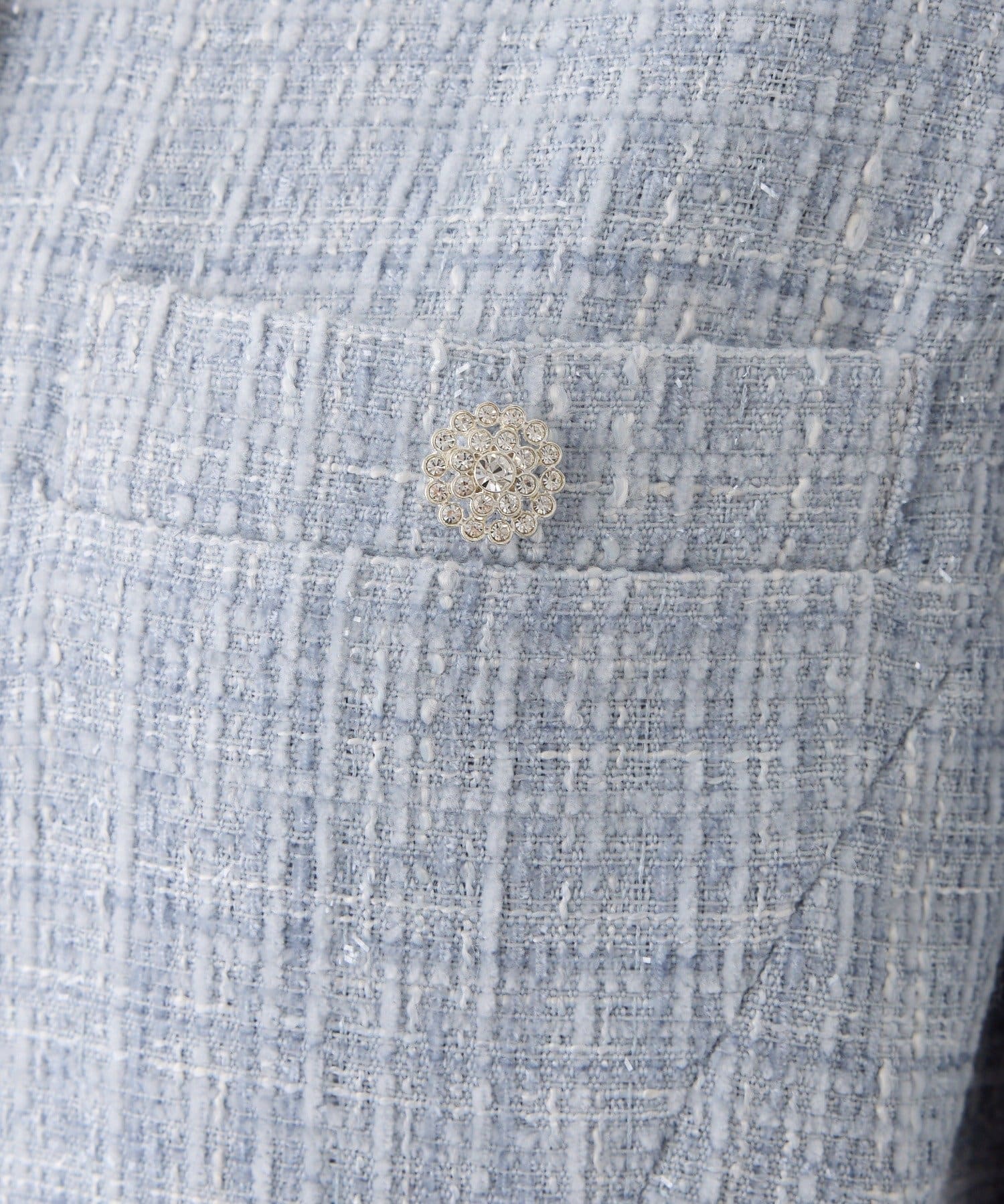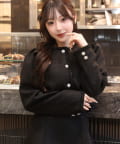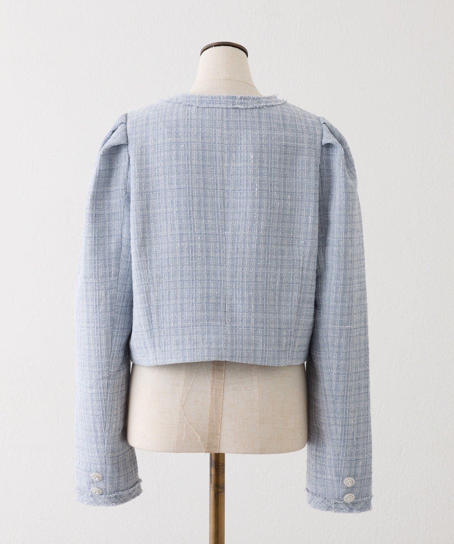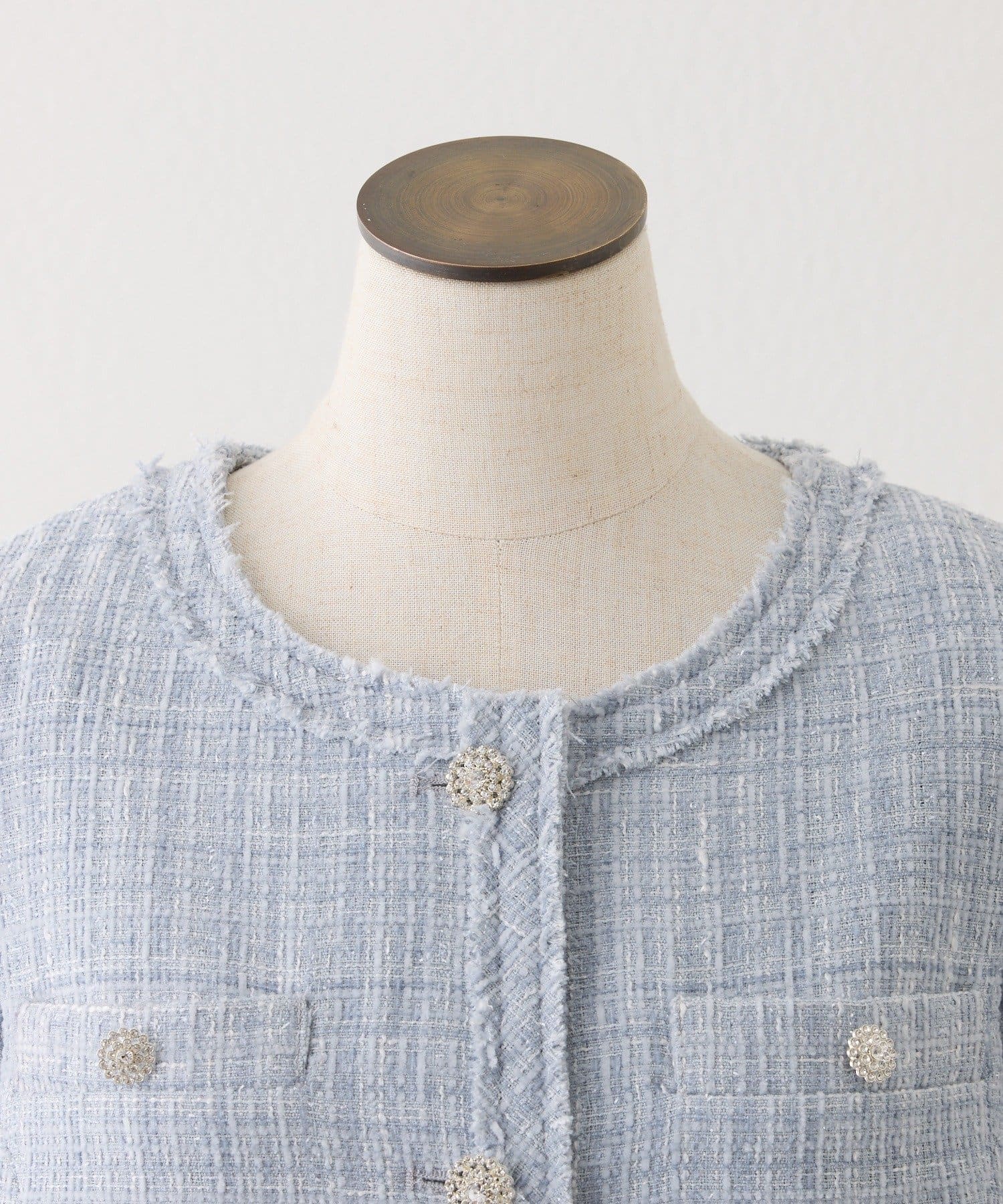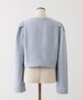 上品なノーカラーシルエットに、キラキラのボタンをプラスした華やかなジャケット。