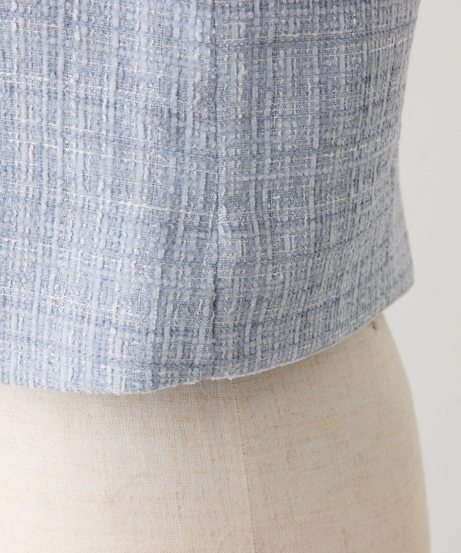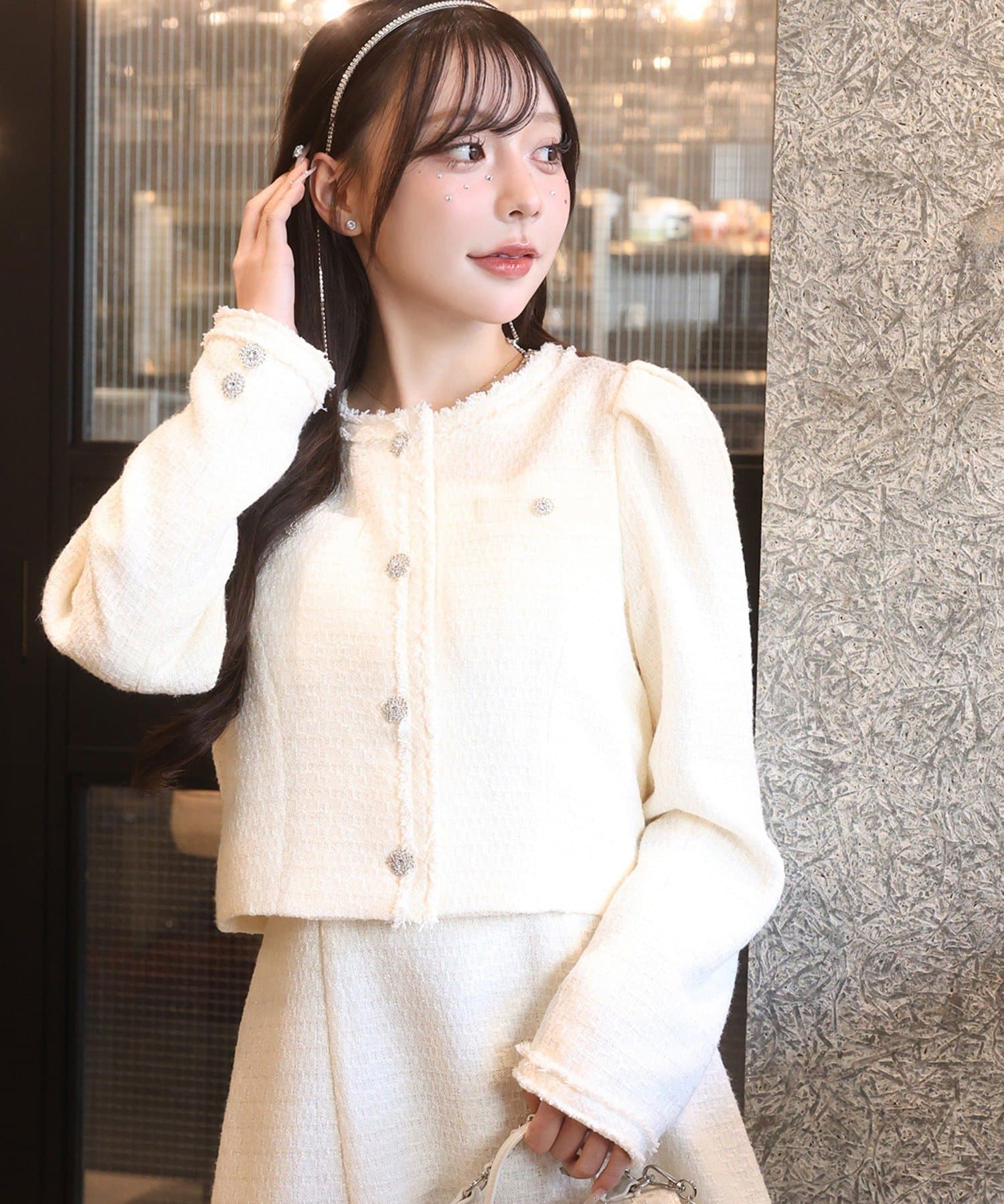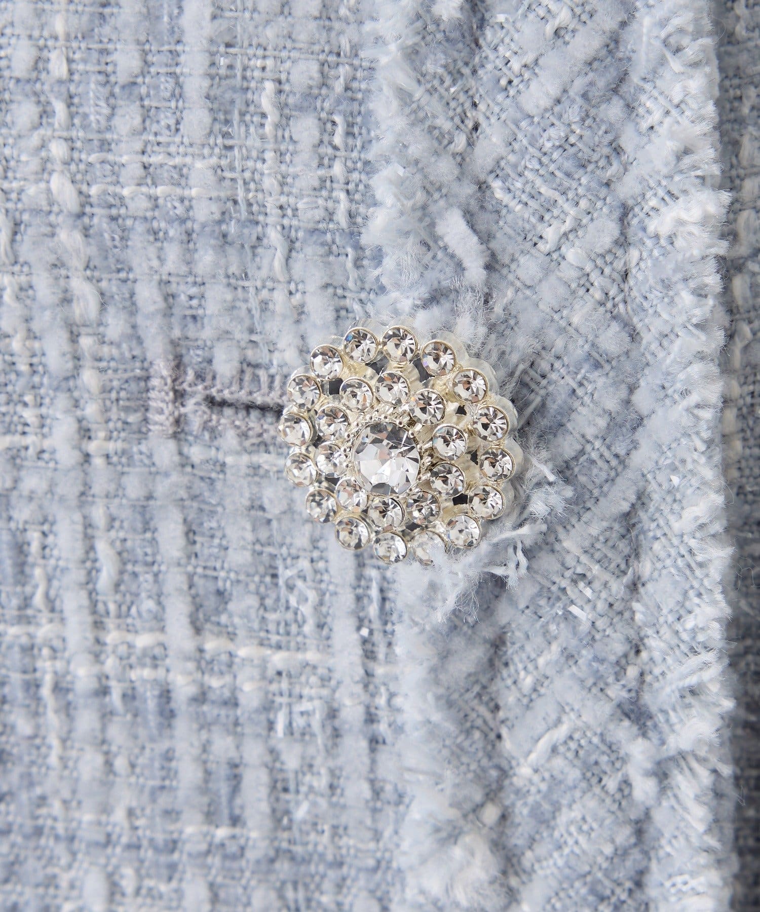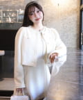 上品なノーカラーシルエットに、キラキラのボタンをプラスした華やかなジャケット。