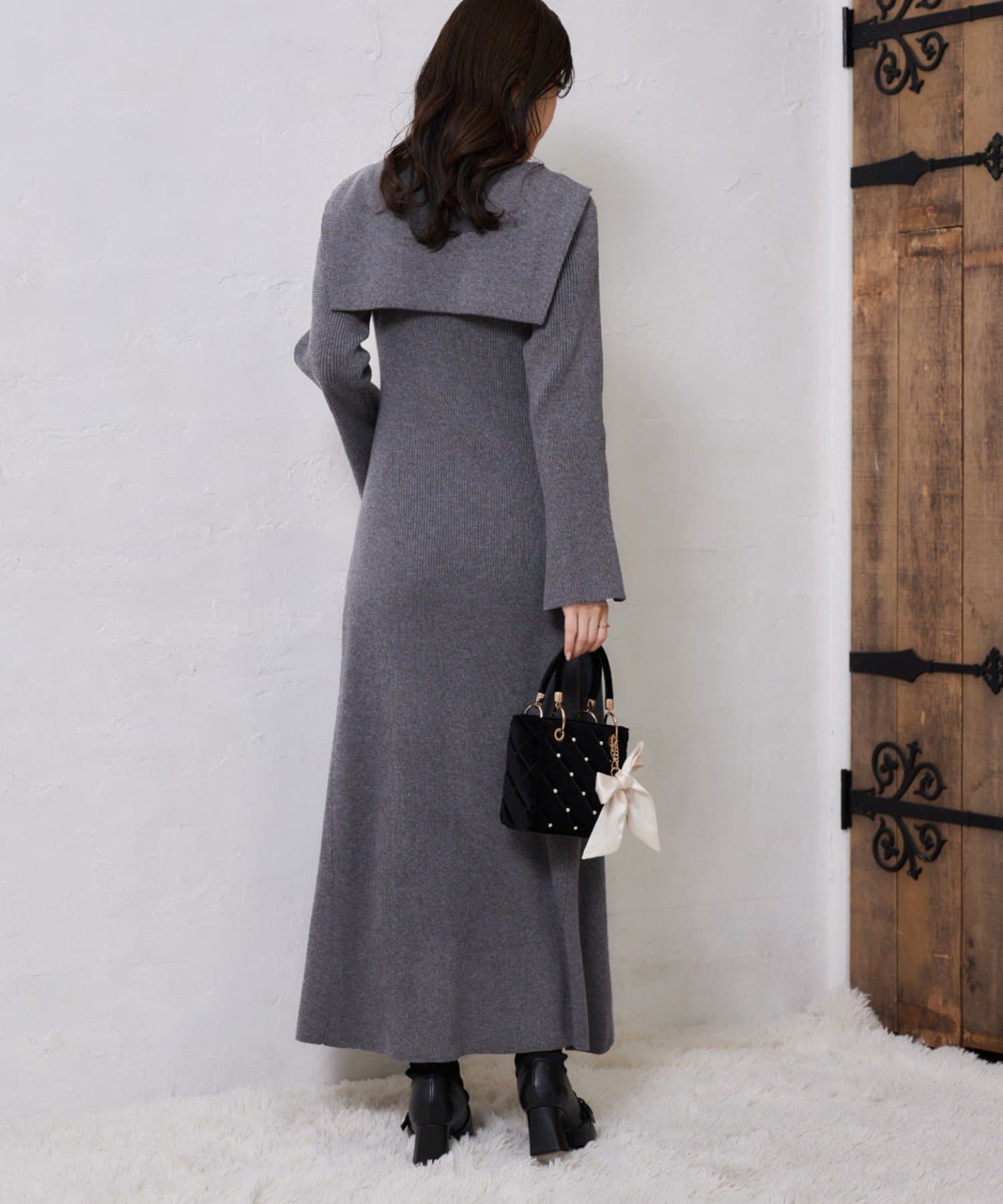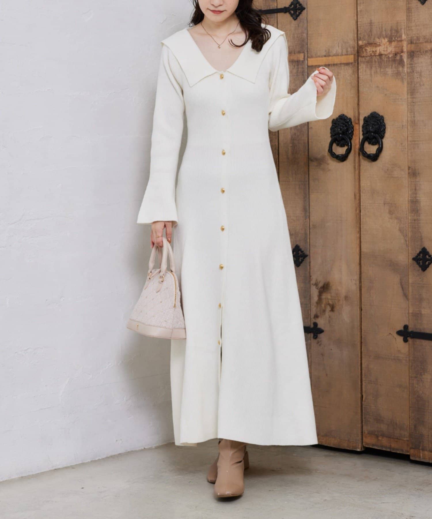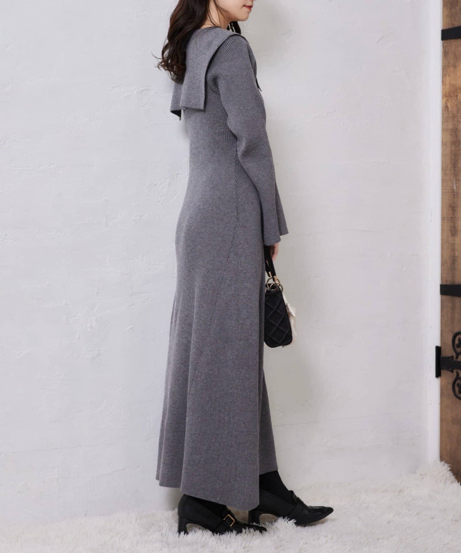 美シルエットに仕上がるセーラー襟のロングニットワンピース。