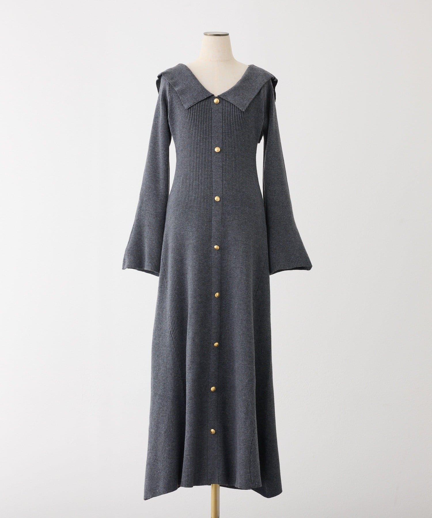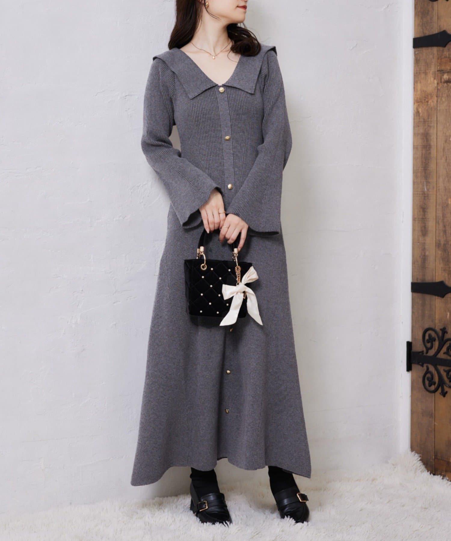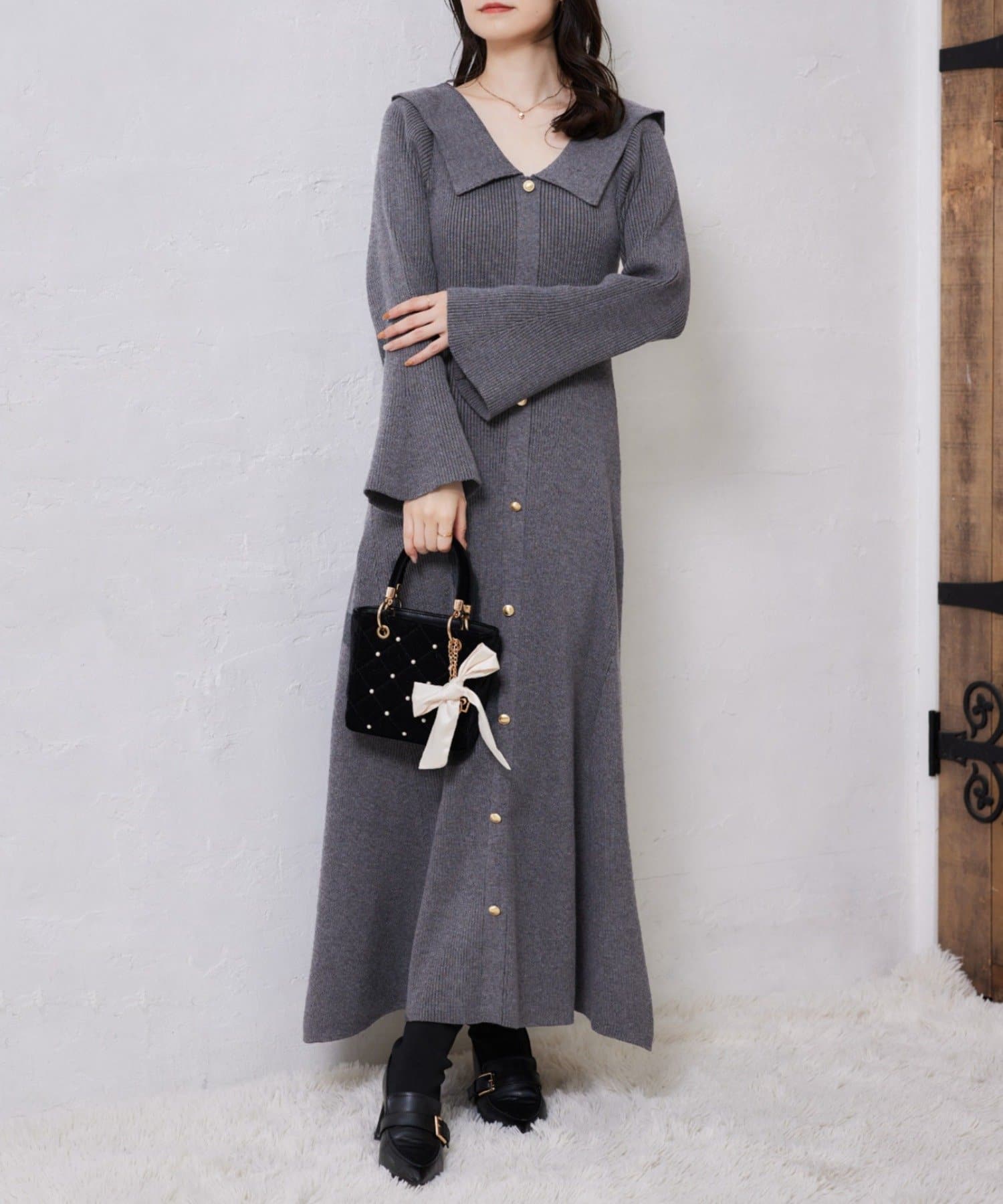 美シルエットに仕上がるセーラー襟のロングニットワンピース。