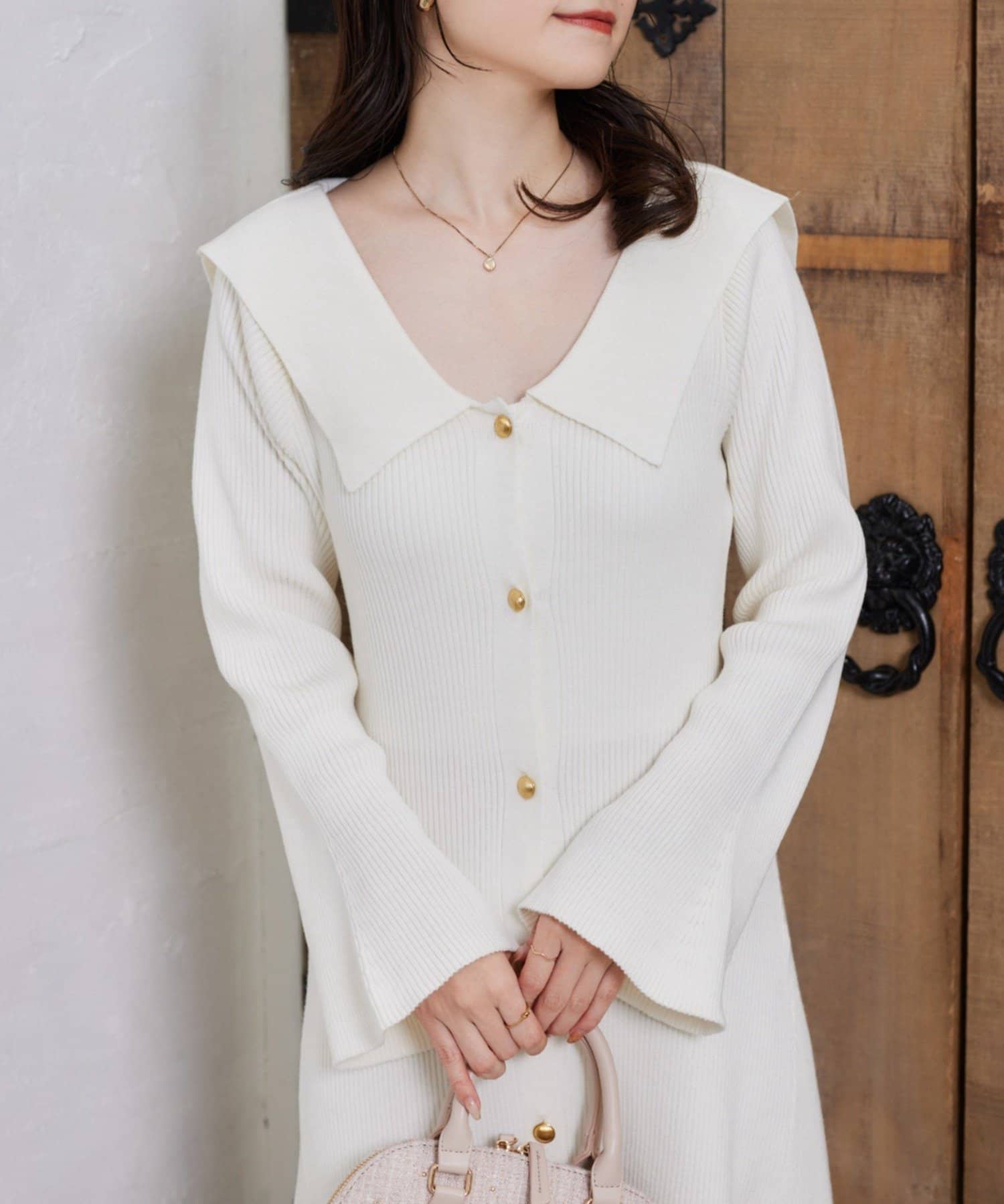 ゆったり感のあるニット素材ながらも、襟デザインとシルエットで女性らしいラインを演出。