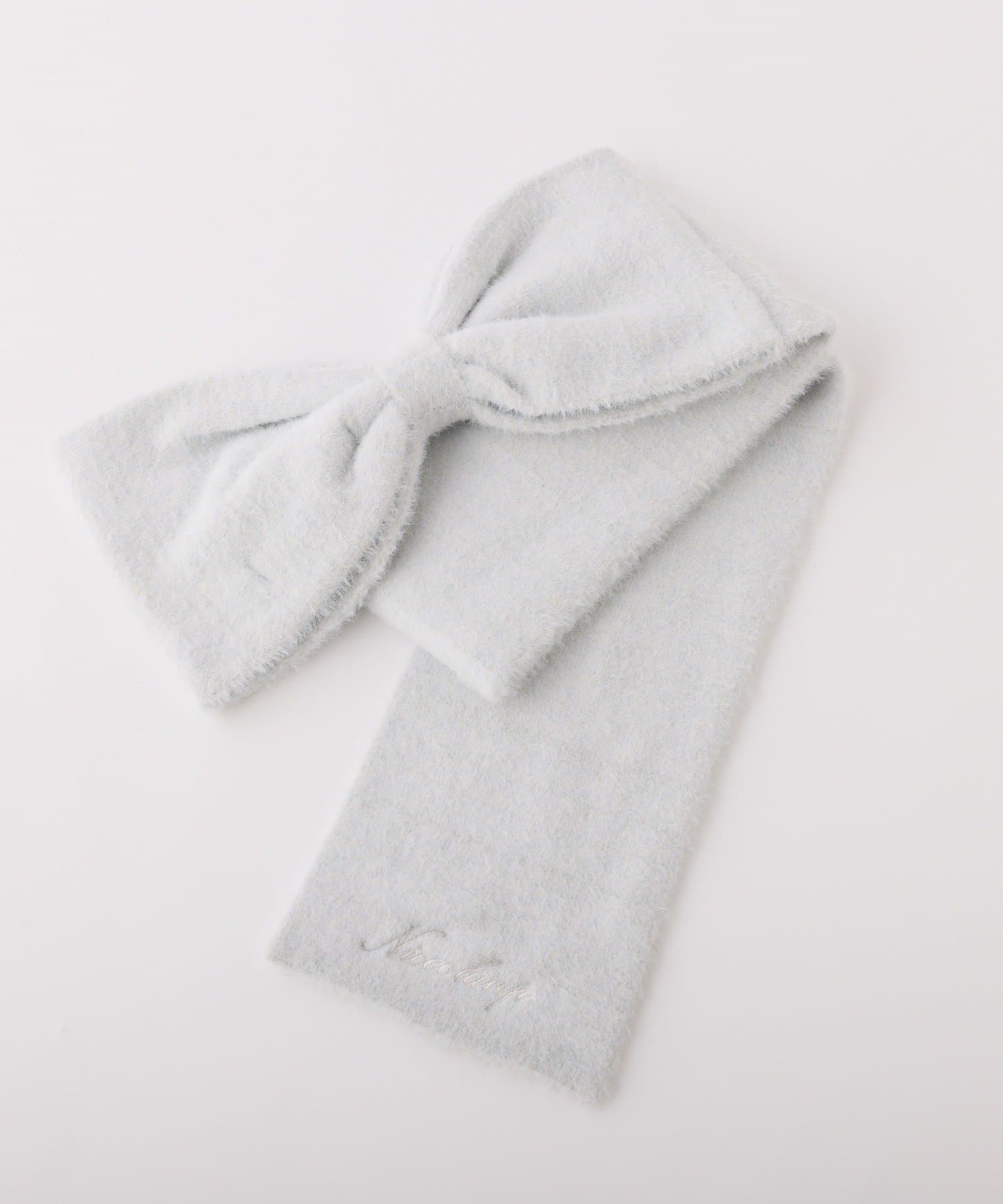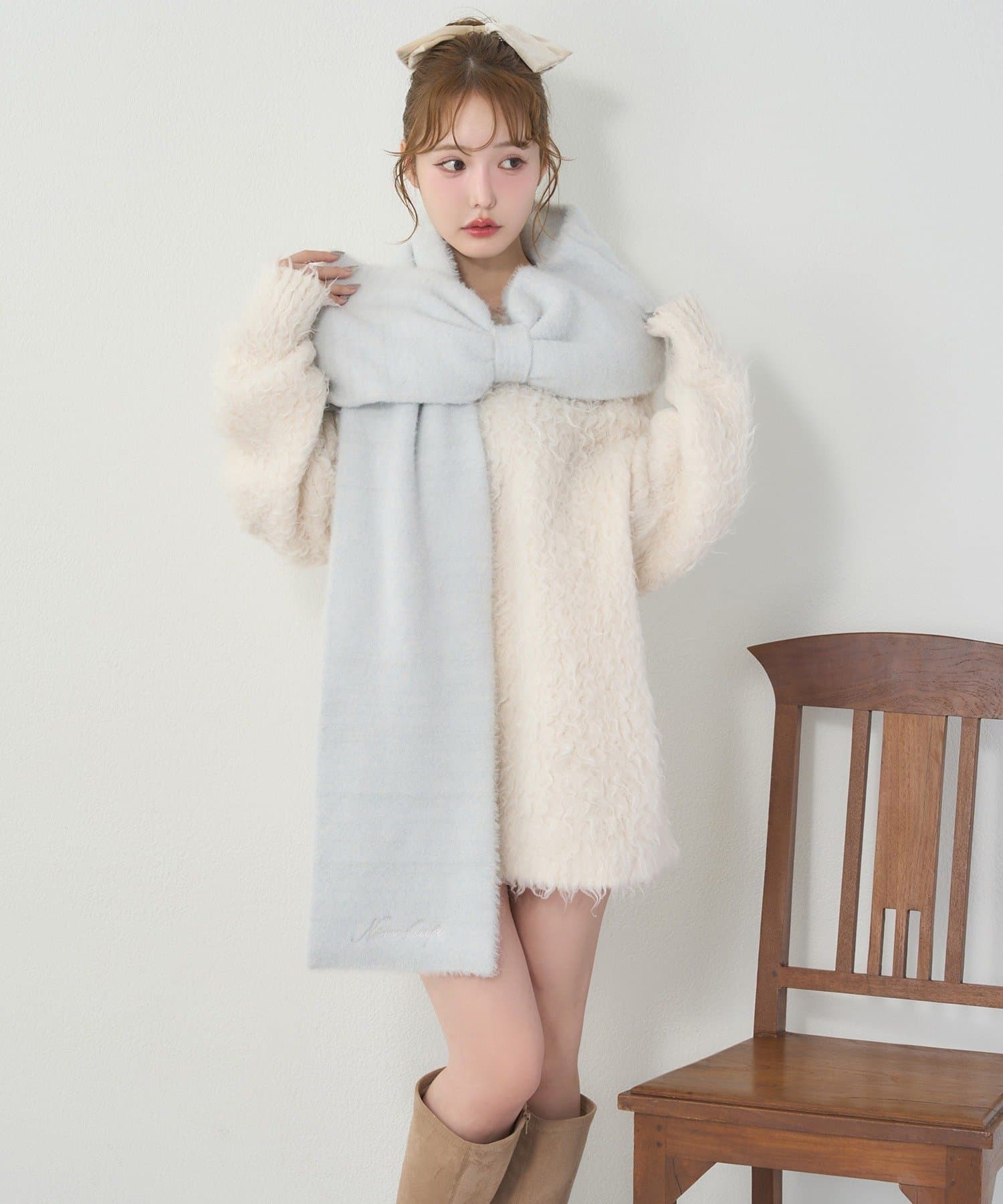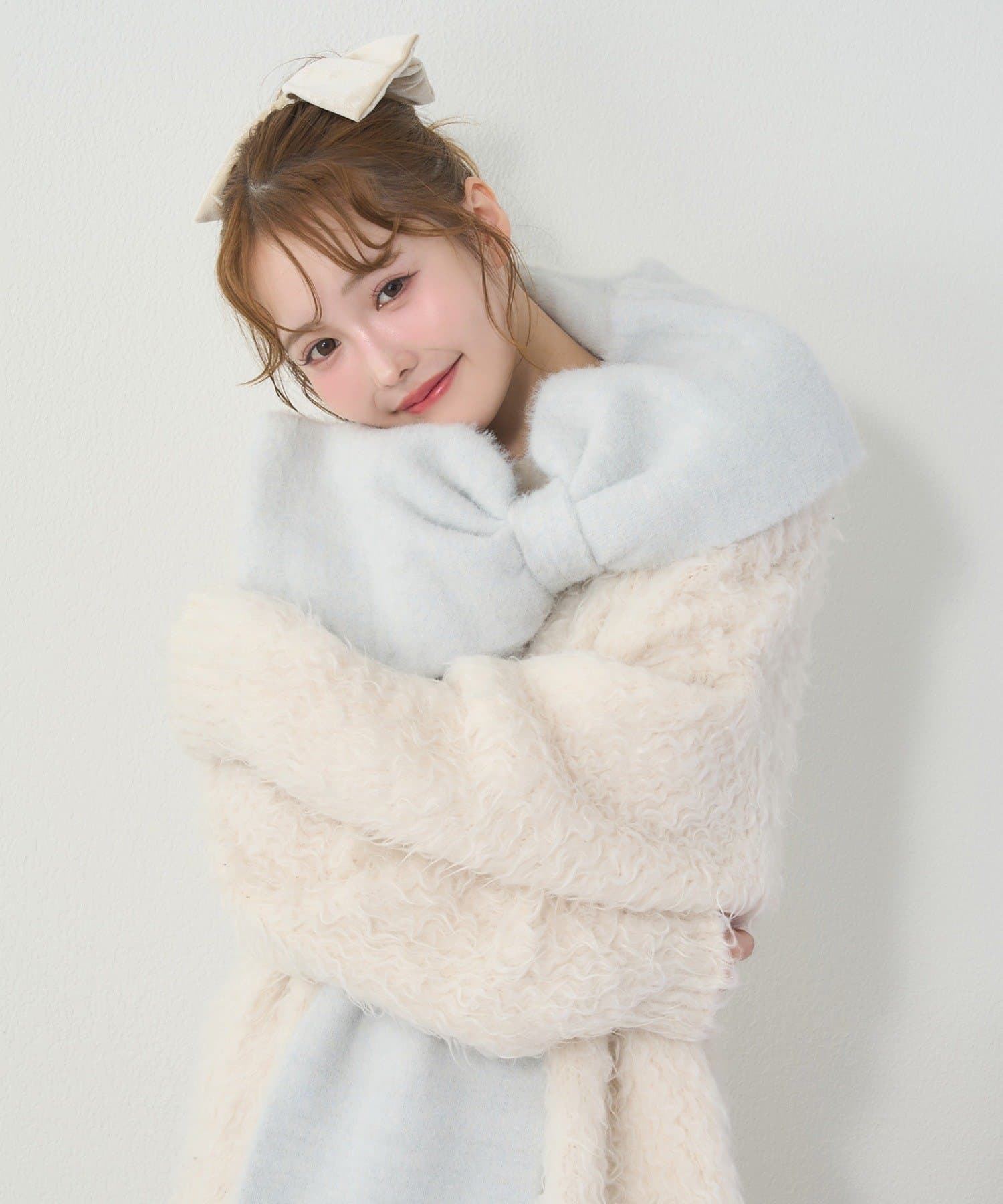 首元に巻くだけで大きなリボンが完成するマフラー。