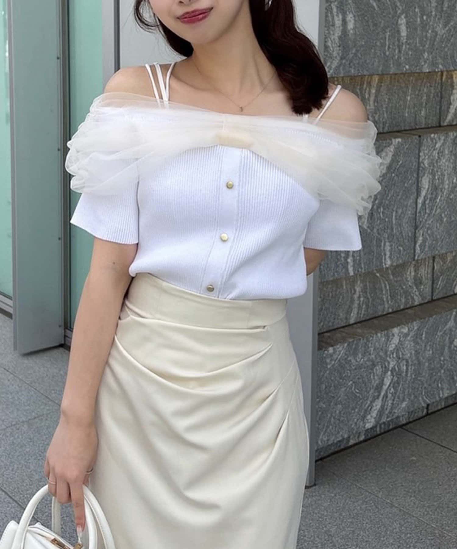 コンパクトなリブニットやカーディガンを合わせて王道フェミニンに♡