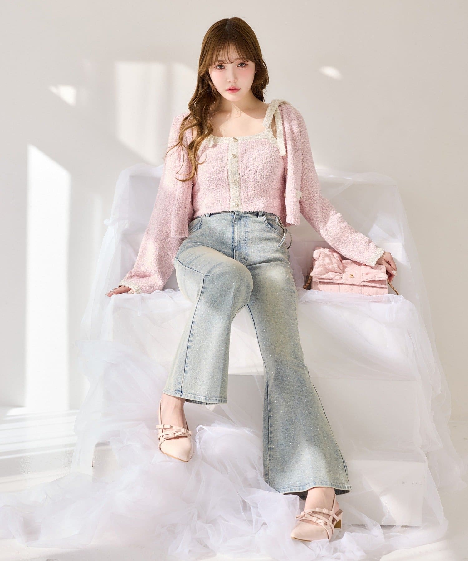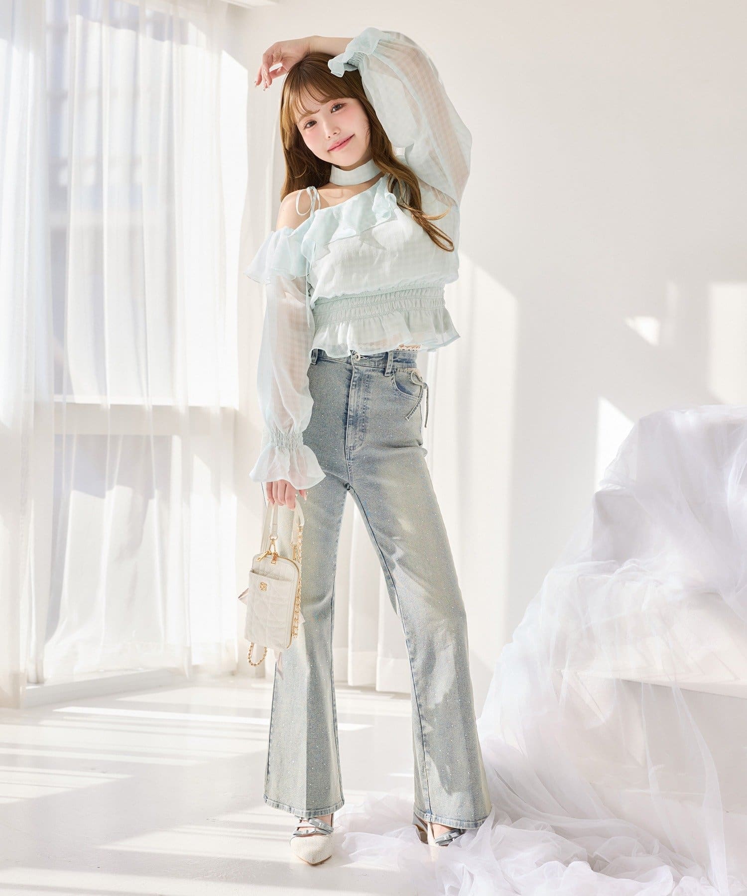シアーシャツやショート丈カーディガンを羽織れば、大人かわいいコーデが完成◎