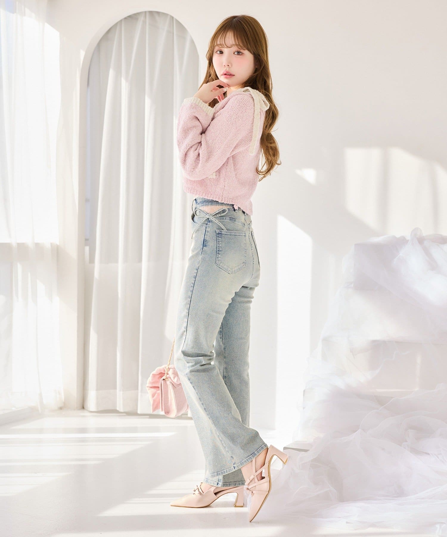 ウエストサイドオープンデザインで抜け感をプラスしつつ、リボンディテールでガーリーなアクセントをON。