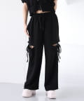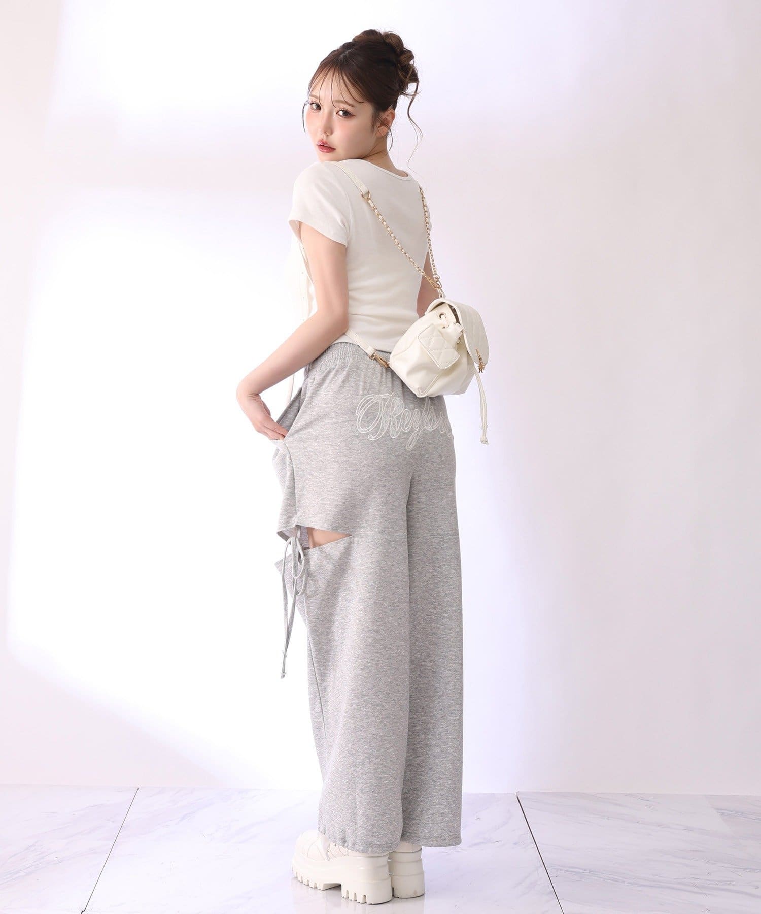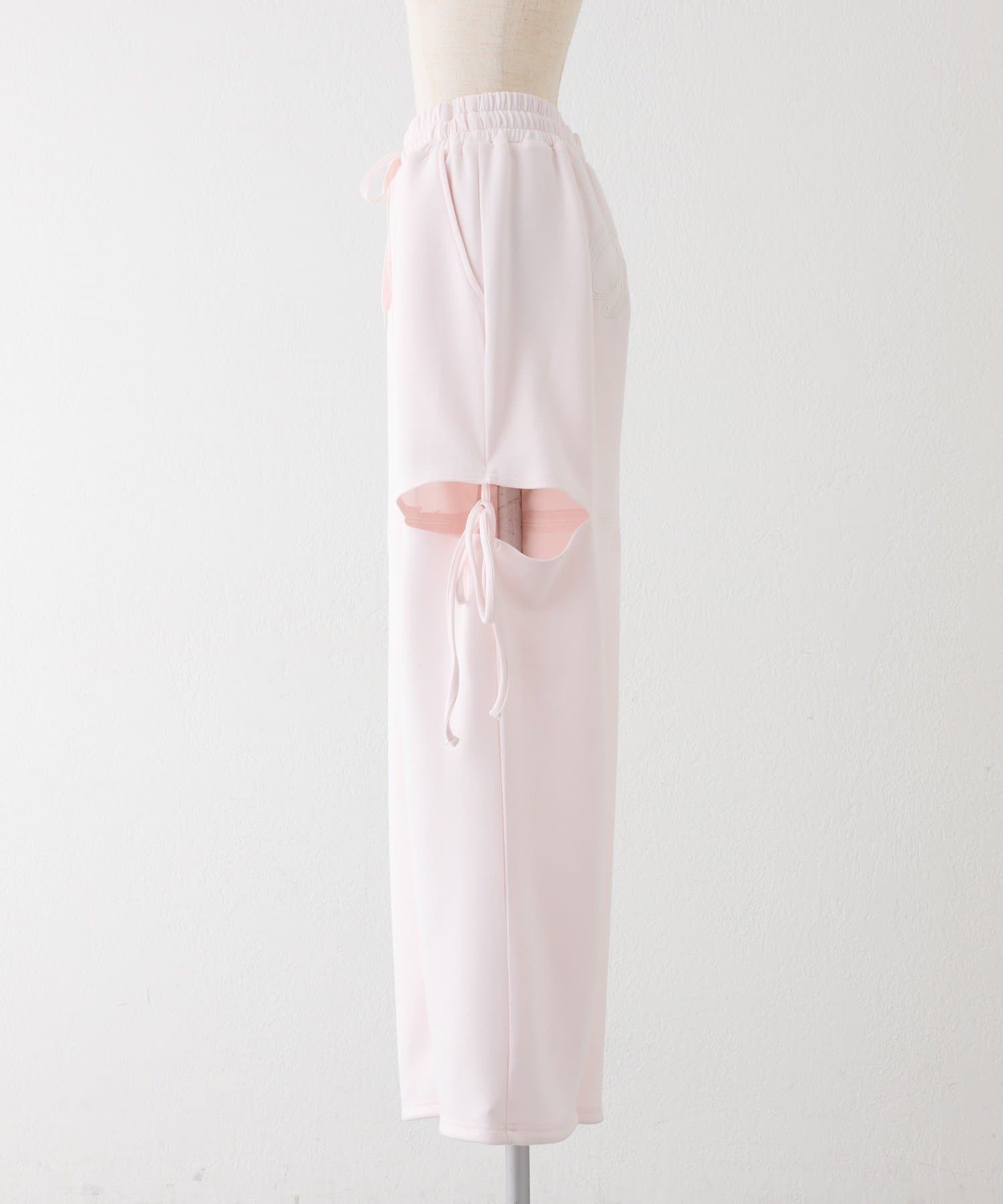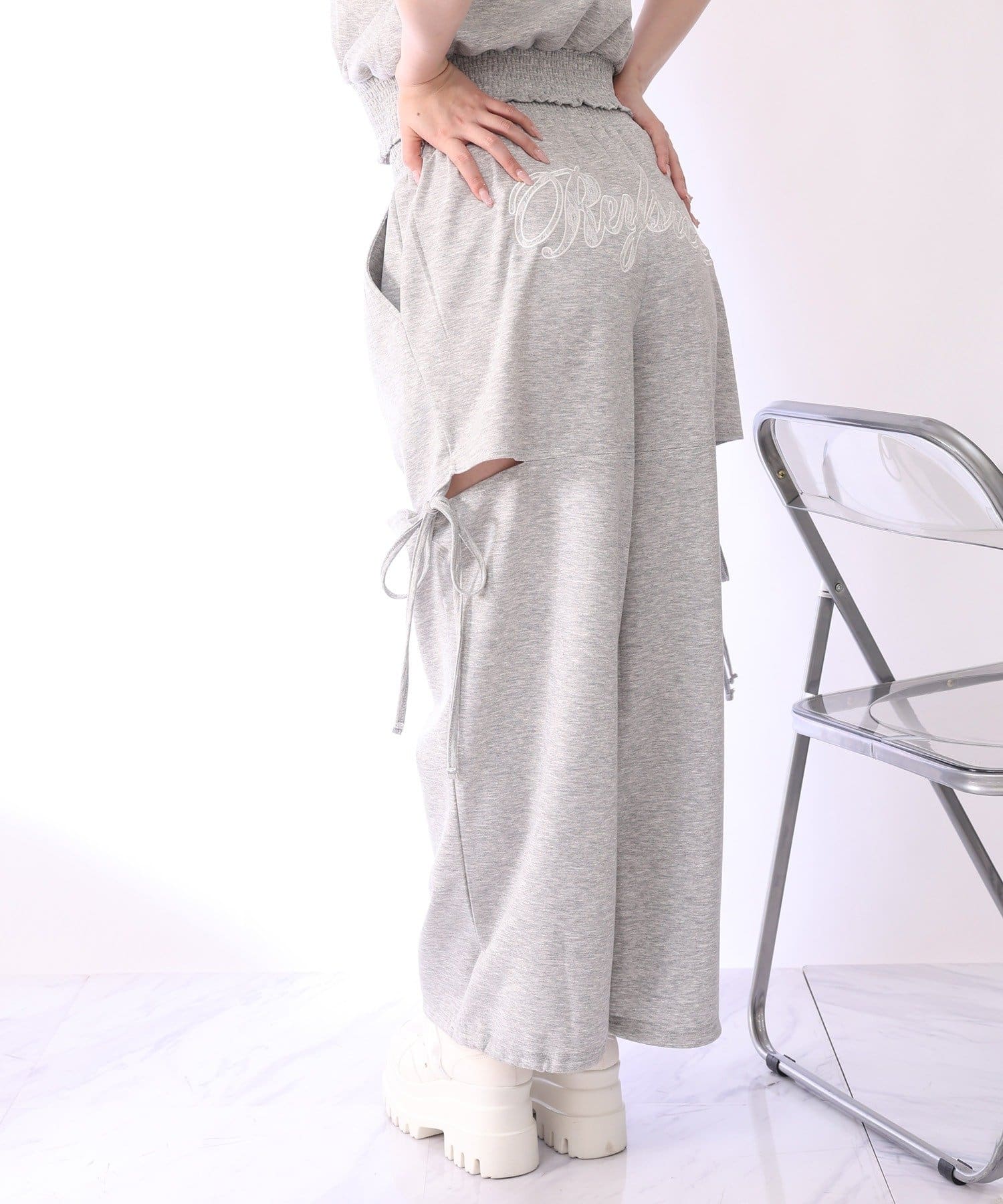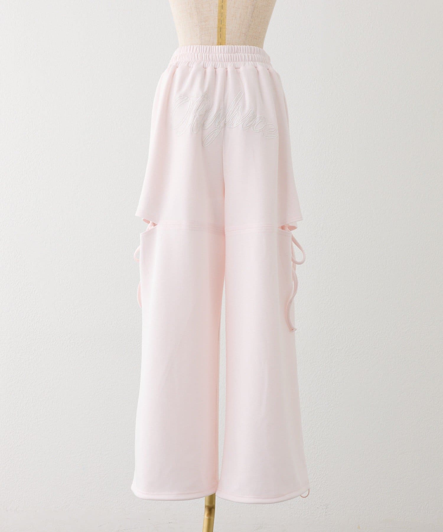 サイドスリットにリボンデザインをあしらったカット素材のパンツ。