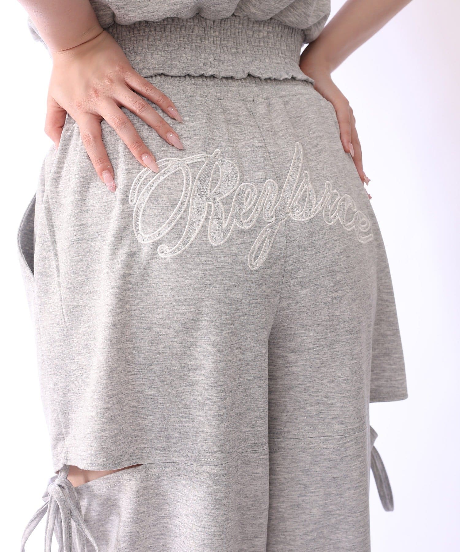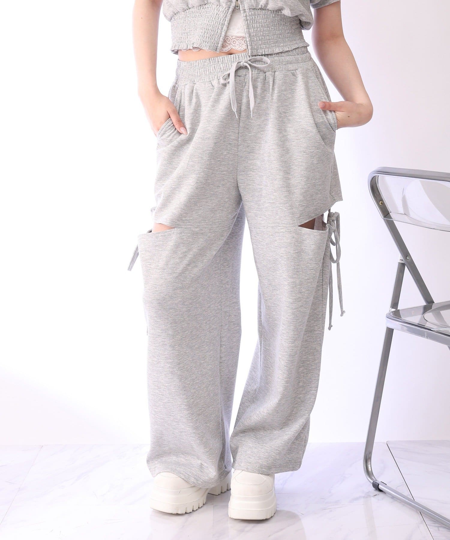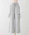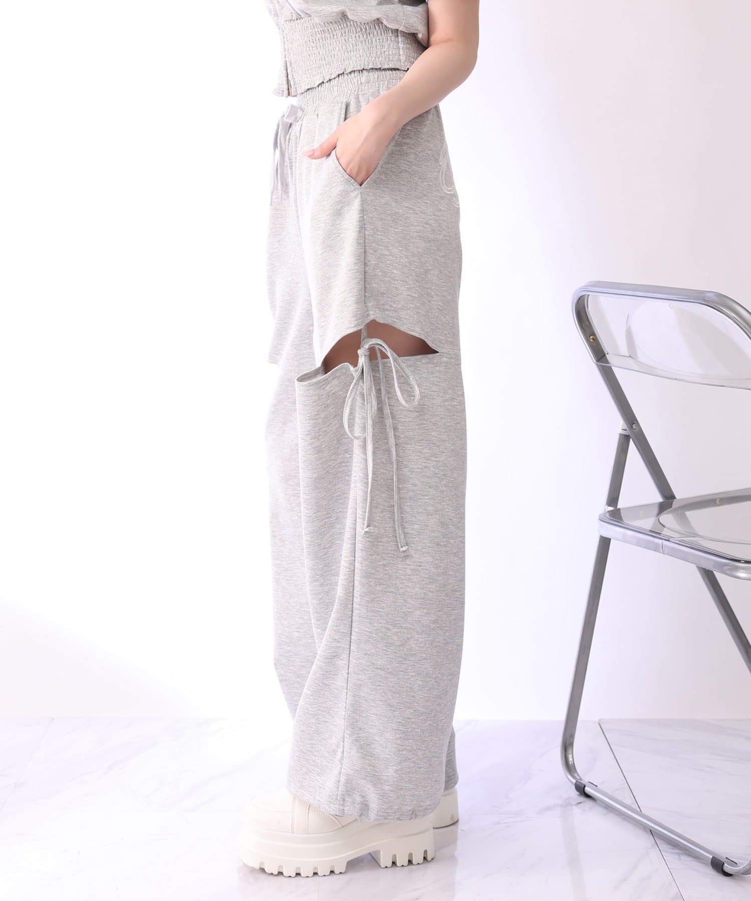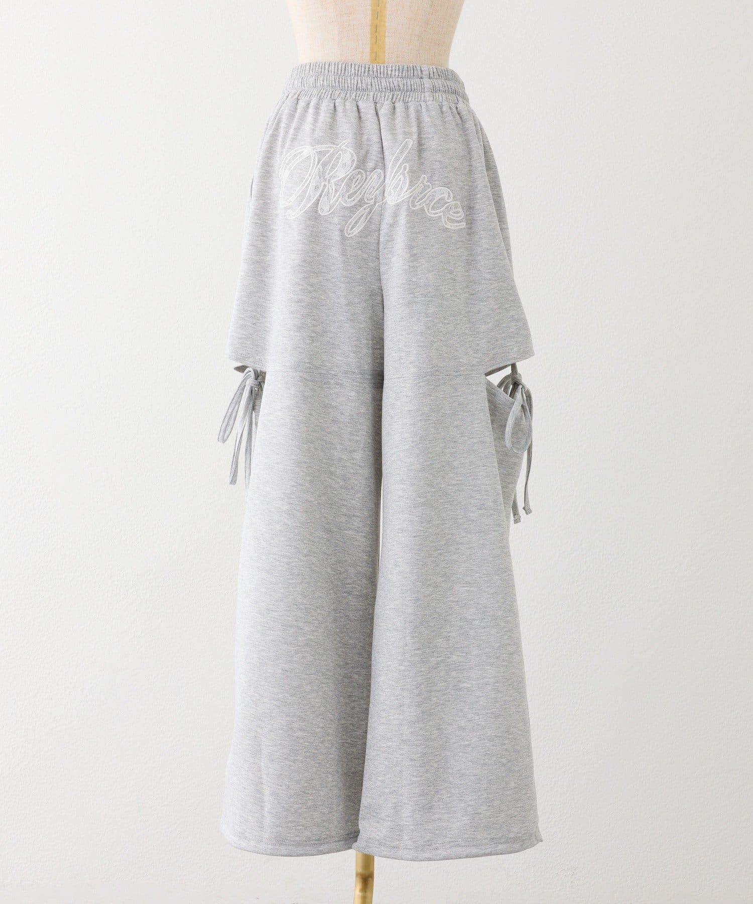 サイドスリットにリボンデザインをあしらったカット素材のパンツ。