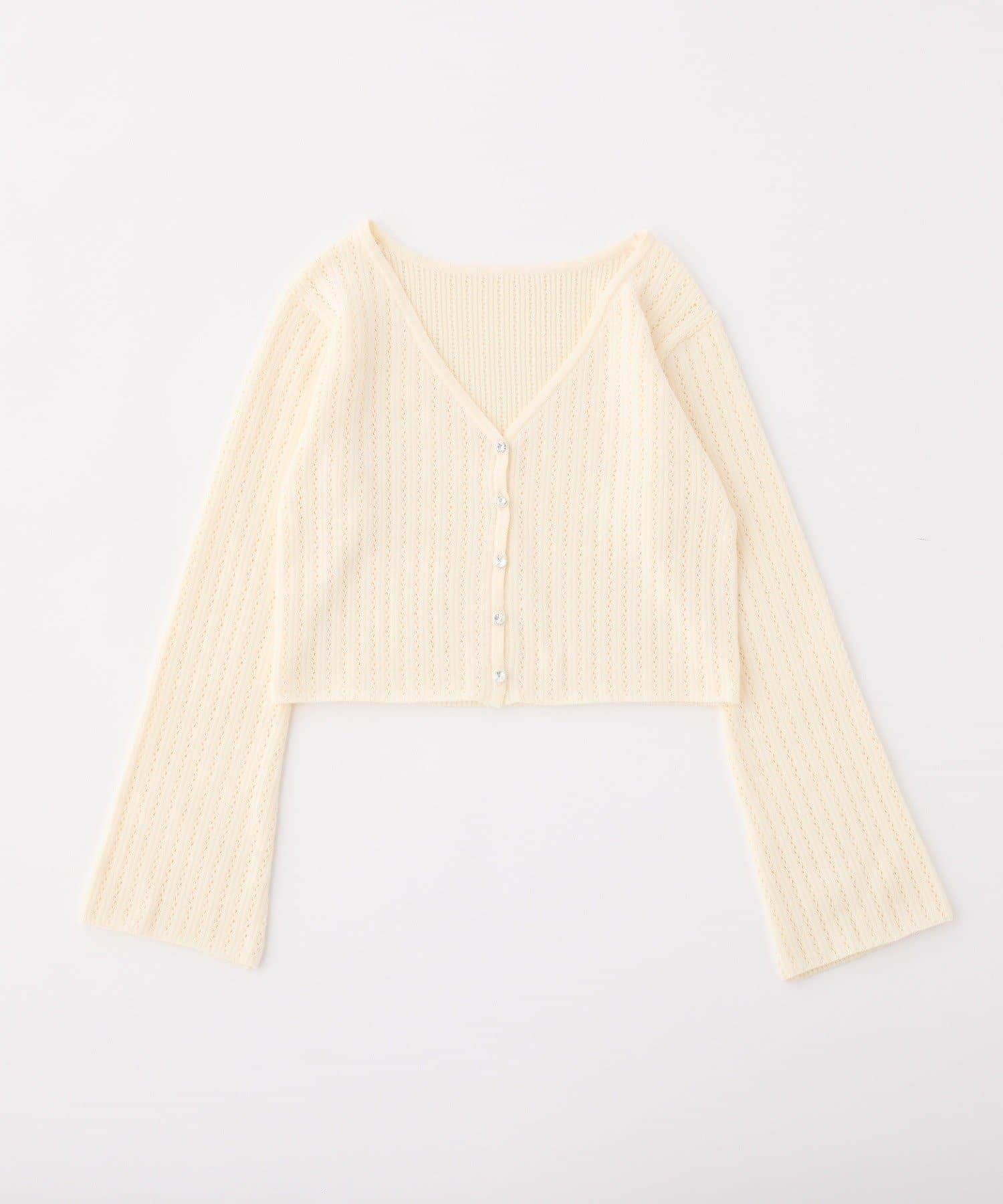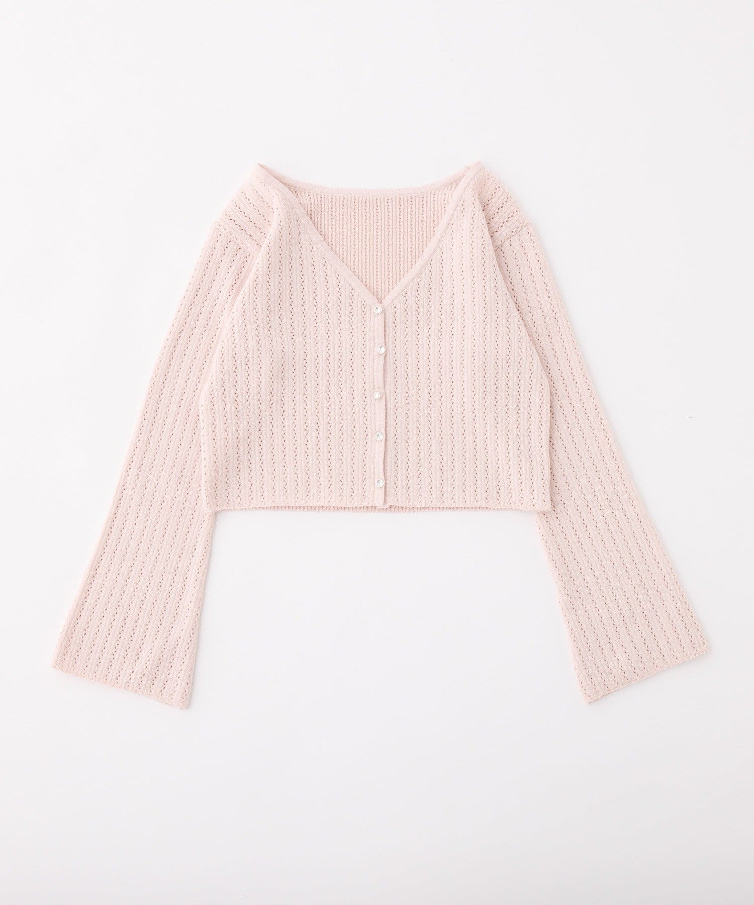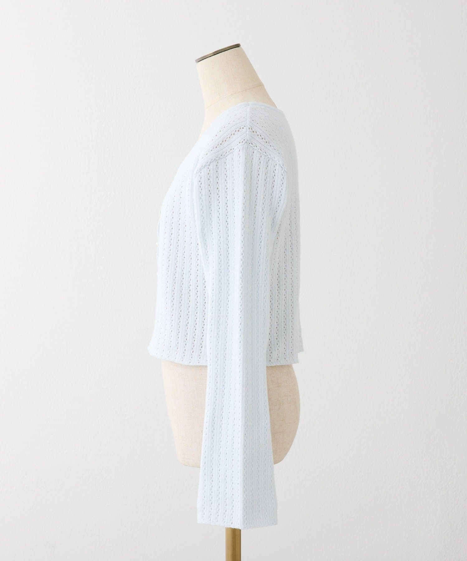 アイレット編みがポイントのベルスリーブショートカーディガン。