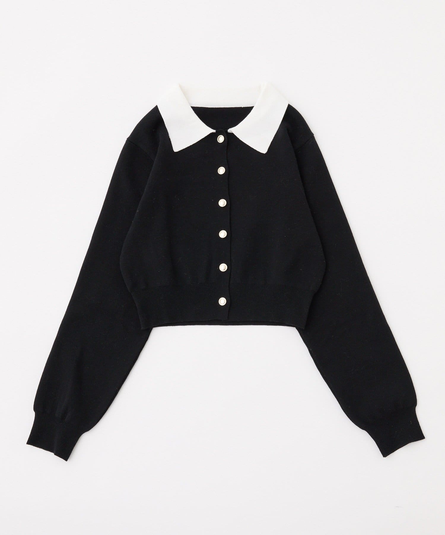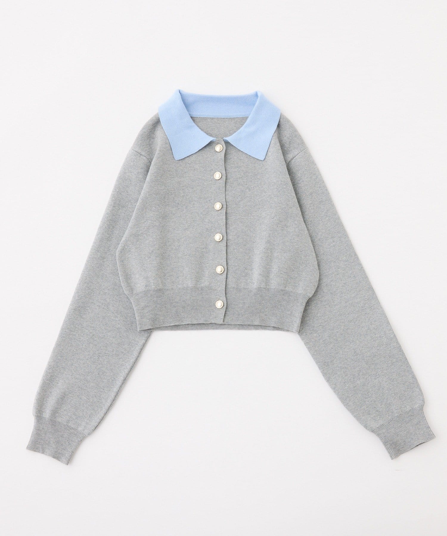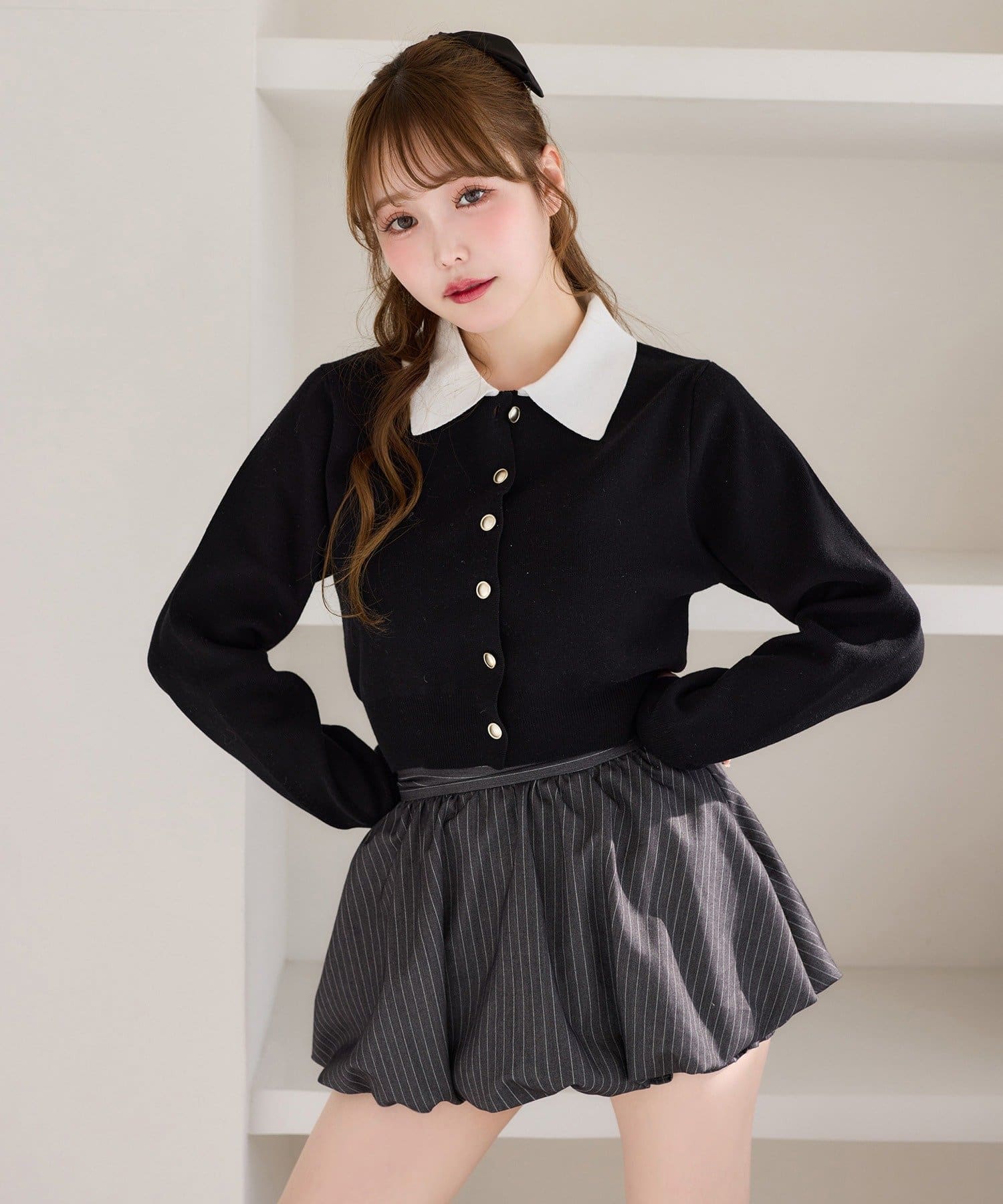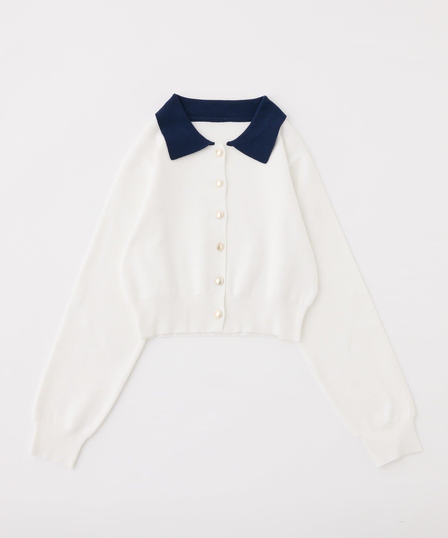 配色襟と、フロントに金ボタンを施したカーディガン。