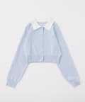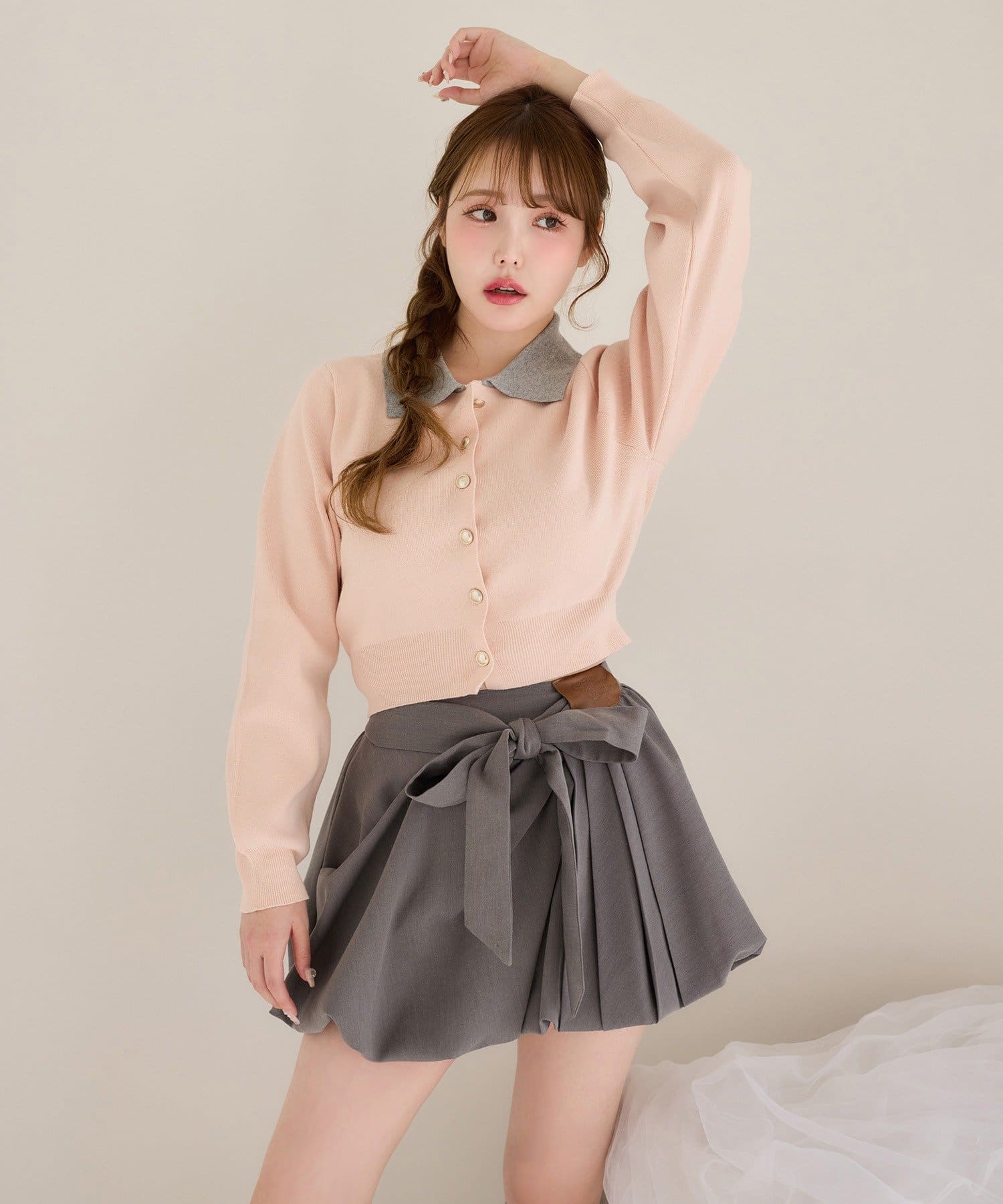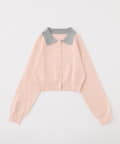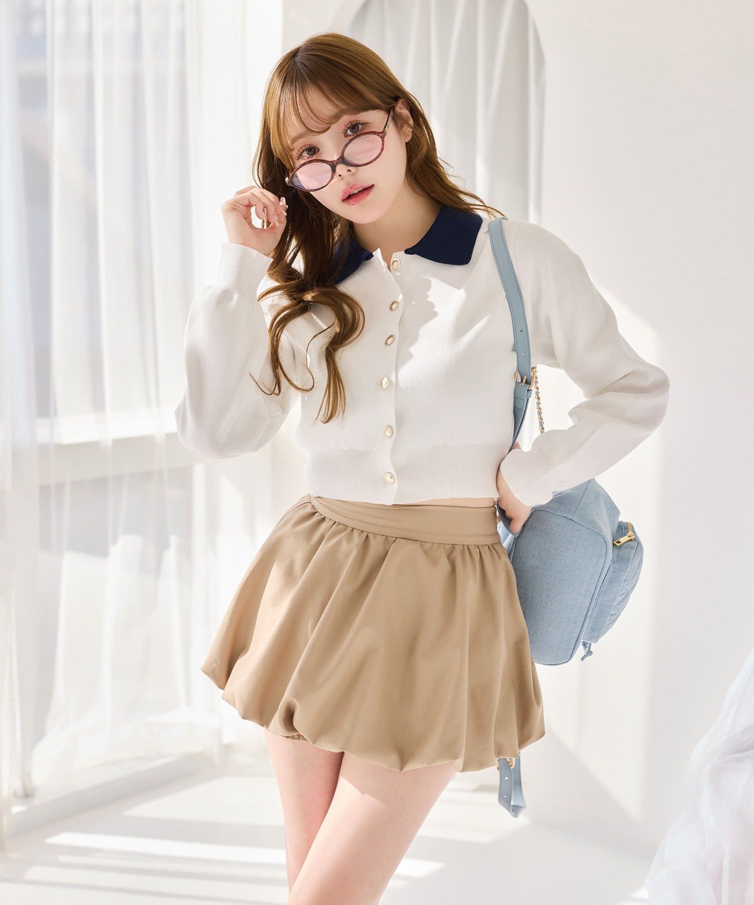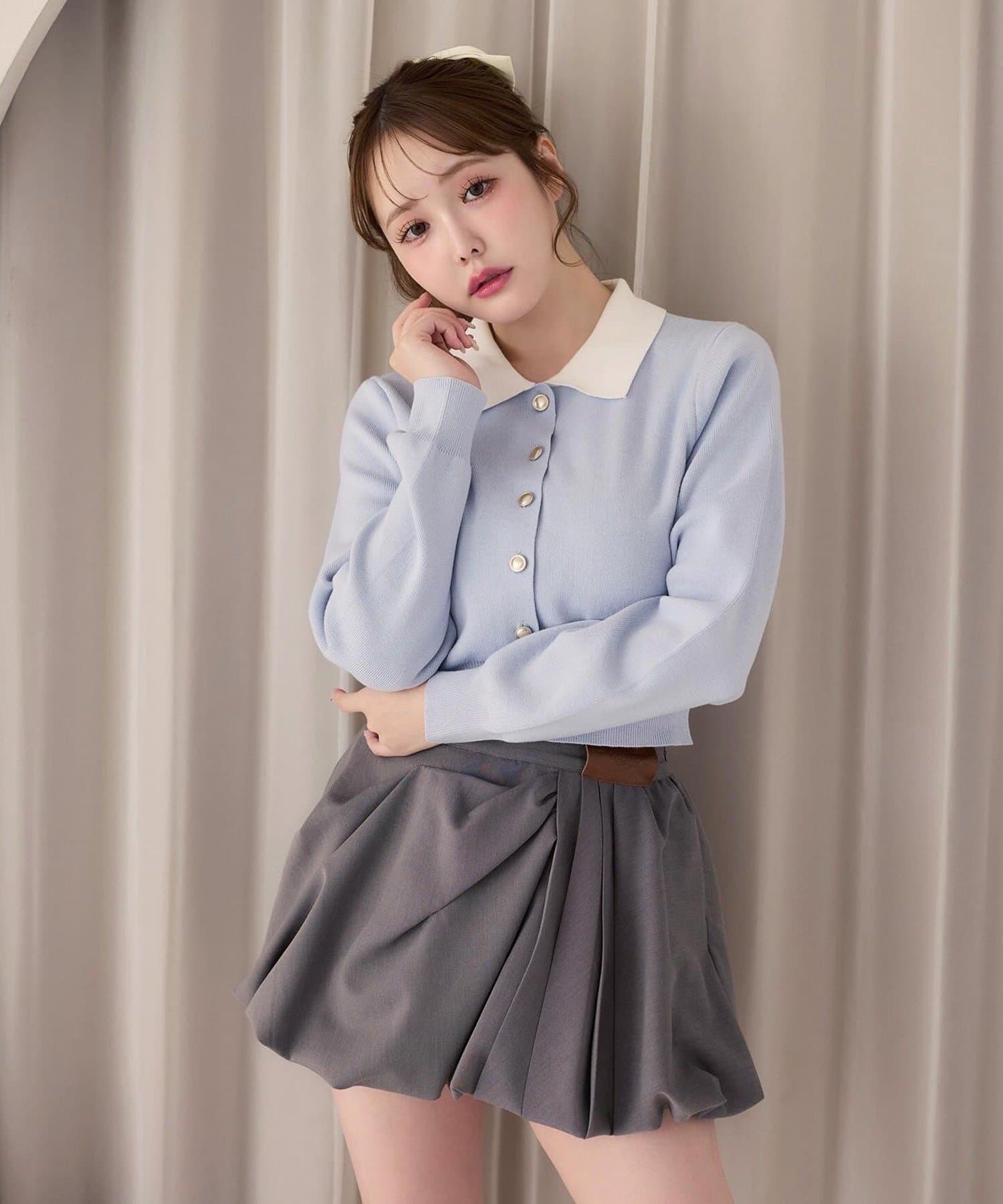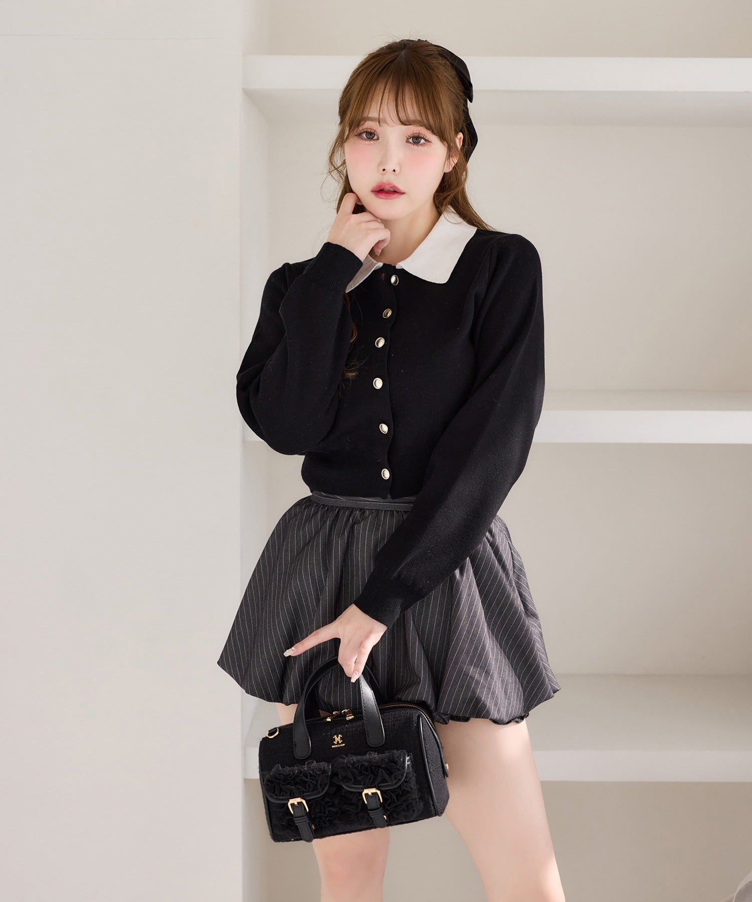 配色襟と、フロントに金ボタンを施したカーディガン。