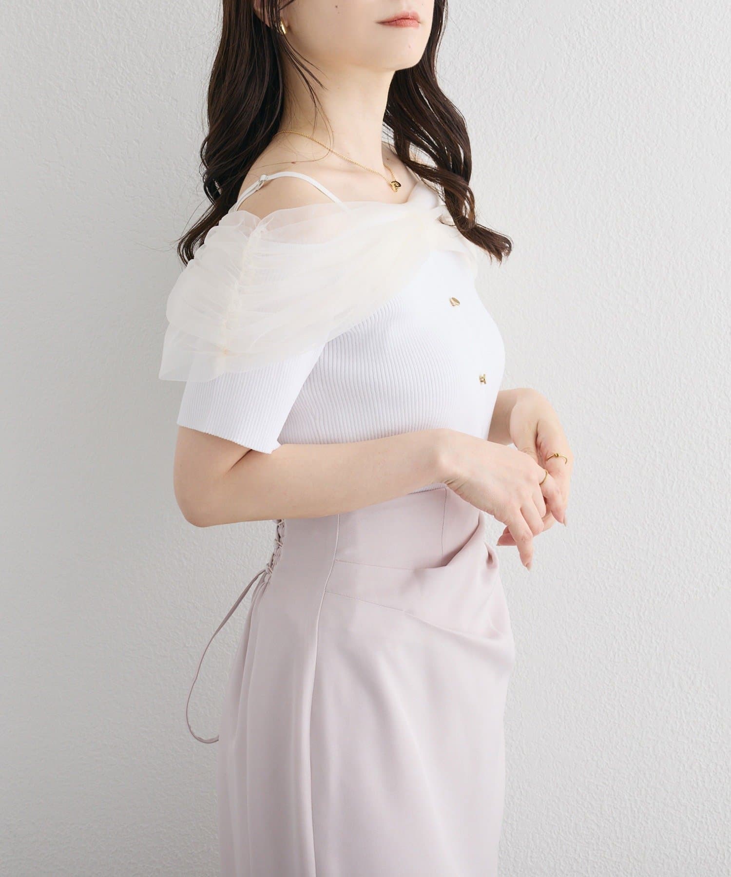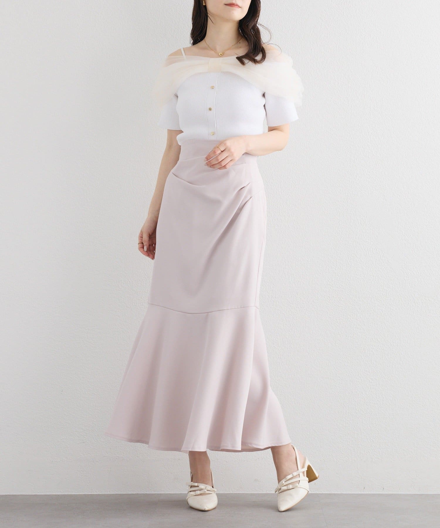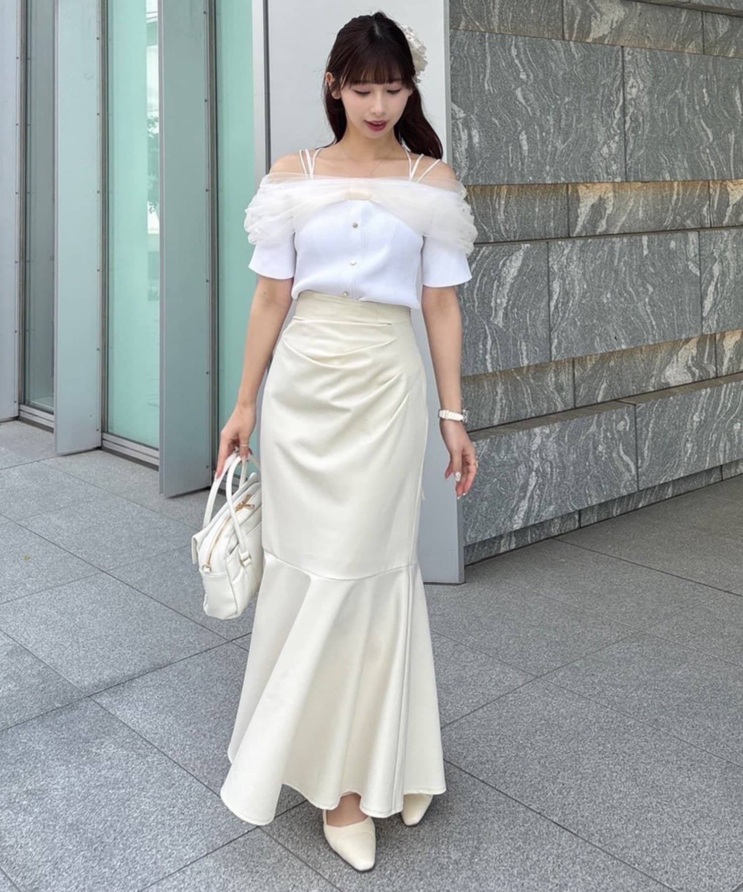 マーメイドスカートと合わせて大人フェミニンな着こなしもおすすめです。