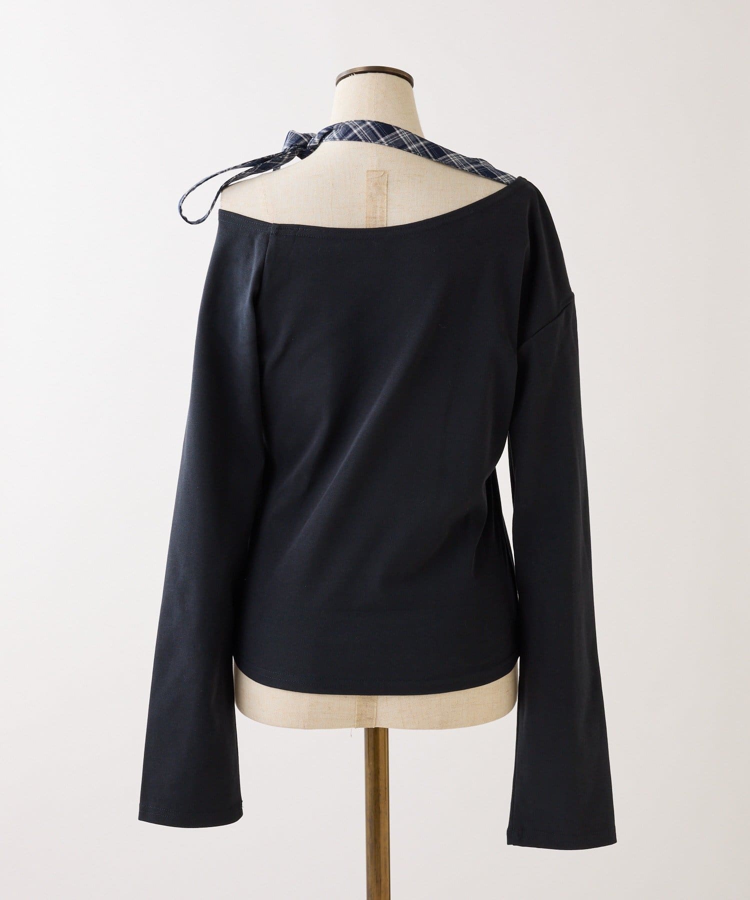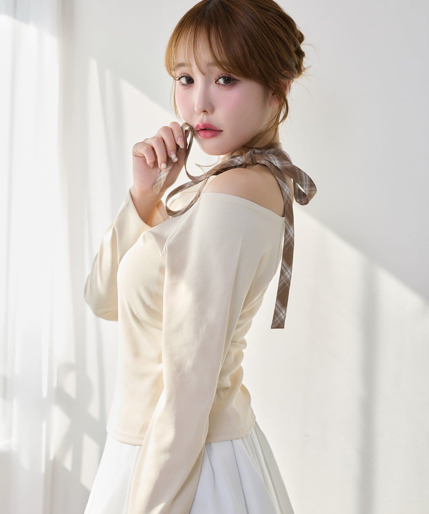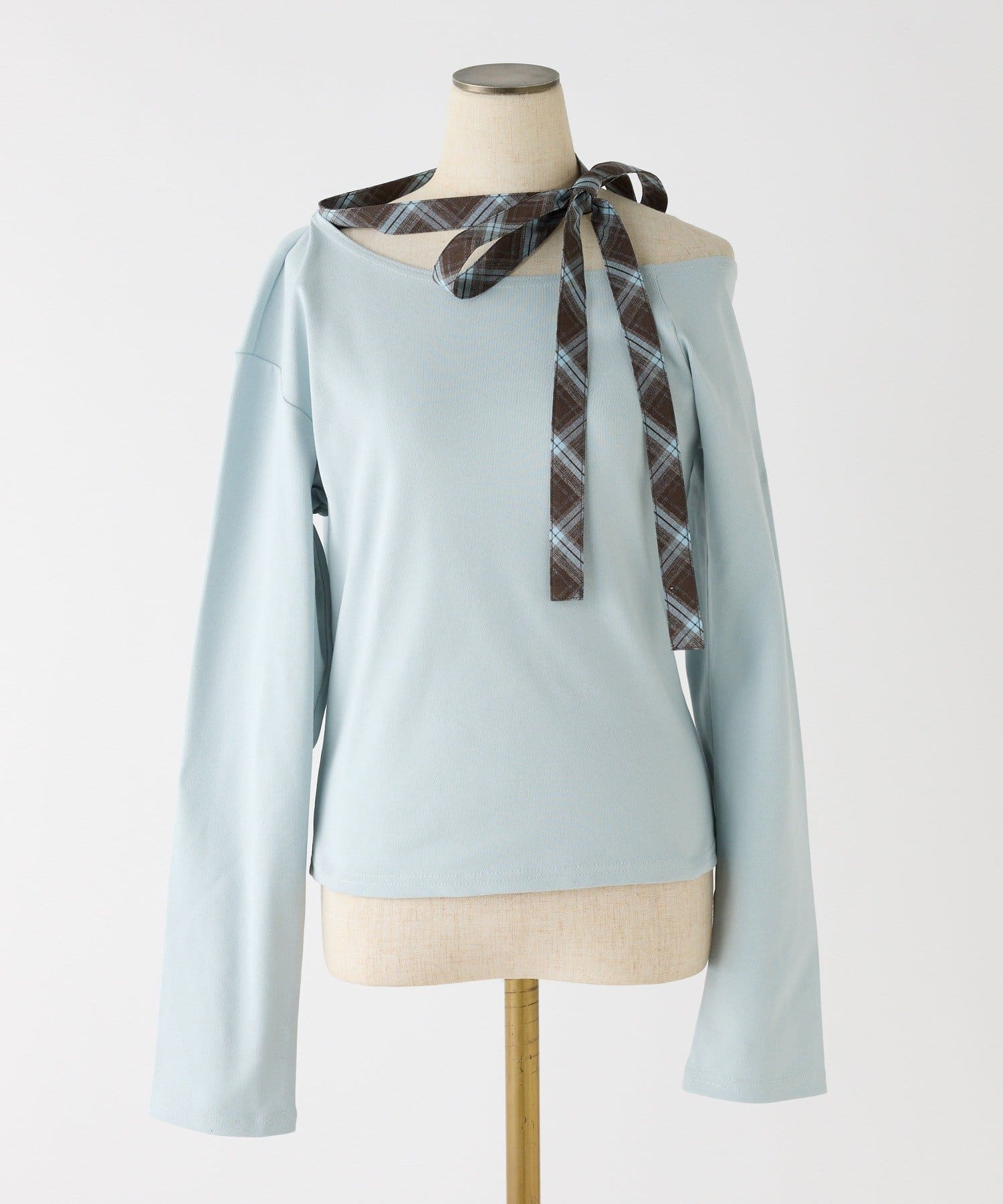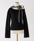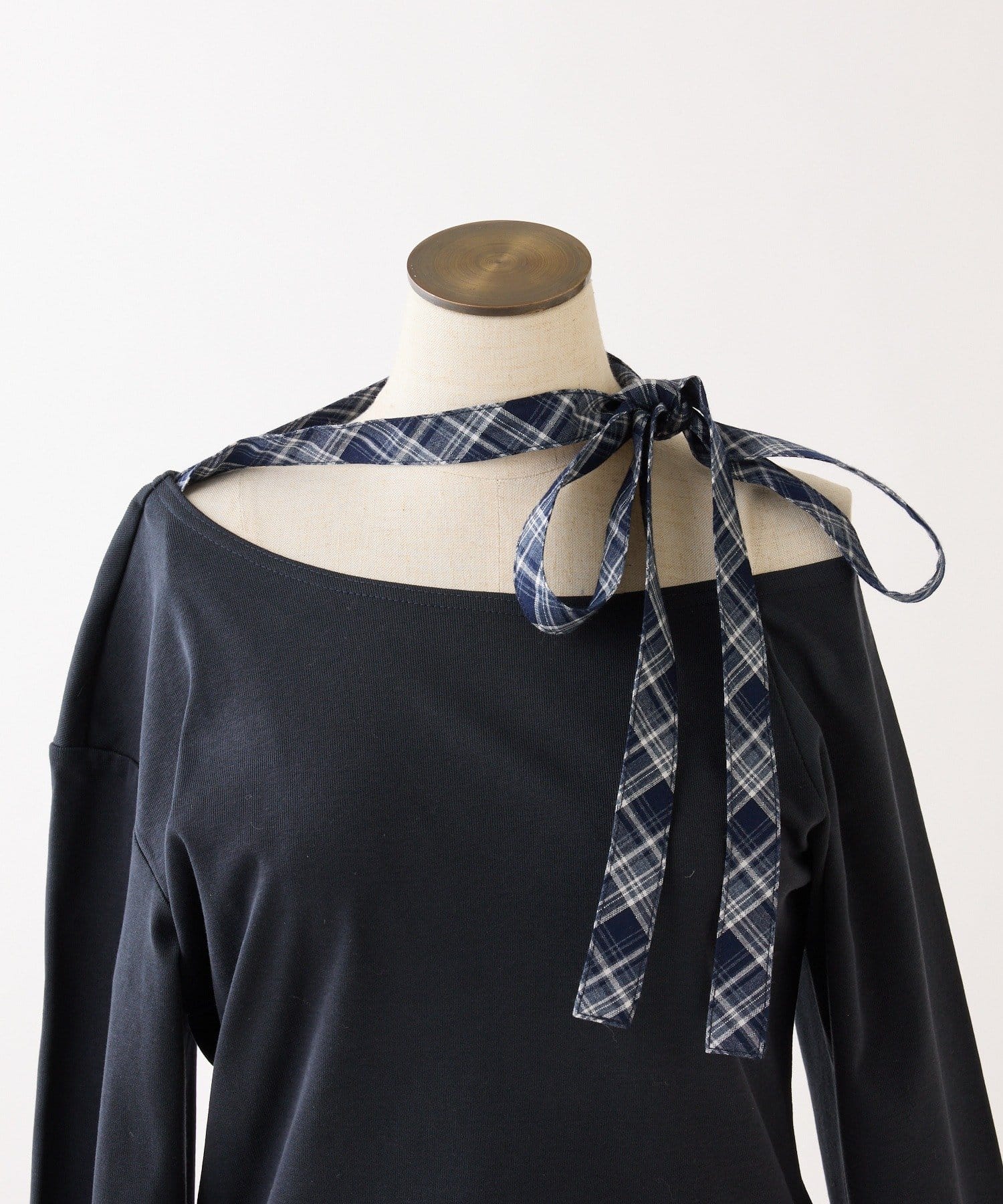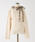 首元に異素材のリボンをあしらった、上品さとかわいさを兼ね備えたカットソー。