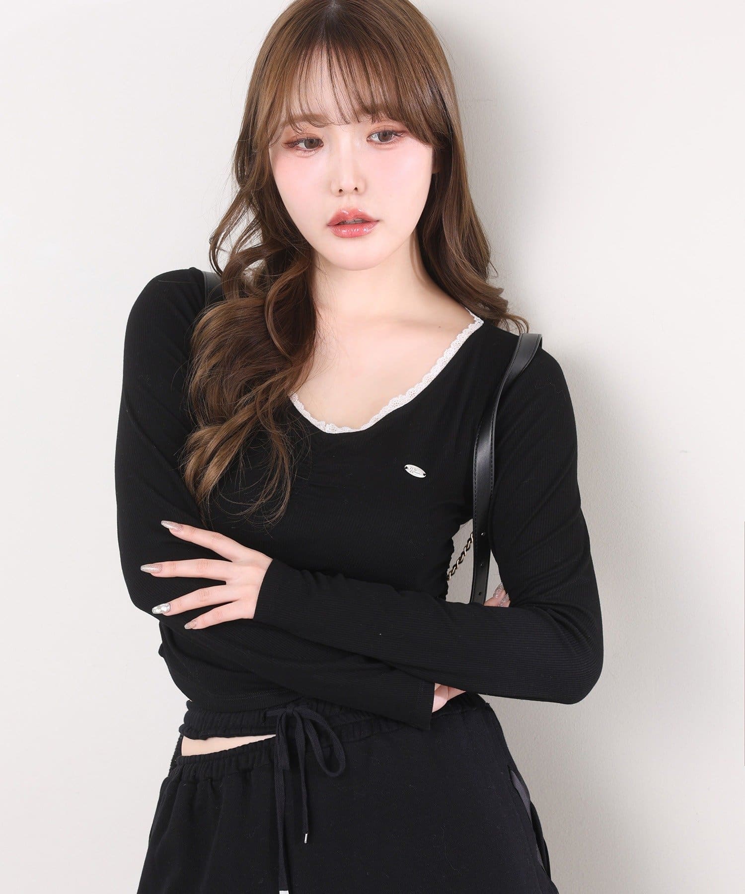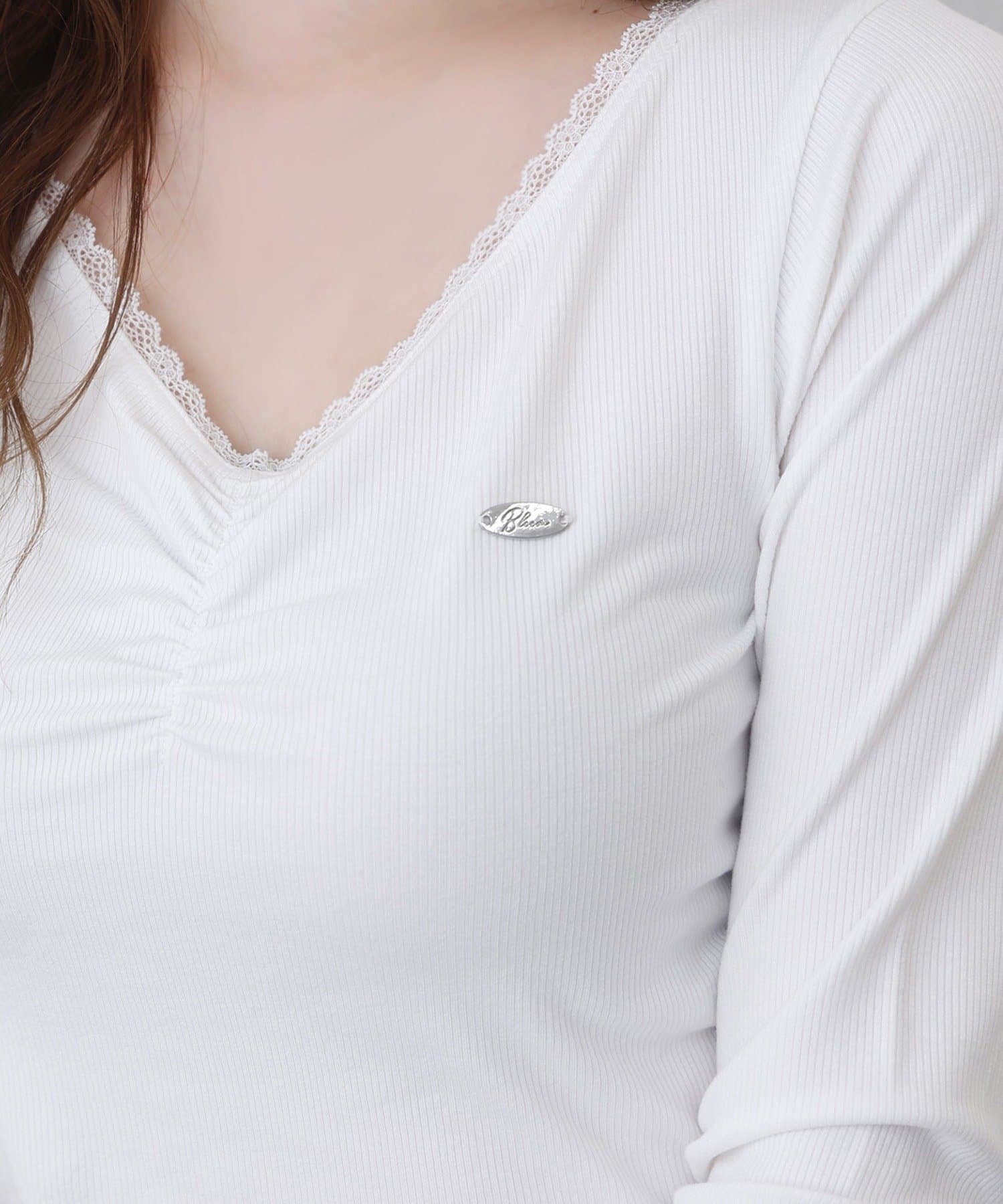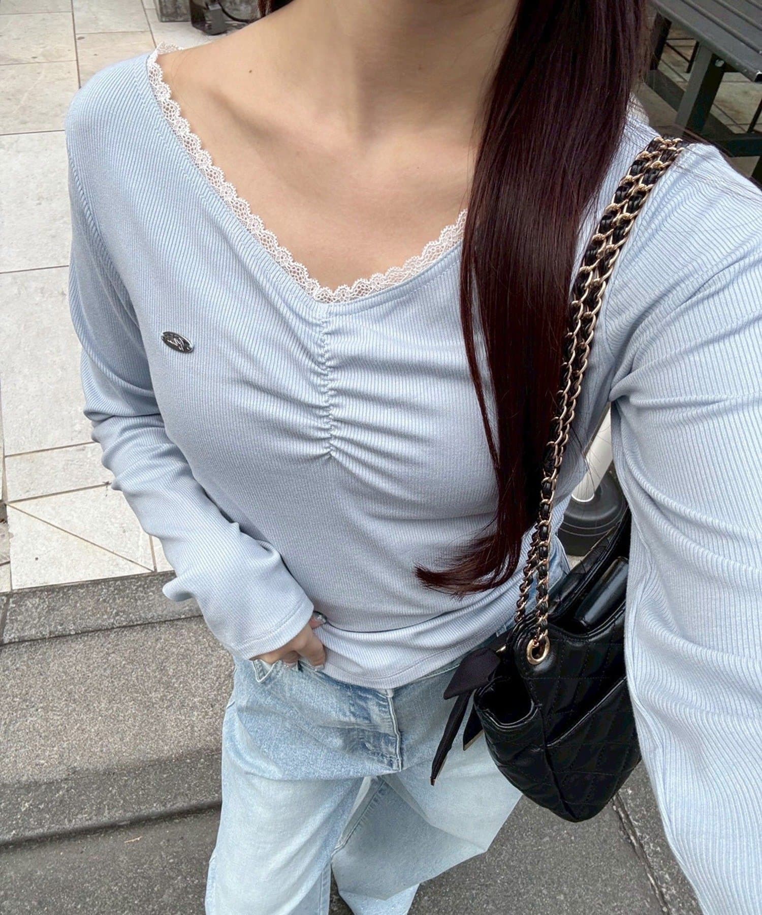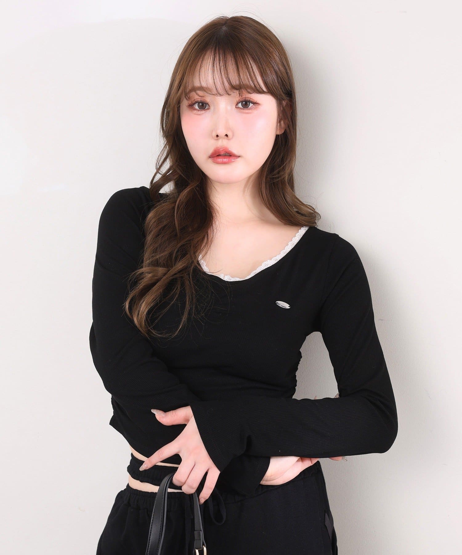 襟元にレースをあしらい、顔まわりを華やかに見せてくれる長袖カットソー。