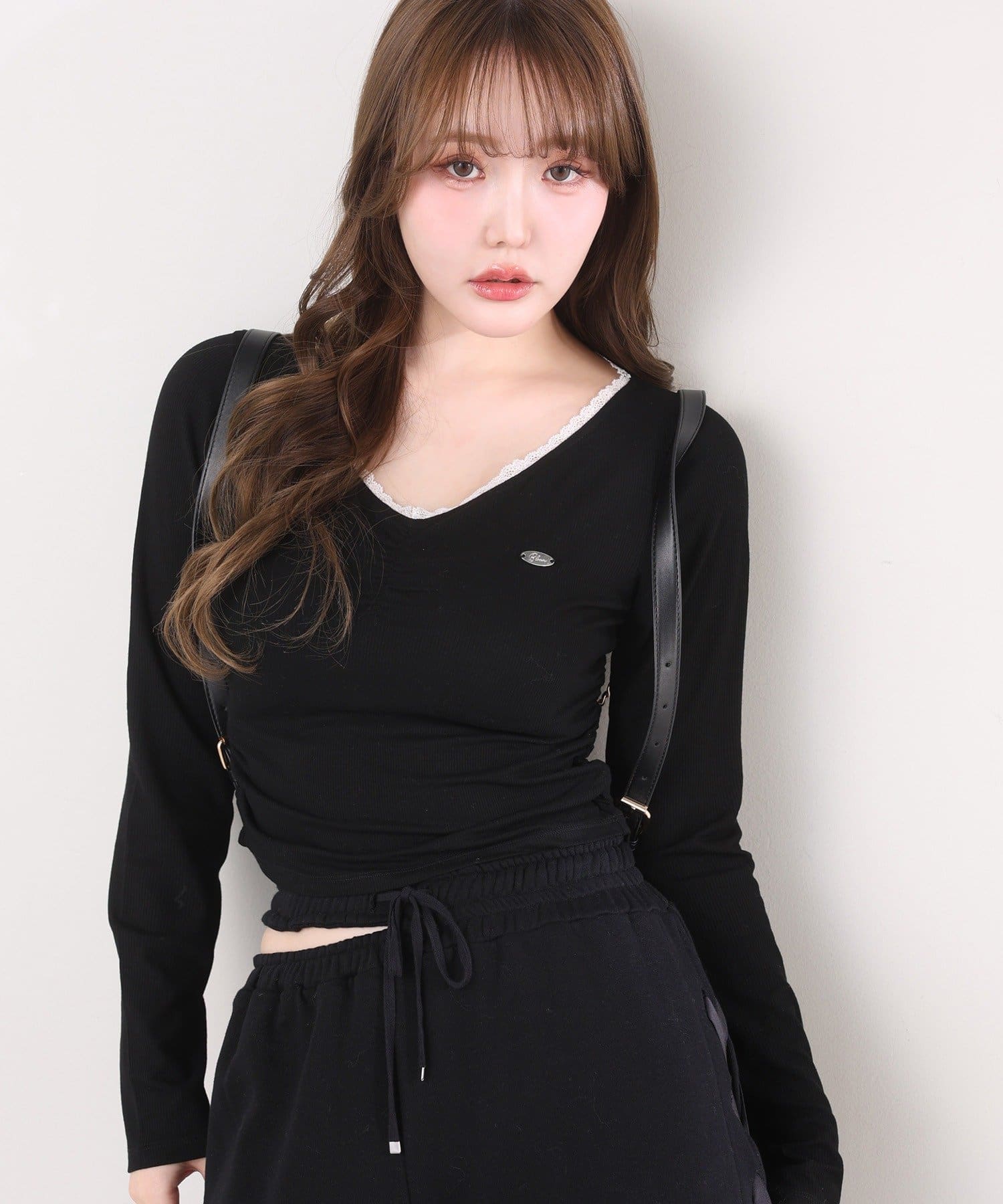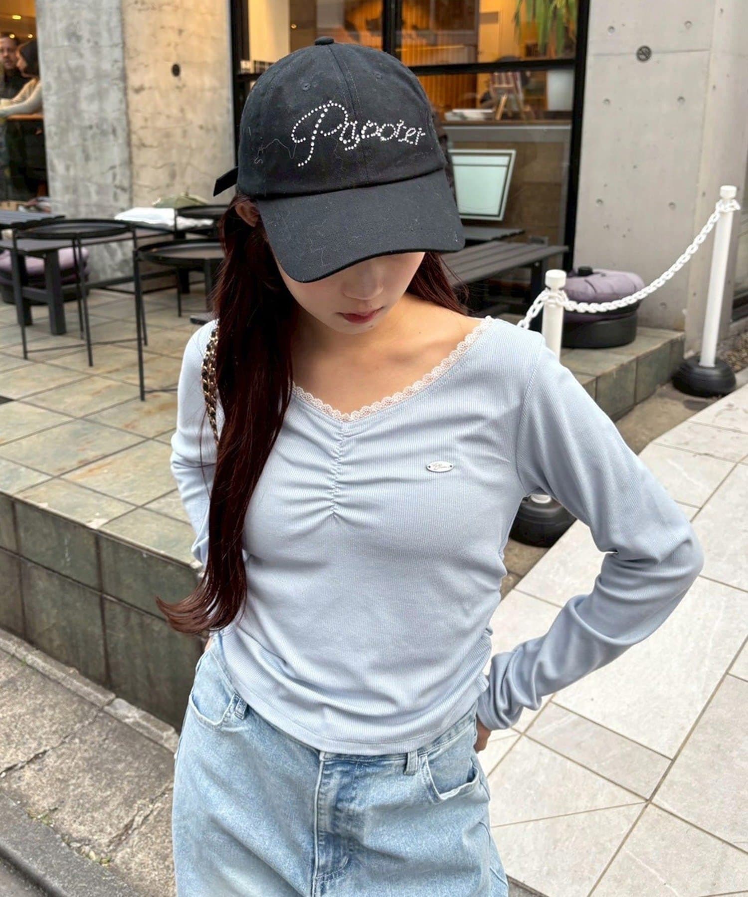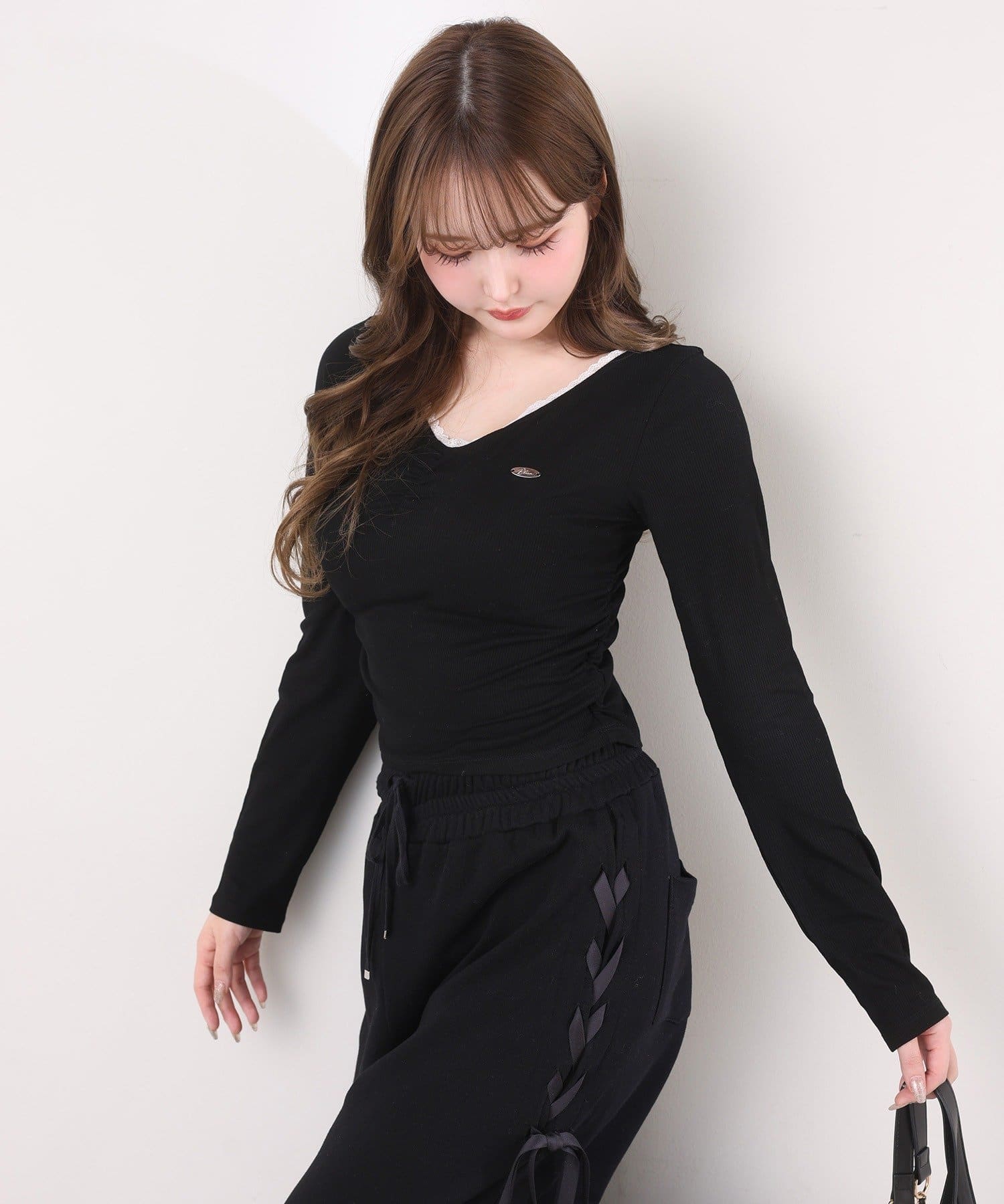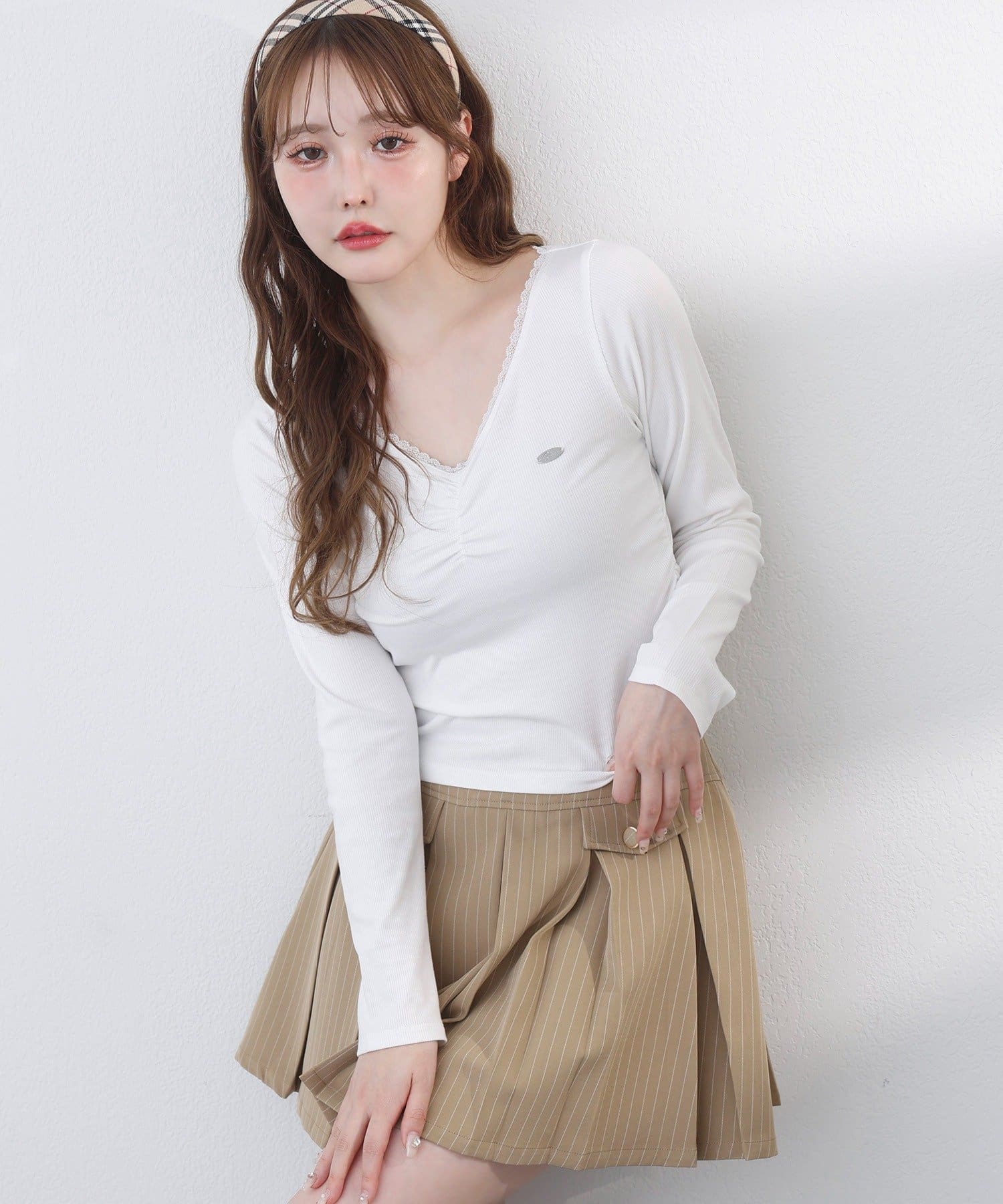 襟元にレースをあしらい、顔まわりを華やかに見せてくれる長袖カットソー。
